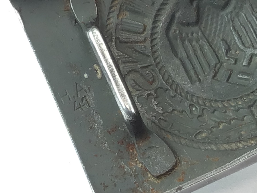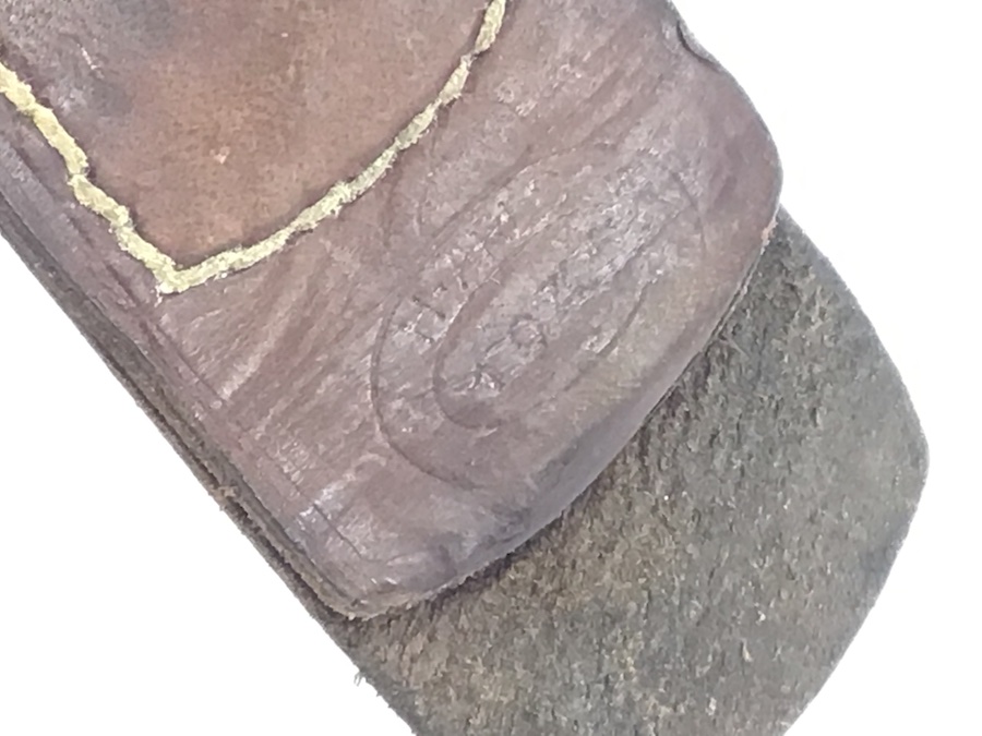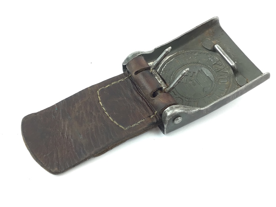 8/12/21 – Original and great condition. All steel, stamped construction buckle with leather tab. Maker stamped and dated on the tab, however, it is very faint. The interior of the buckle is stamped “H.A. 41” Small tear in the leather at the center of the claw. Stitching is tight and secure.