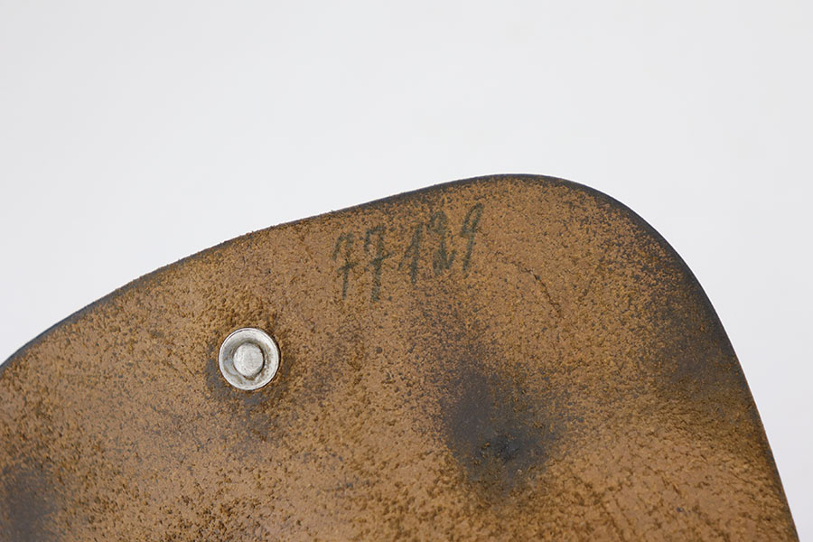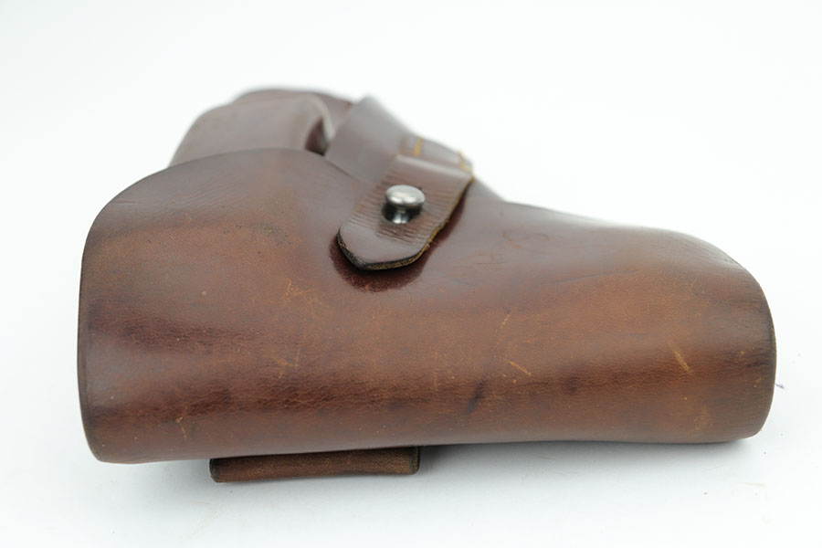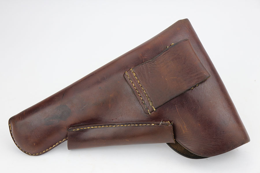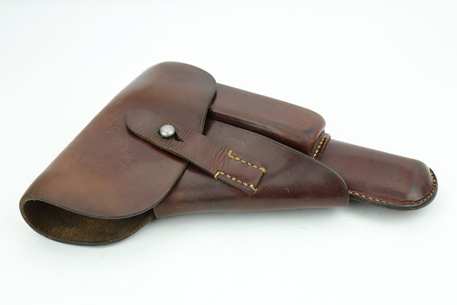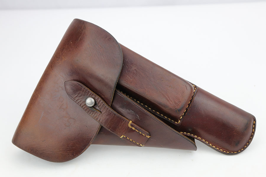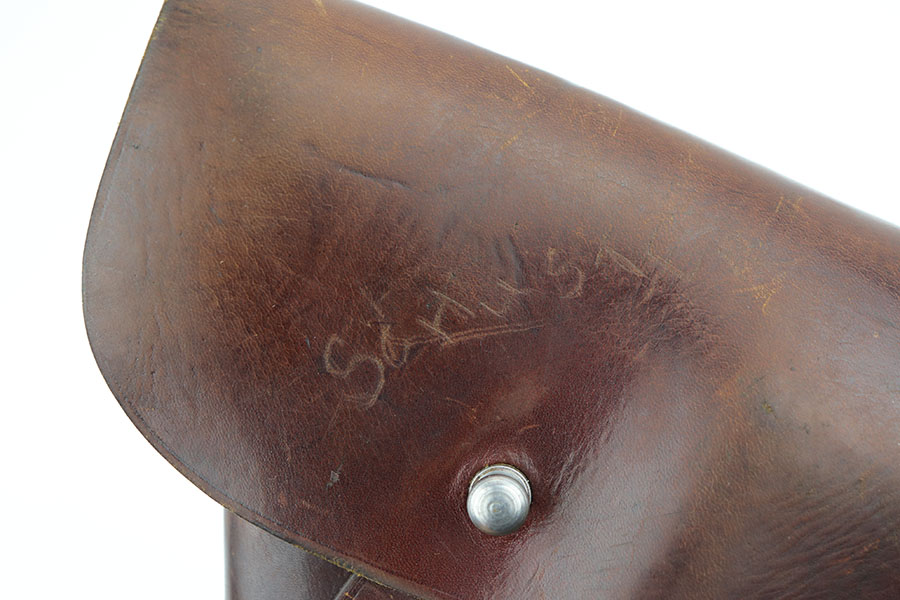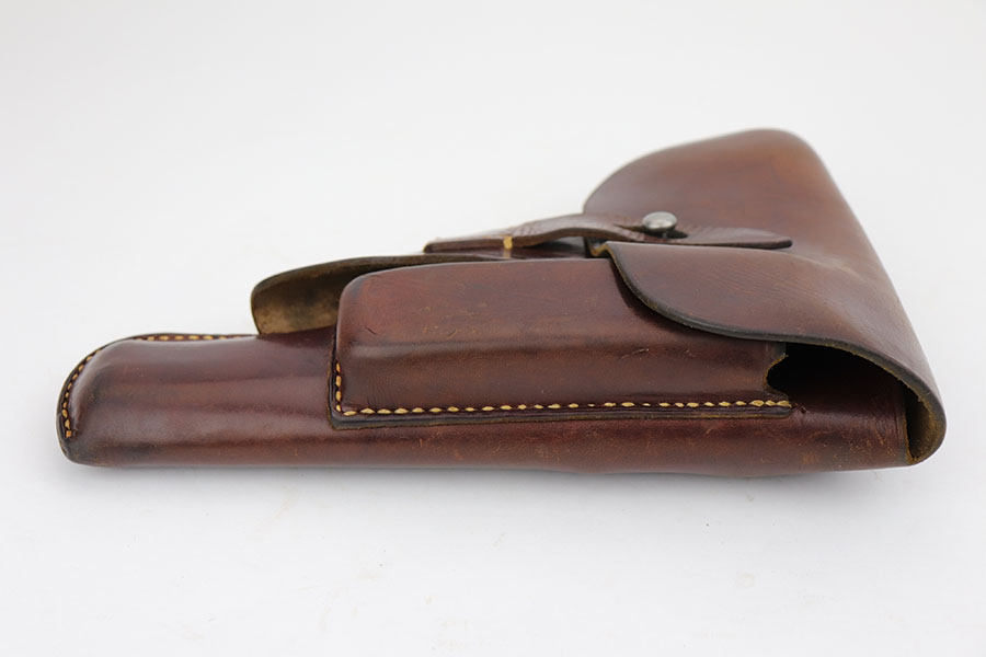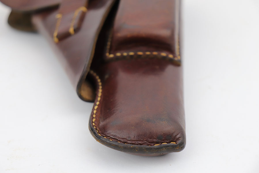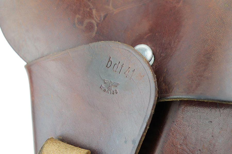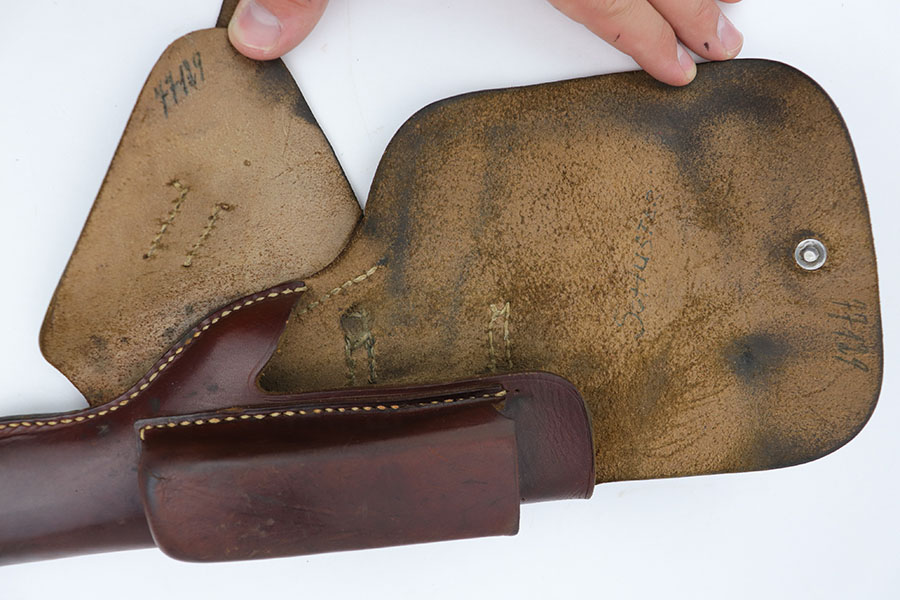 10/1/19 – This is a scarce and desirable early WW2 Hi Power Holster. The holster is 1941 dated and maker stamped under the closure strap. There’s also a waffen military proof stamp under the closure strap. These are crisp, original markings. The interior leather has the serial number of a pistol “77129” in German writing on the side flap and main body of leather. The leather is pliable with normal wear, but no excessive damage. There’s a light name scratched into the front leather. Overall great condition. Stitching is all original and tight except for a few (3-4) missing stitches on the side flap. Overall very nice and rare collectible holster.