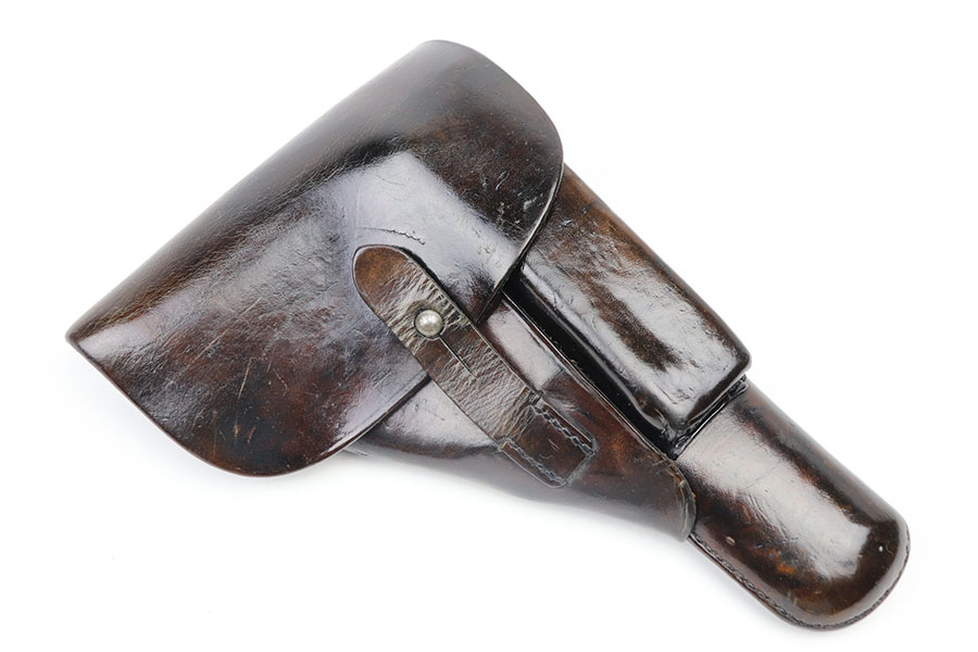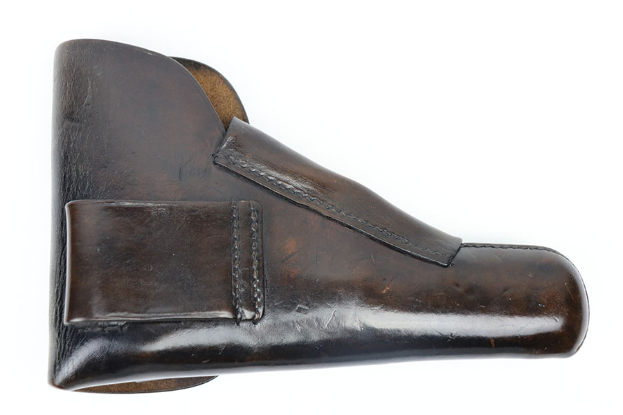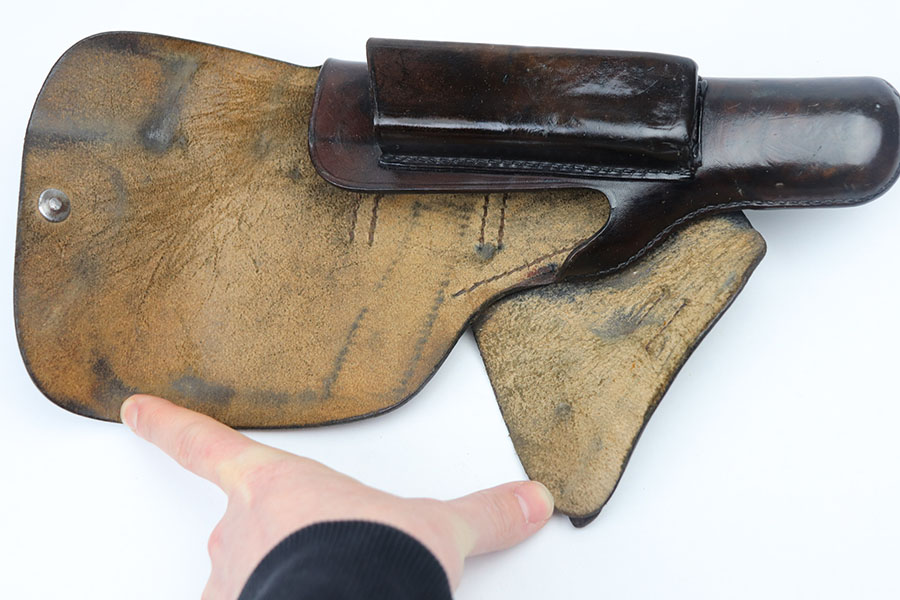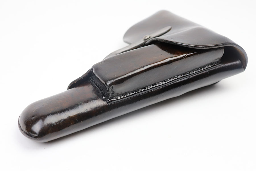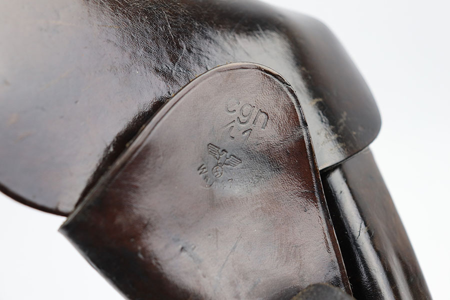 3/18/21 – This is a fairly scarce WW2 high power holster. The holster is scarce because it’s 1941 dated, which is a hard year to come by for the high power holsters. The holster is in great overall condition with some mild surface wear but no major damage to the leather. The interior leather shows normal signs of use. All original stitching in tact. There’s a maker stamp, date, and waffen proof under the closure strap.