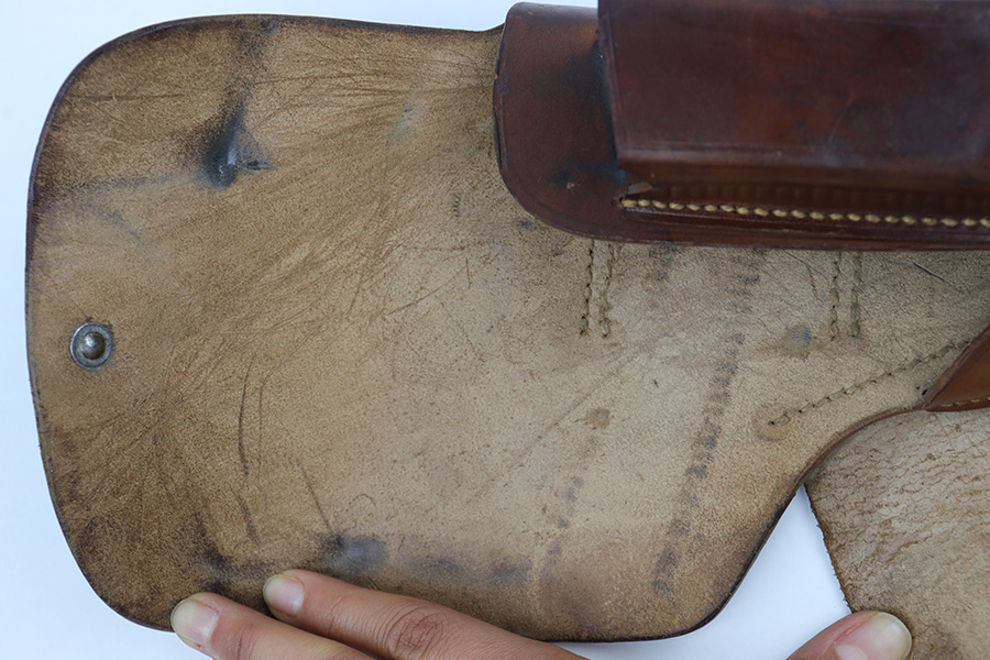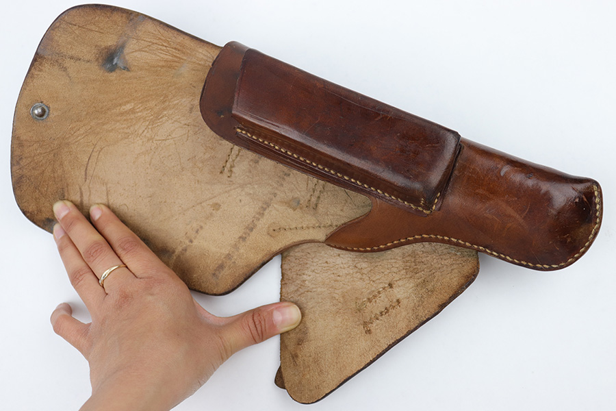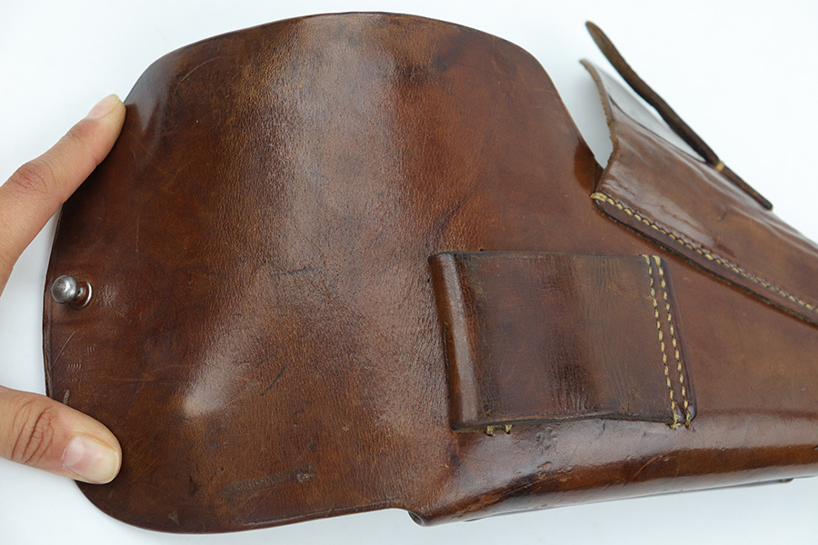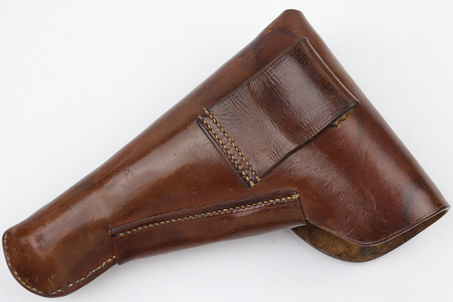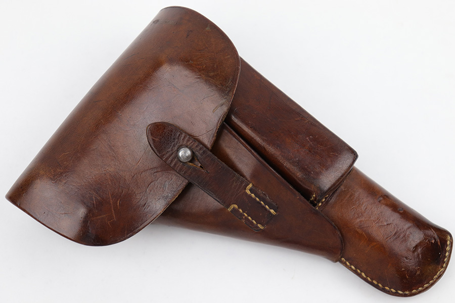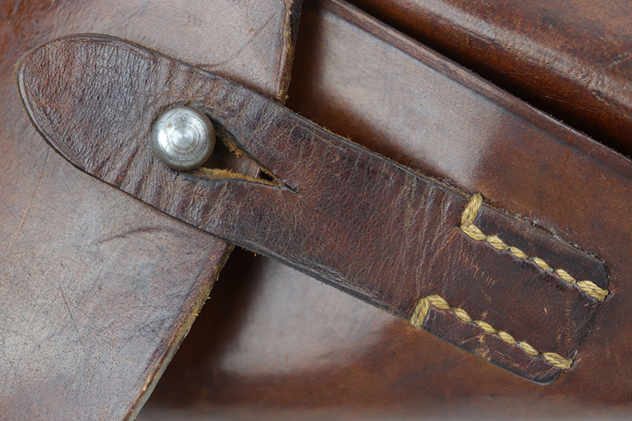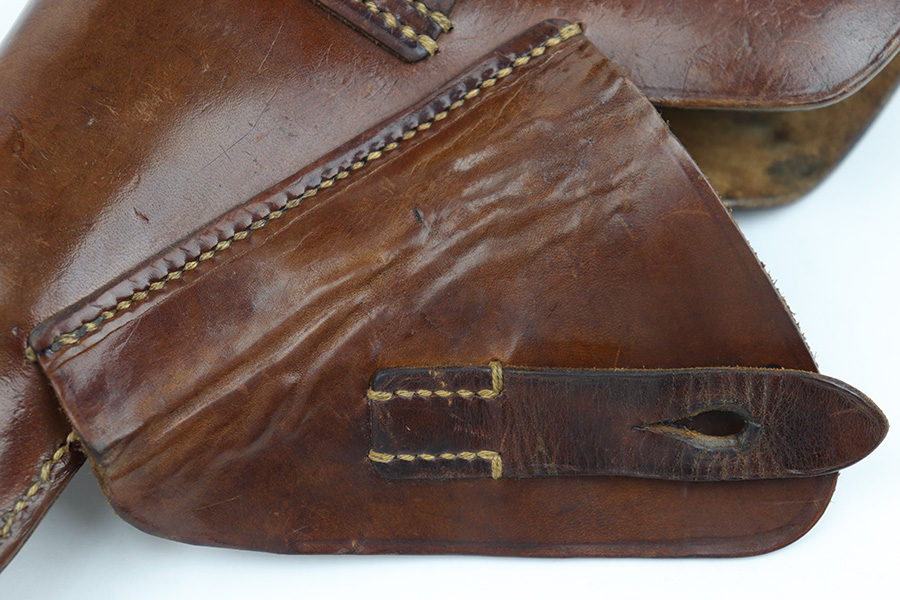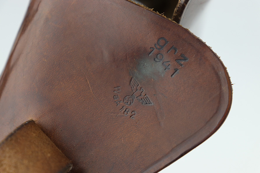 4/13/23 – This is an excellent and early variation 1941 German High Power holster. The holster has strong, clean brown leather with mild pliability and minimal surface wear. Holds shape nicely and has evidence of previous use. Crisply stamped with a waffen military proof, date, and maker code under the closure strap. Clean interior leather and all original straw colored stitching intact. A highly collectible example.