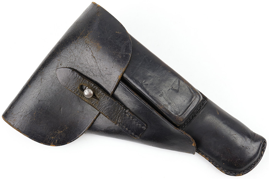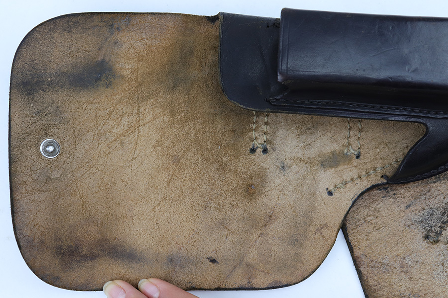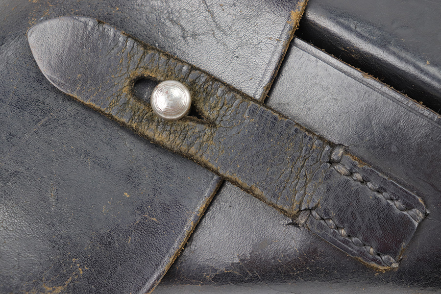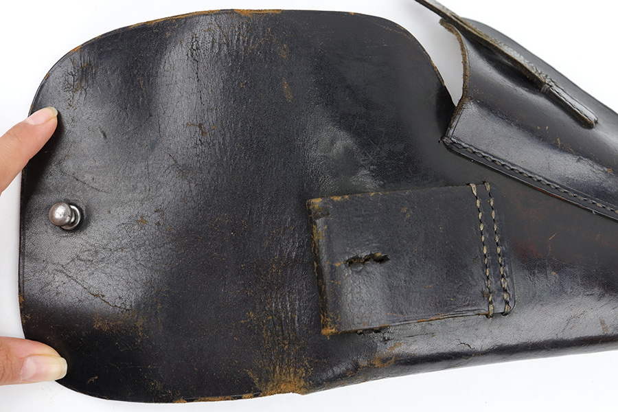 6/23/23 – This is an original WW2 German High Power holster from 1941. The holster is stamped under the closure strap with a “bdt” maker code, “41” date stamp, and waffen military proof stamp. The black leather is soft and pliable with mild surface wrinkling and typical signs of aging and previous use. The top leather and top of the belt loop have surface wrinkling and mild cracking. The belt loop has a hole in the leather, as shown. The stitching is all tight, original, and intact. Fairly clean interior leather with normal signs of prior use.