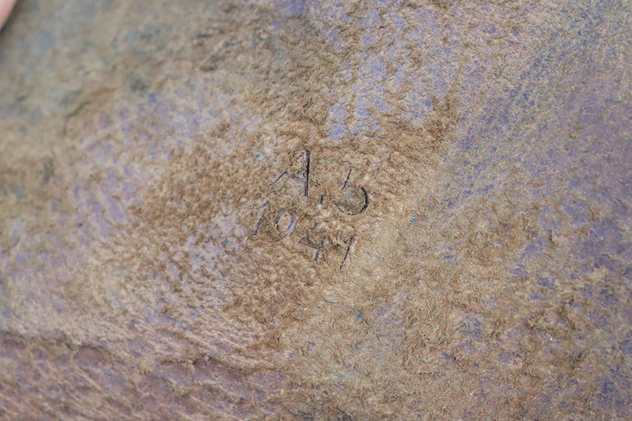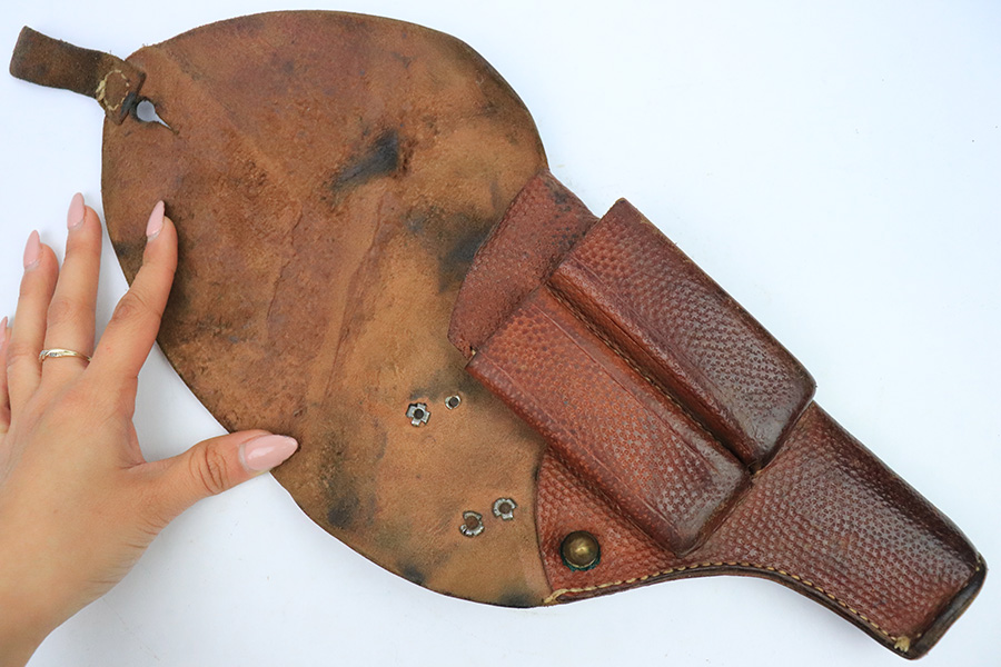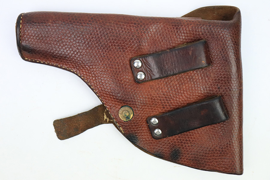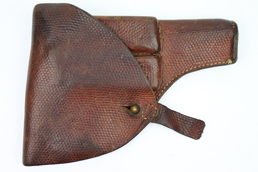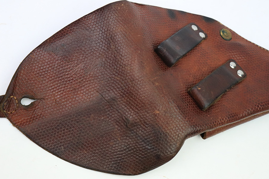12/13/22 – This is a Swedish Husqvarna M1907 pistol holster. The holster is maker stamped “Ab” and 1941 dated on the interior leather. The exterior leather shows typical signs of use and aging with completely original leather and all original stitching in tact. The leather has normal pliability overall. Features a front double-magazine pouch.