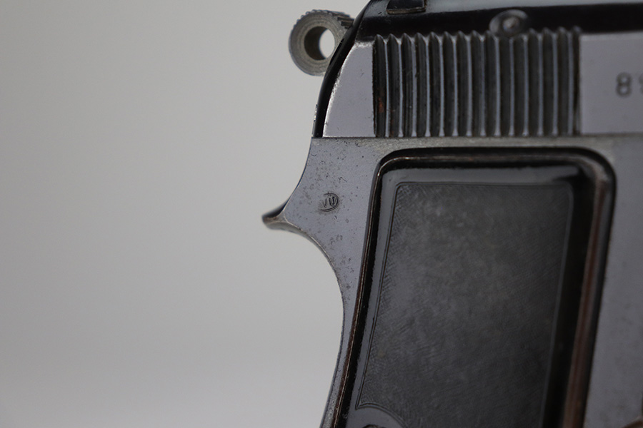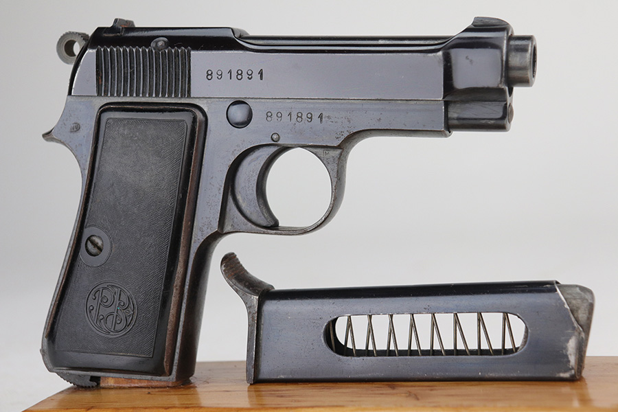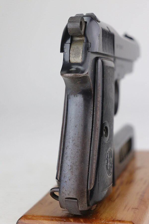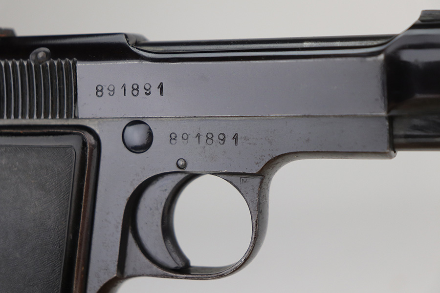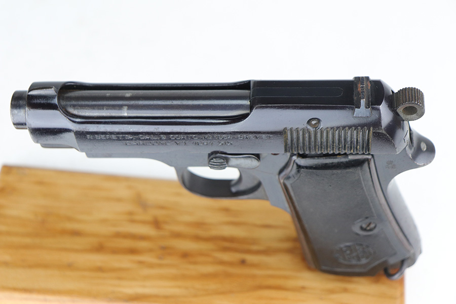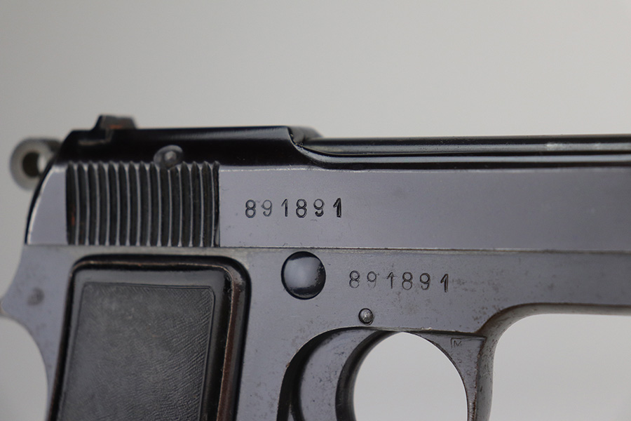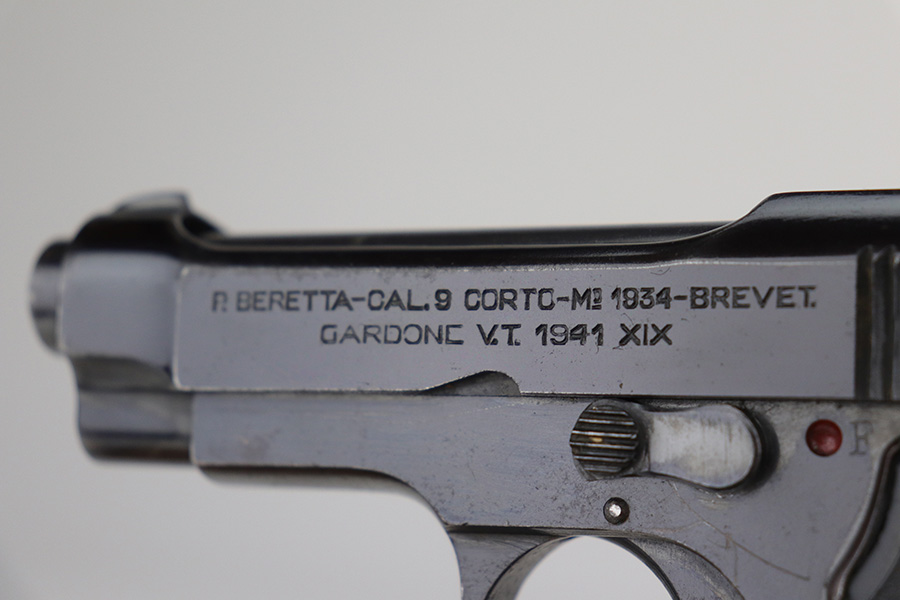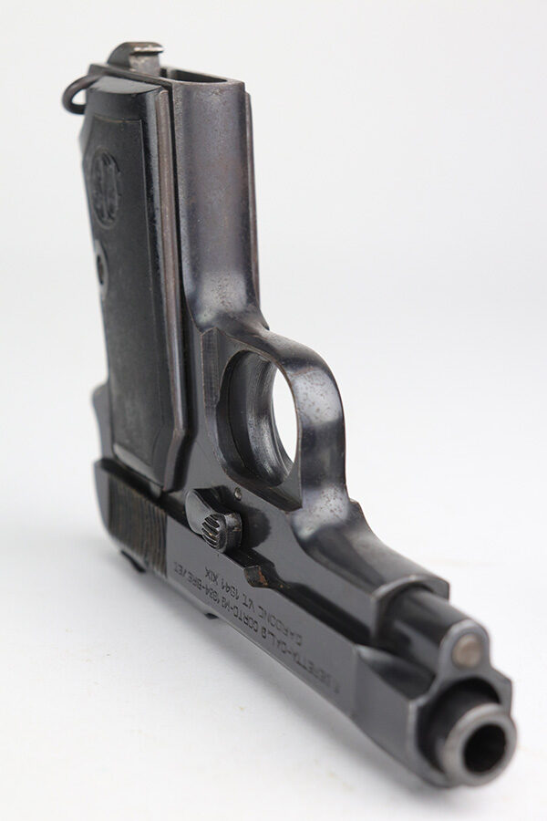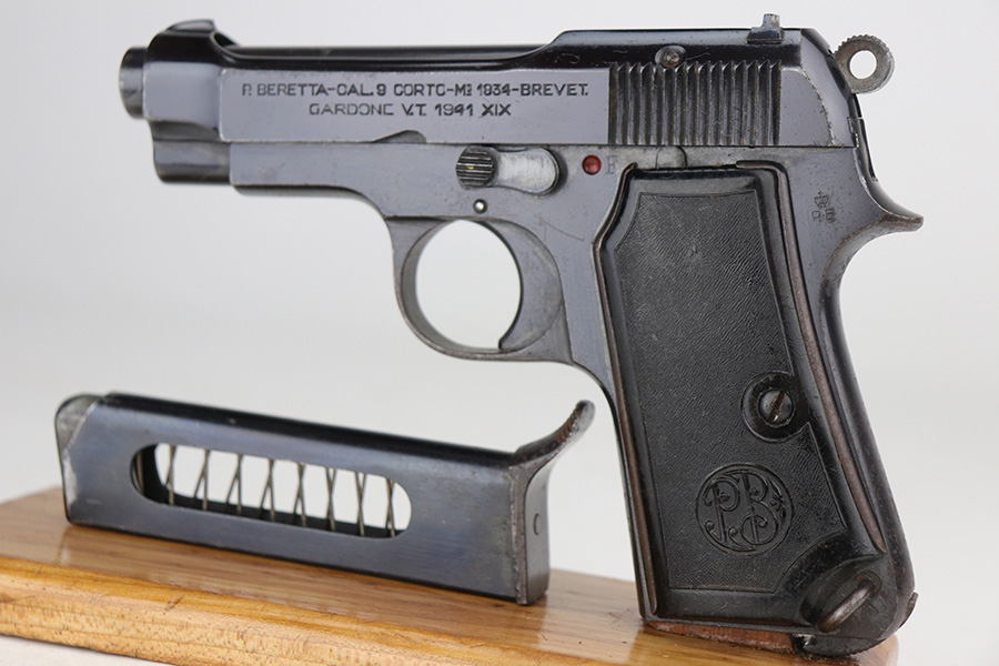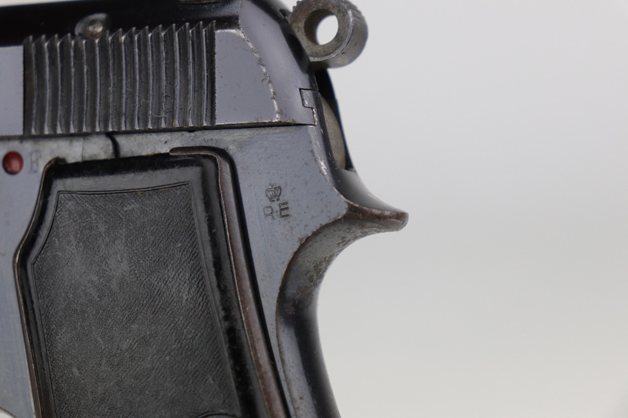 11/10/21 – This is an excellent example of a Beretta Model 1934 issued to the Royal Italian military in 1941. It is all matching and has the proper “Crown RE” Italian military proof on the left side of the frame, near the tang. It has retained about 97-98% of its high polish finish with just very minor wear on the high edges of the slide and around the muzzle. While there is very little actual finish loss, there is heavy brown patina and spotty oxidation on both grip straps. Comes with excellent black bakelite grips and one period-correct magazine. The bore has decent rifling with freckling throughout.