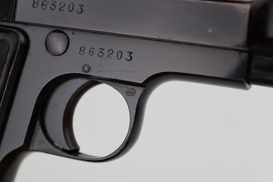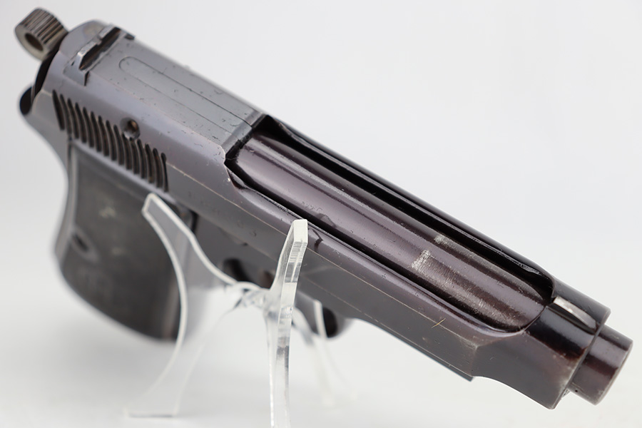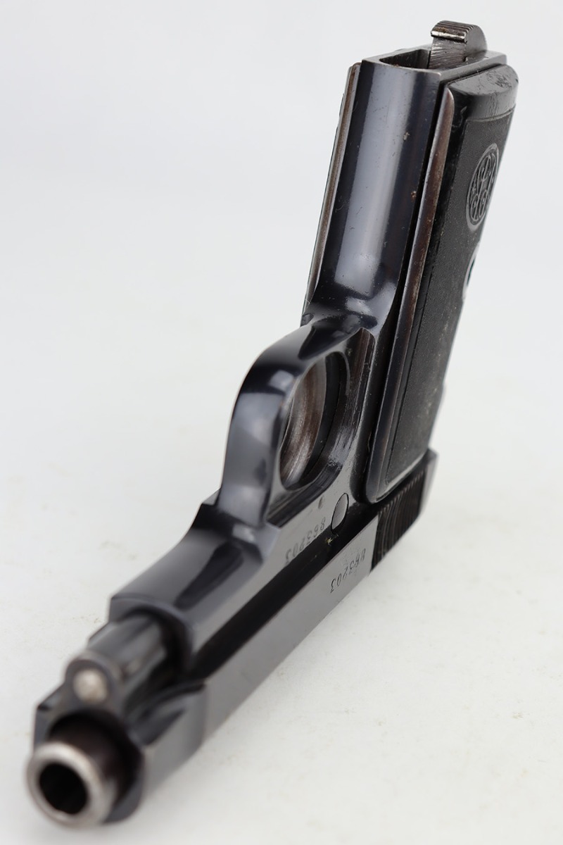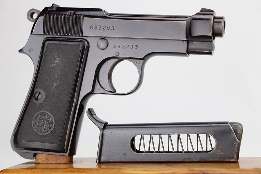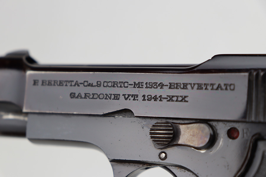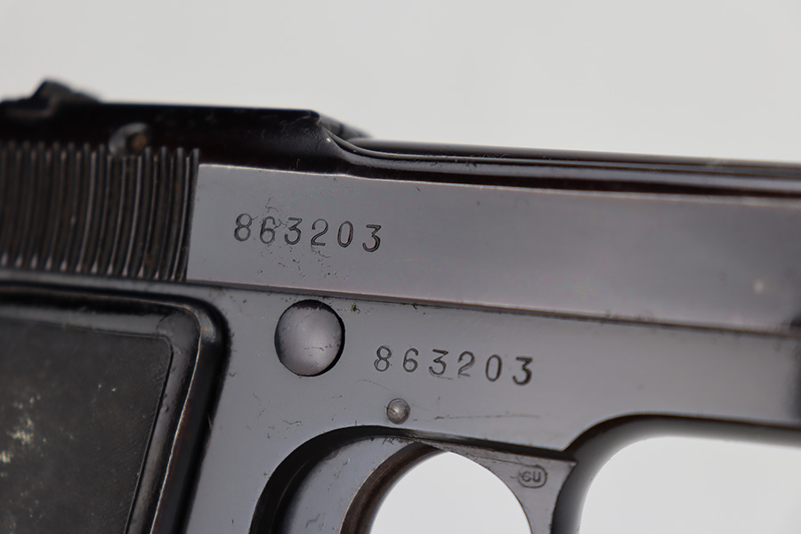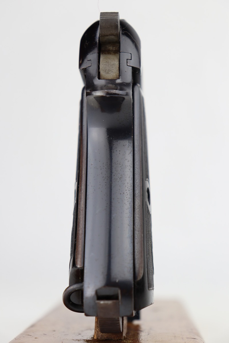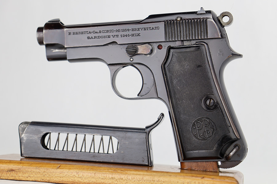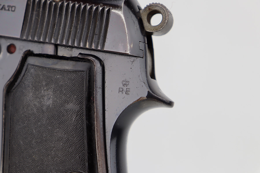 6/12/23 – This is a very nice example of a Beretta Model 1934 issued to the Italian military in 1941. It is all matching and has the proper Italian “Crown RE” military acceptance proof. It has retained about 93% of its original high polish finish with minor wear around the muzzle and on the high edges of the slide. Some light freckling on the back strap. Fitted with excellent period-correct black bakelite grips. Comes with one proper magazine. The bore has good rifling with minor pin-pricking throughout.