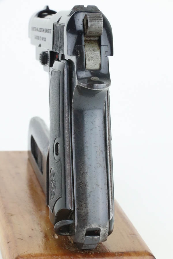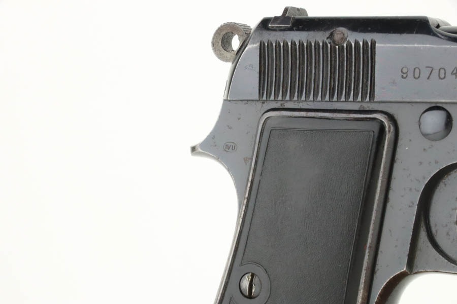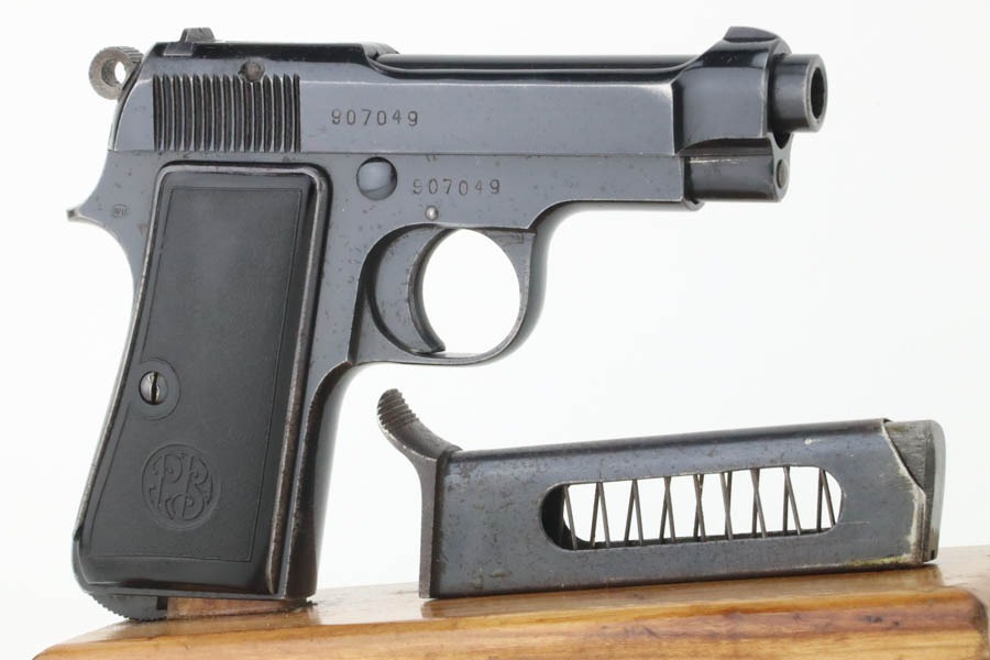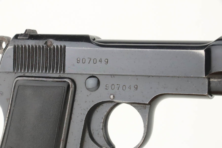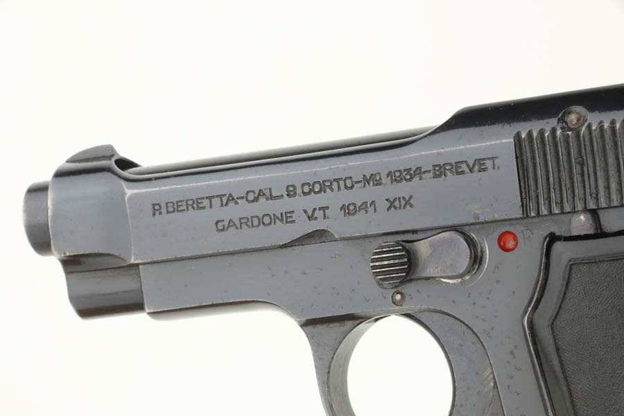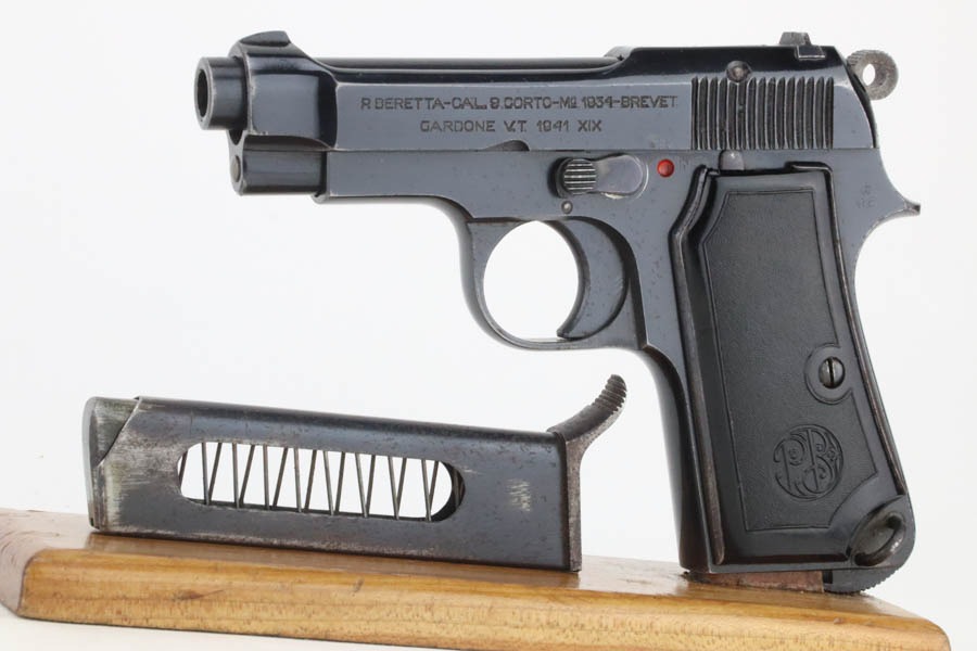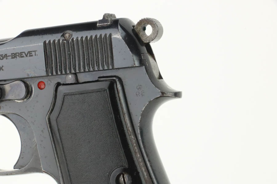 10/14/24 – This is a nice example of a Beretta Model 1934 issued to the Italian military in 1941. It is all matching and has the proper Italian “Crown RE” military acceptance proof. It has retained about 97% of its original high polish finish. While there is very little actual finish loss, there is light spotty surface oxidation covering most of the gun. Fitted with excellent period-correct black bakelite grips. Comes with one proper magazine. The bore has good rifling, but there is pin-pricking throughout.