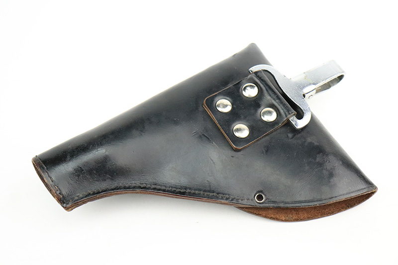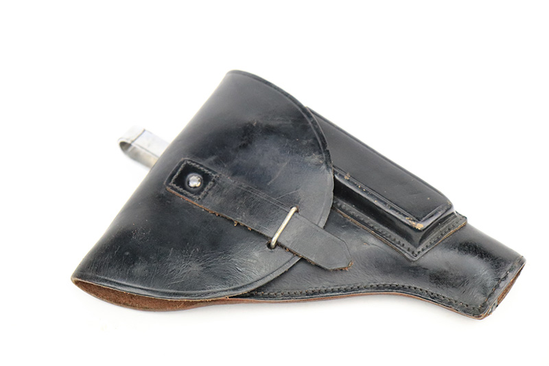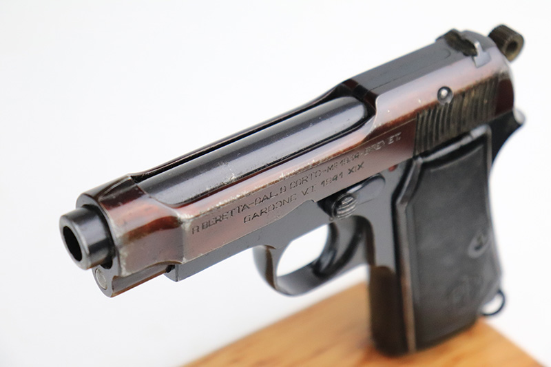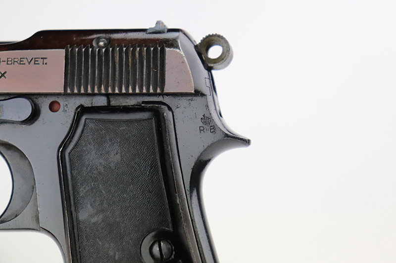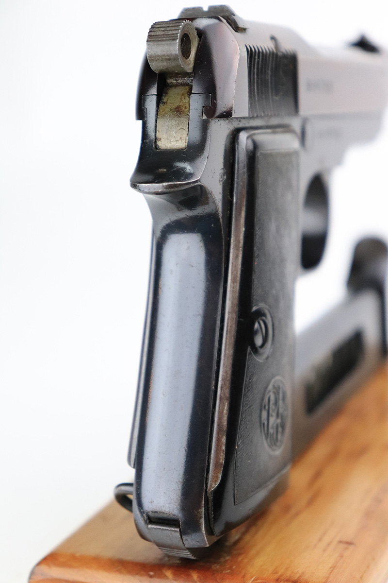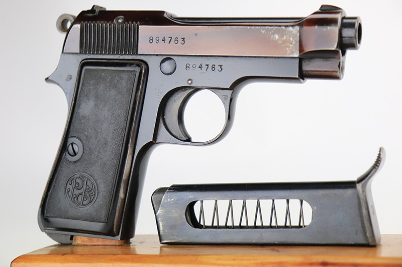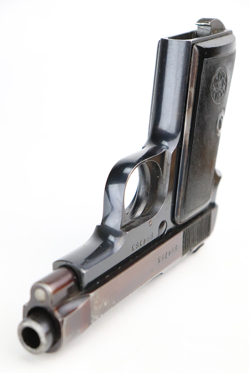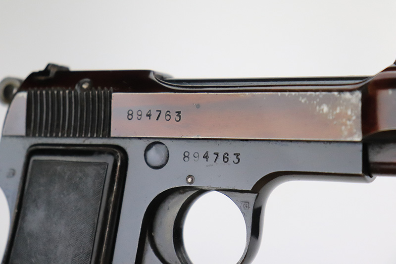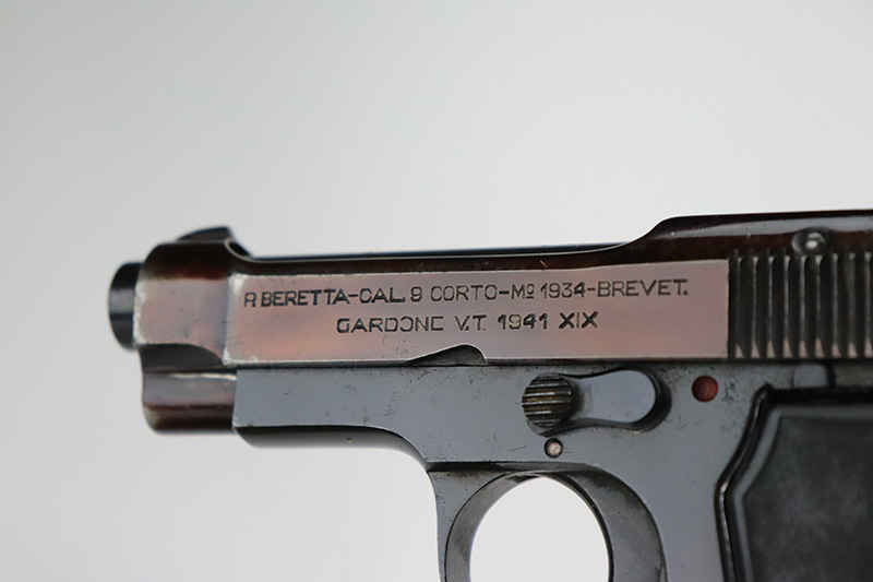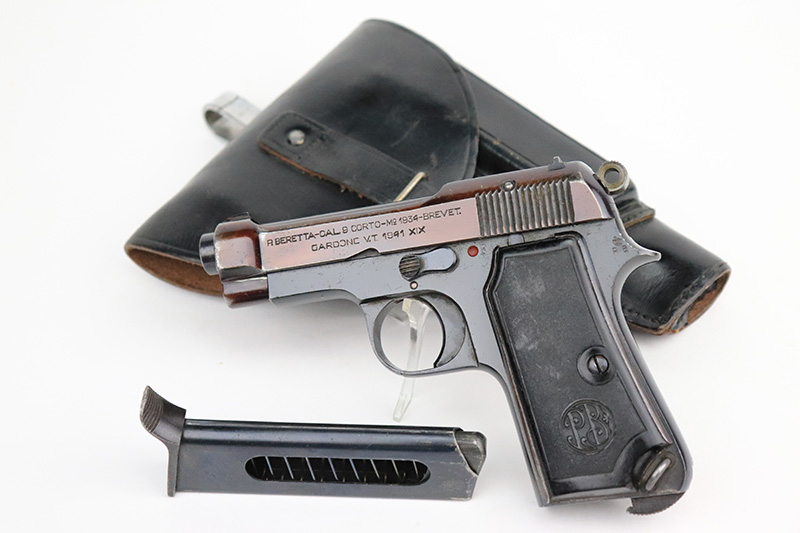 9/23/22 – This is a very nice example of a Beretta Model 1934 issued to the Italian military in 1941. It is all matching and has the proper “Crown RE” military acceptance proof on the left side of the tang. Comes as a rig with one proper magazine and a really nice 1976-dated black leather holster (fits the gun well). The gun itself has retained about 93-94% of its original high polish finish. Beautiful plumb-coloring on the slide. There is light spotty wear on both sides of the slide, concentrated around the high edges. Light freckling on both grip straps. Comes with very nice period-correct black bakelite grips. Minty bore.