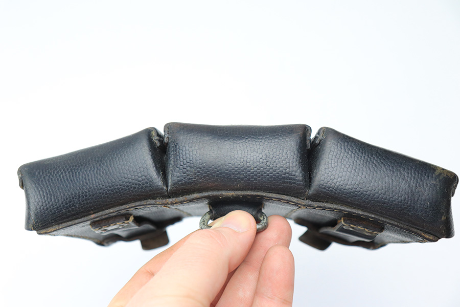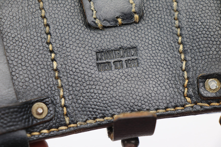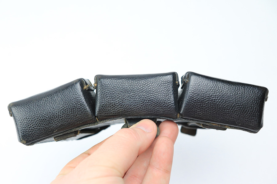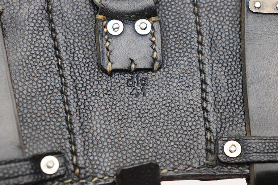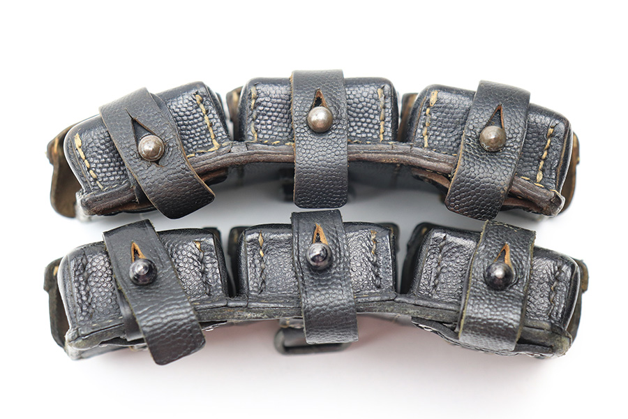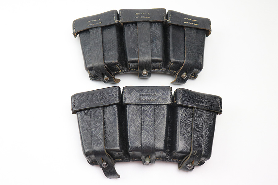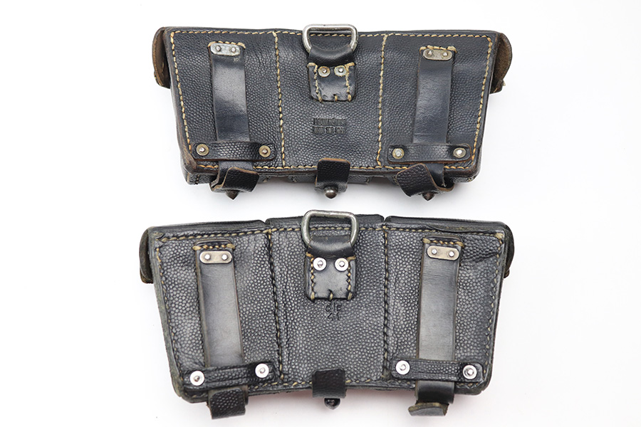 12/7/21 – This is an original pair of K98 ammo pouches from WW2. Each pouch has very nice black pebble grain leather and straw colored stitching. No major flaws or issues and generally clean interior leather. Each pouch is maker stamped and dated 1941 on the reverse. They’re different makers but both 1941 dated.