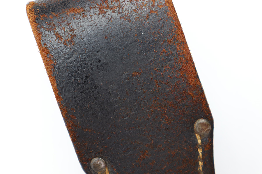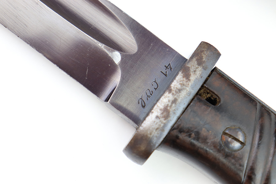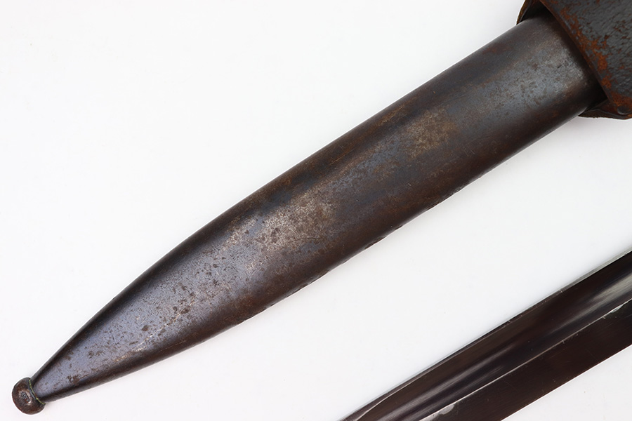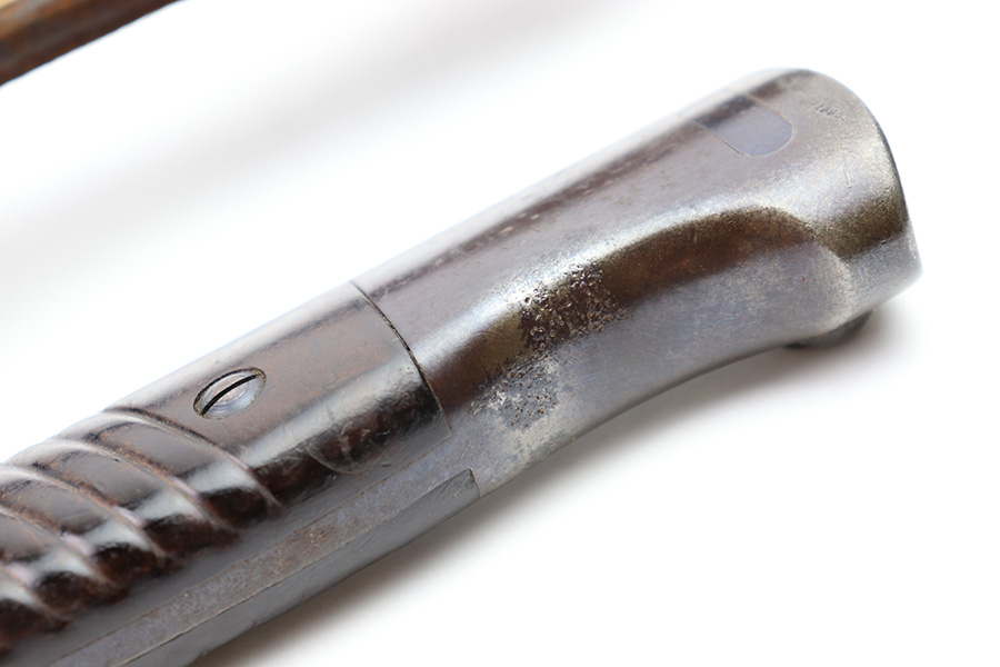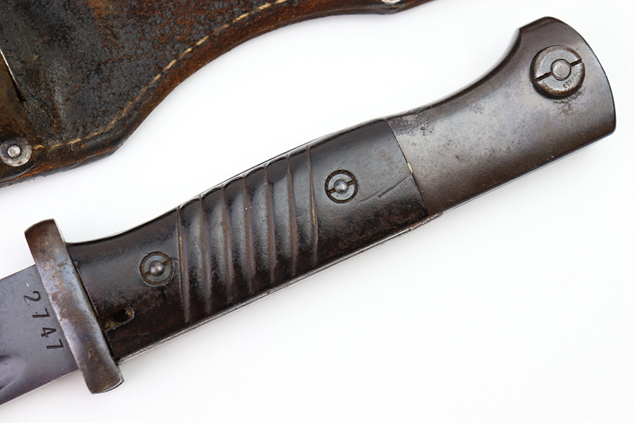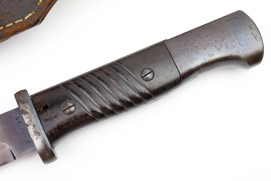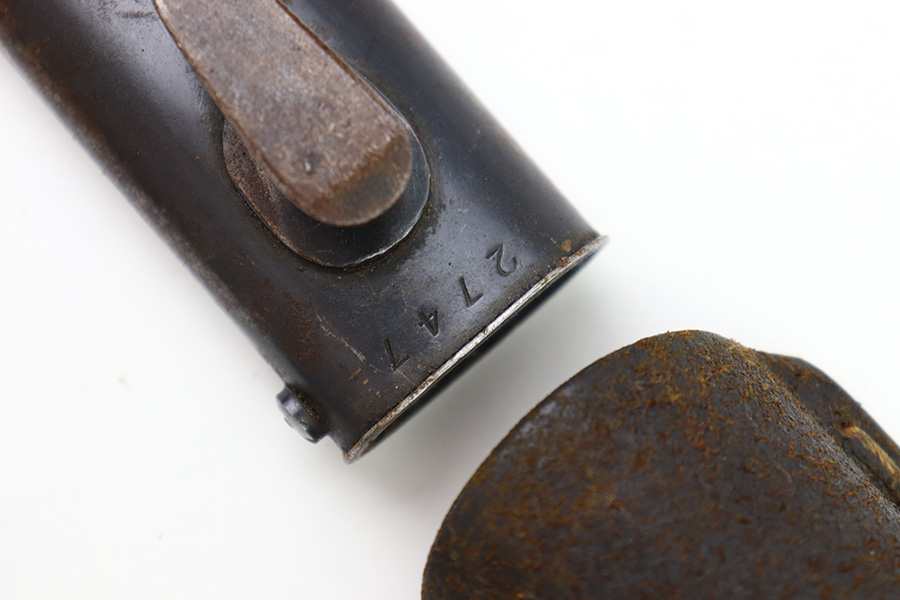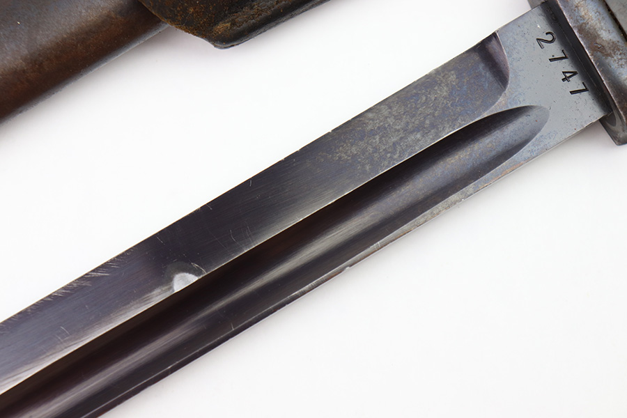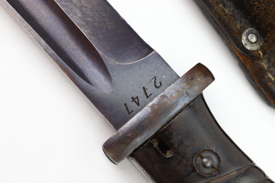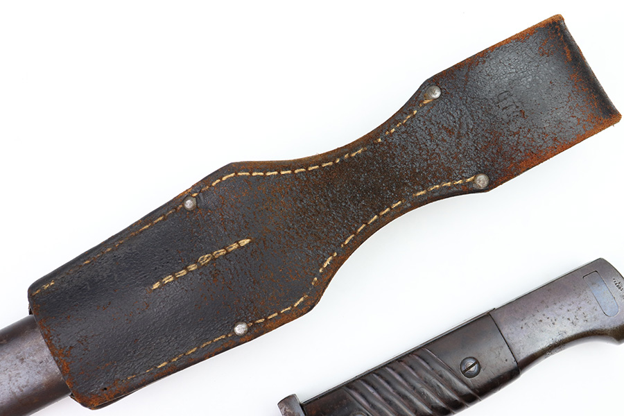 8/4/22 – This is an original 1941 dated K98 bayonet with a matching numbered scabbard and leather frog. The bayonet blade is in great overall condition with excellent bluing and some mild finish loss / scabbard wear. No signs of sharpening. The metal pommel, hand guard, and spine of the handle have dark patina and aging throughout. The scabbard is worn with brown surface patina and most of the finish missing. There are no dents, however. The leather frog is aged and has surface wear throughout but is 1942 dated on the back and completely intact.