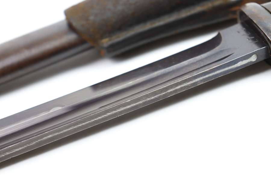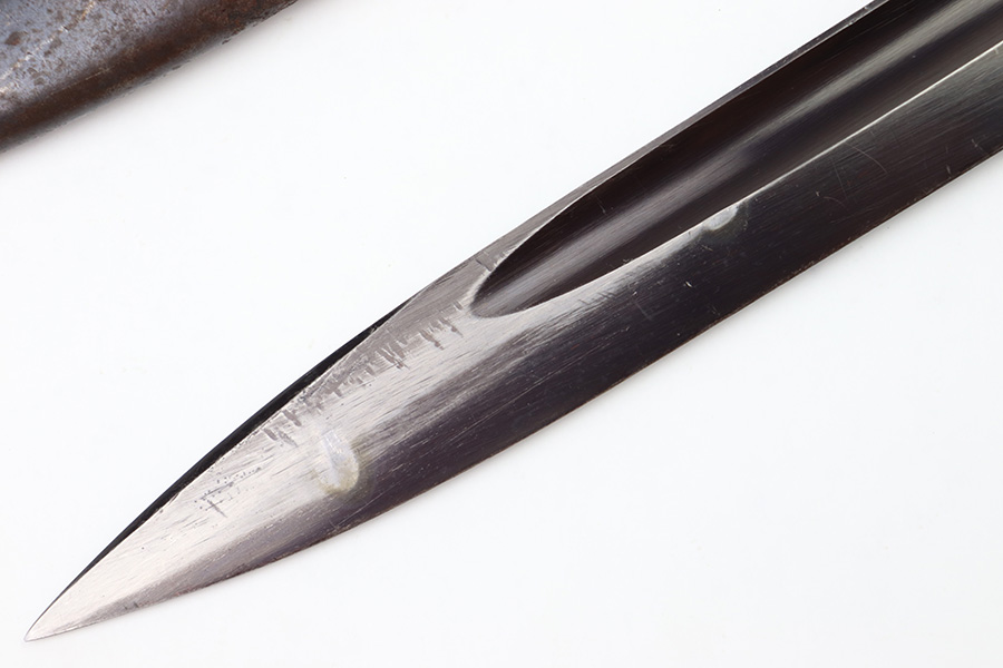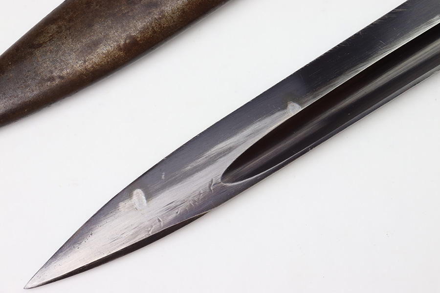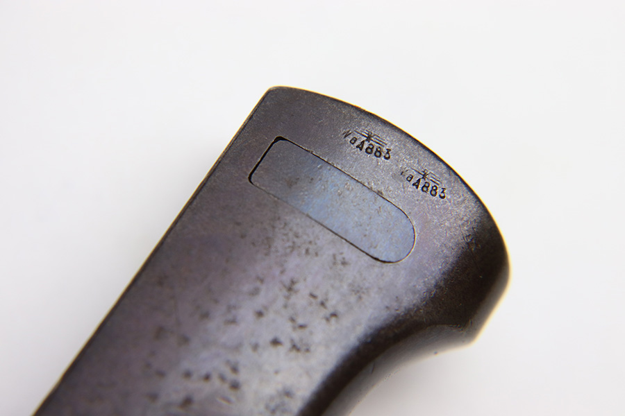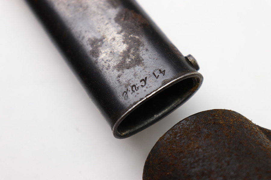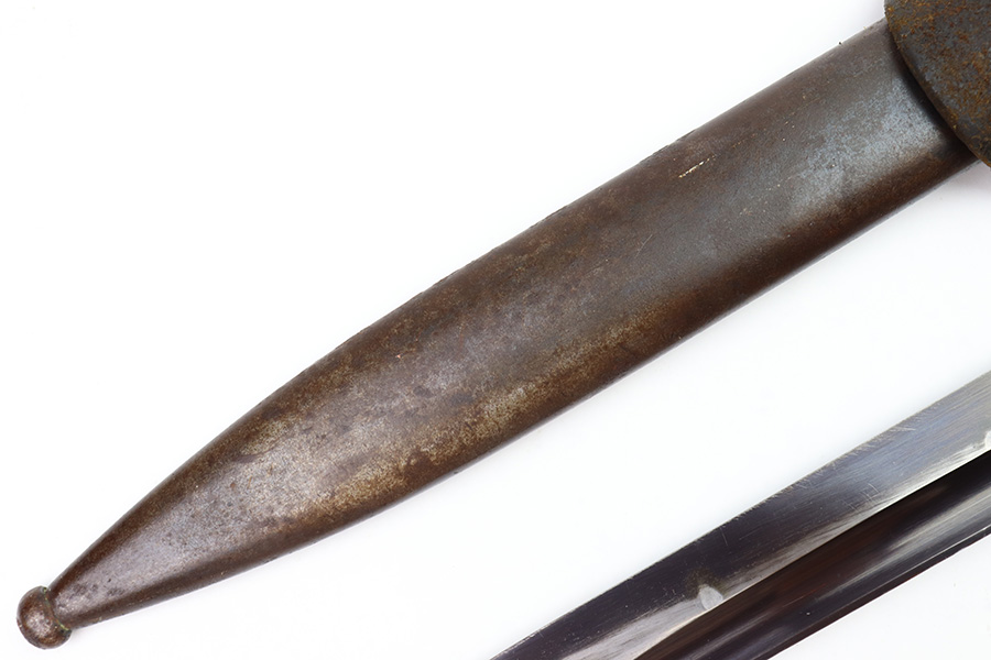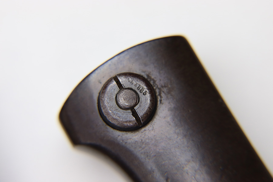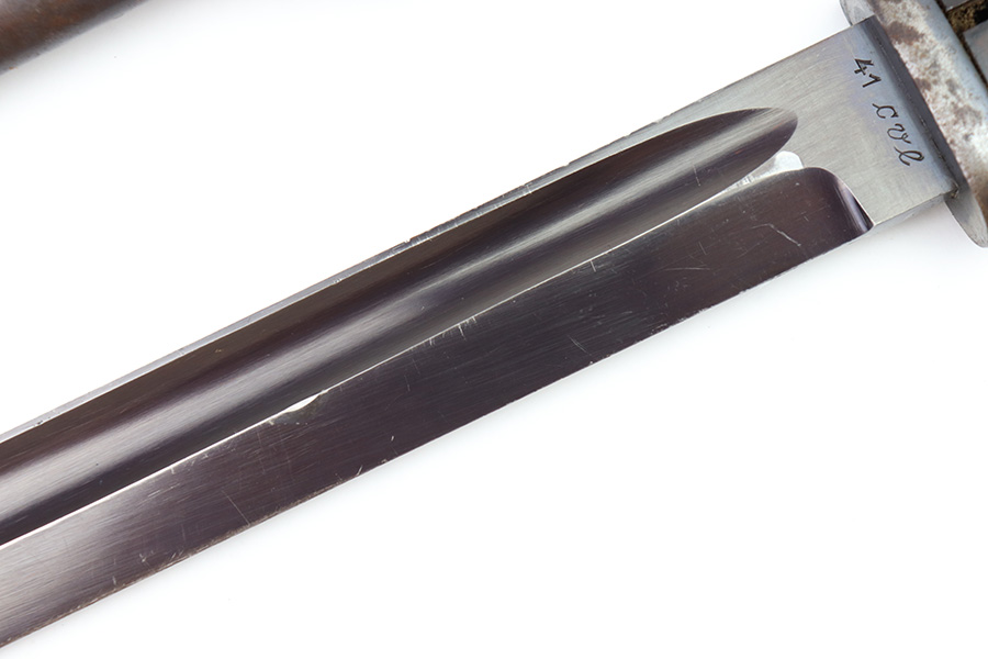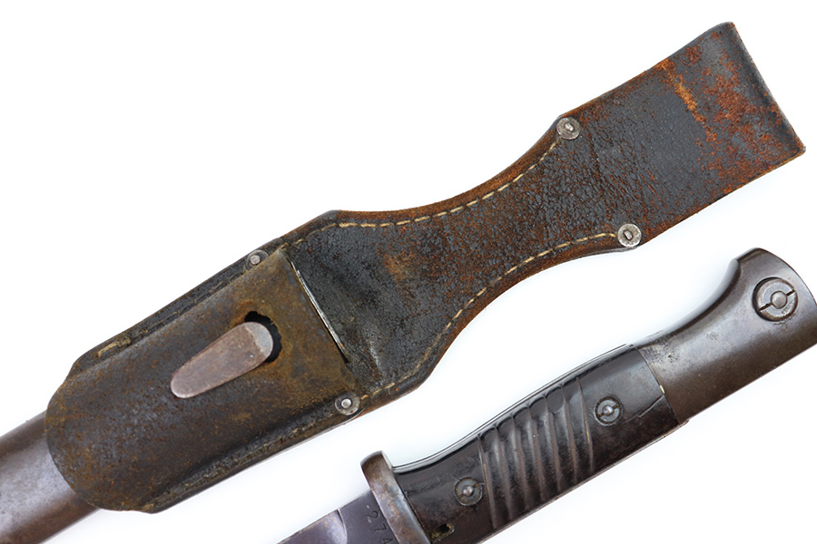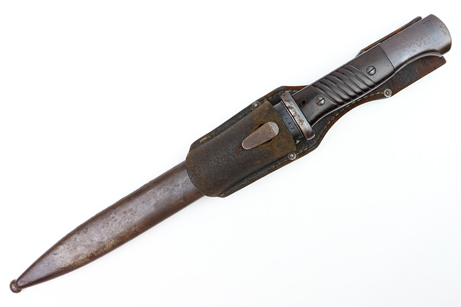 8/4/22 – This is an original 1941 dated K98 bayonet with a matching numbered scabbard and leather frog. The bayonet blade is in great overall condition with excellent bluing and some mild finish loss / scabbard wear. No signs of sharpening. The metal pommel, hand guard, and spine of the handle have dark patina and aging throughout. The scabbard is worn with brown surface patina and most of the finish missing. There are no dents, however. The leather frog is aged and has surface wear throughout but is 1942 dated on the back and completely intact.