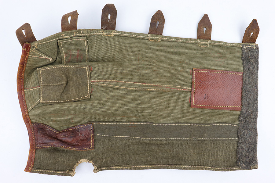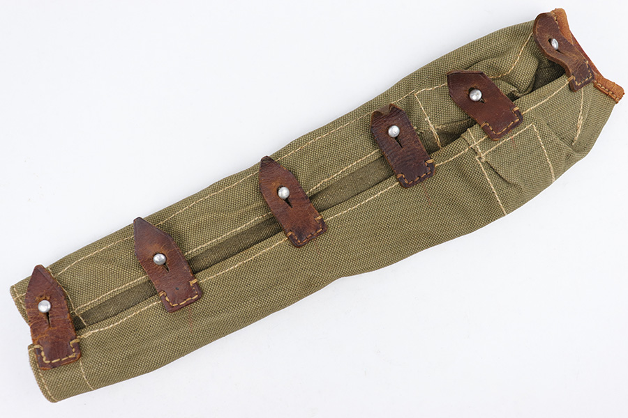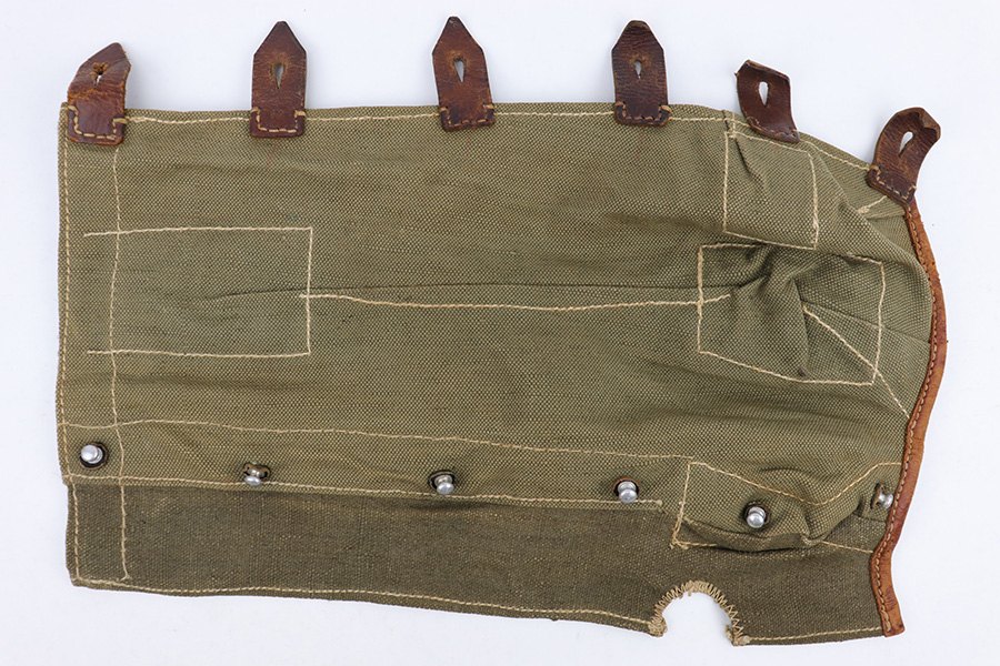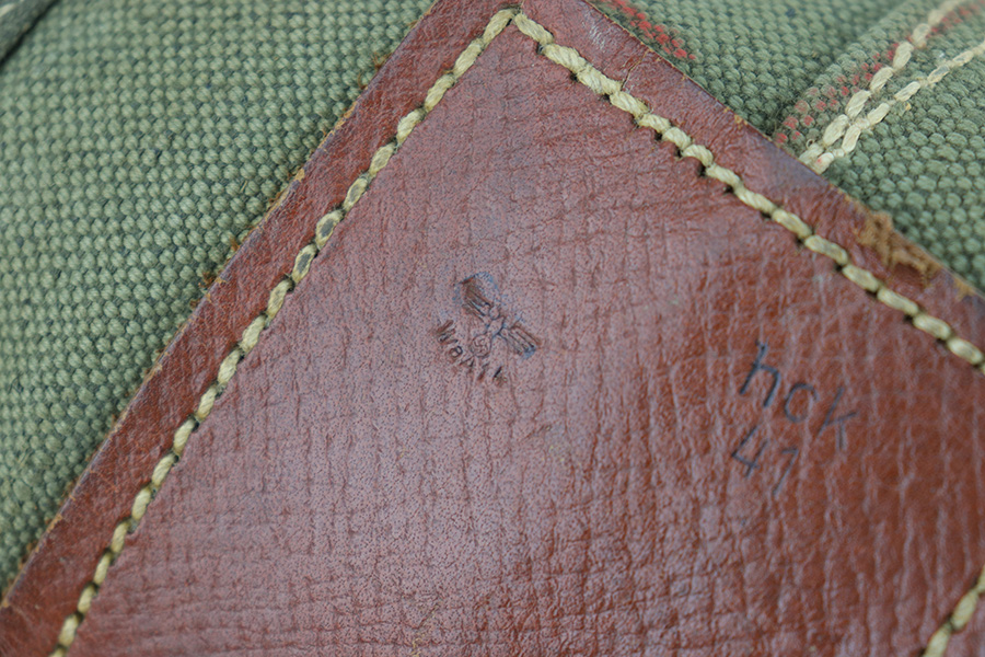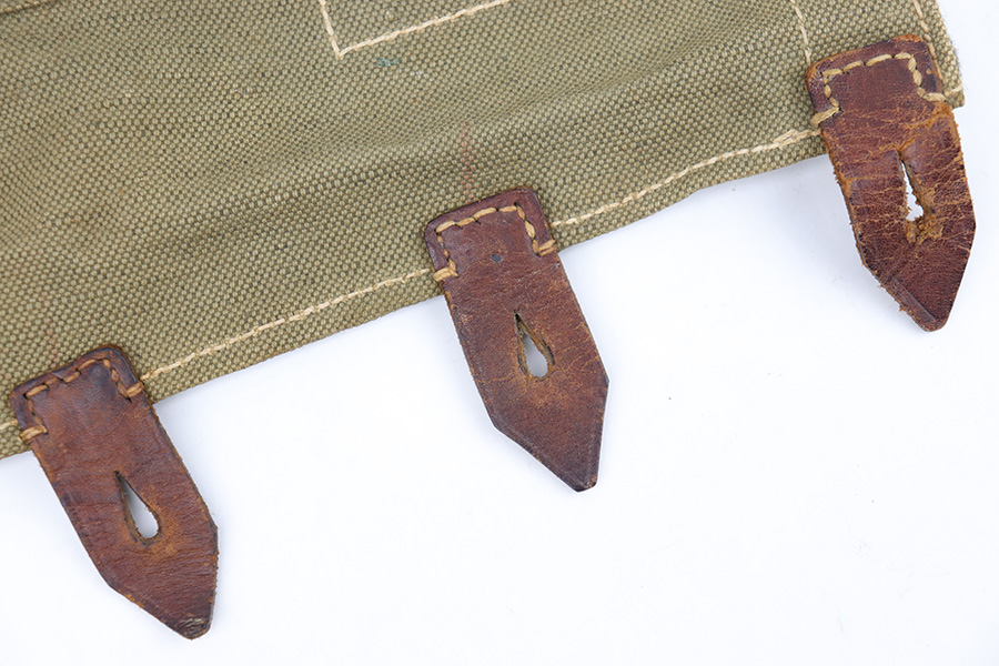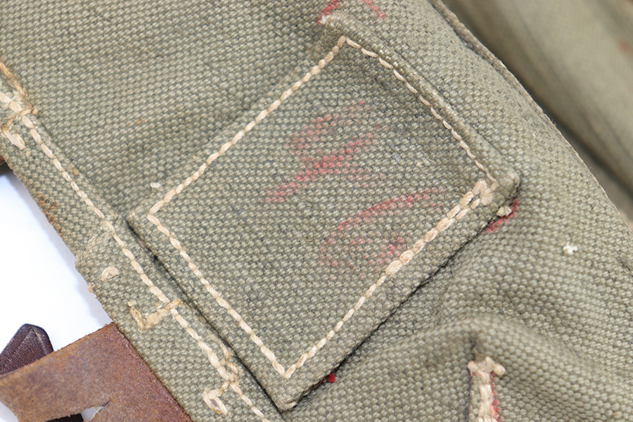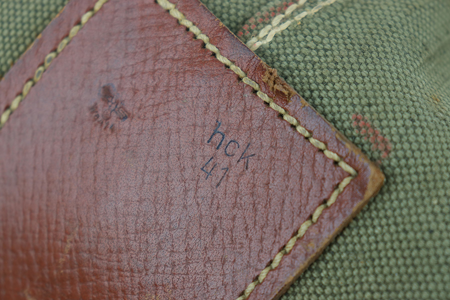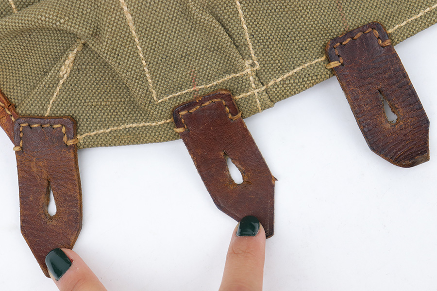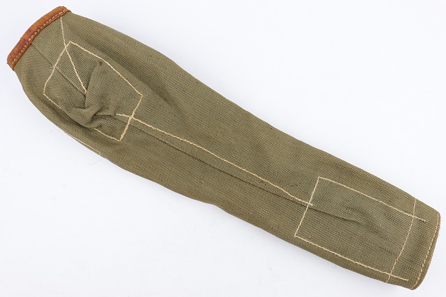 3/28/23 – This is an excellent condition canvas K98 action cover from WW2. These were used in winter / rainy conditions so the troops could keep their rifles clean and running smoothly. This example has excellent, clean olive green canvas throughout and all original straw colored stitching. The interior edge is felt lined on one end to prevent from damaging the rifle finish. The other end has leather that’s in great condition. Maker stamped, waffen proofed, and 1941 dated on the interior. All straps and knobs are intact and original. Fits very nicely onto a K98 (not too tight like other examples).
