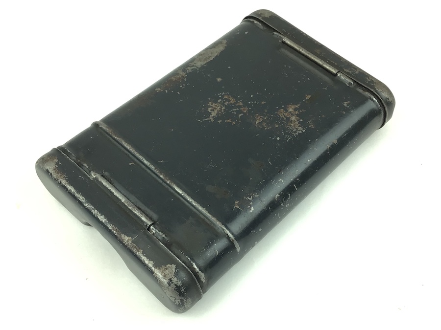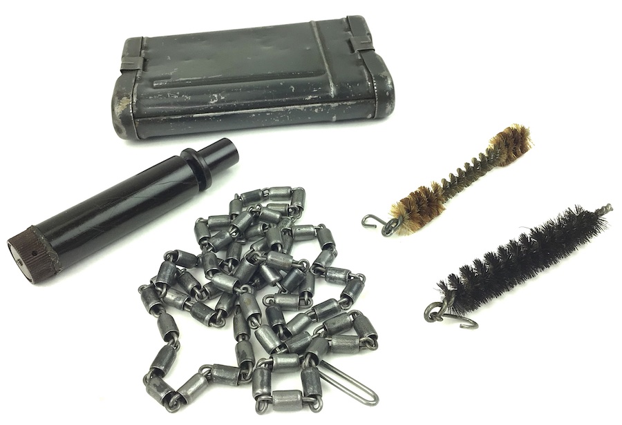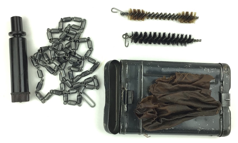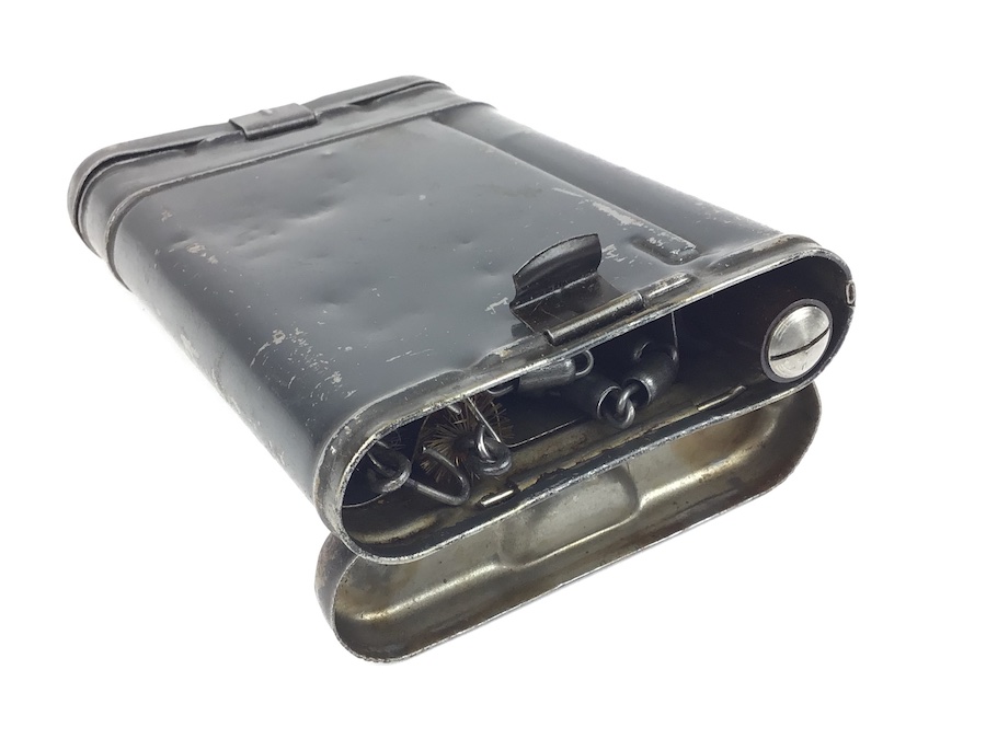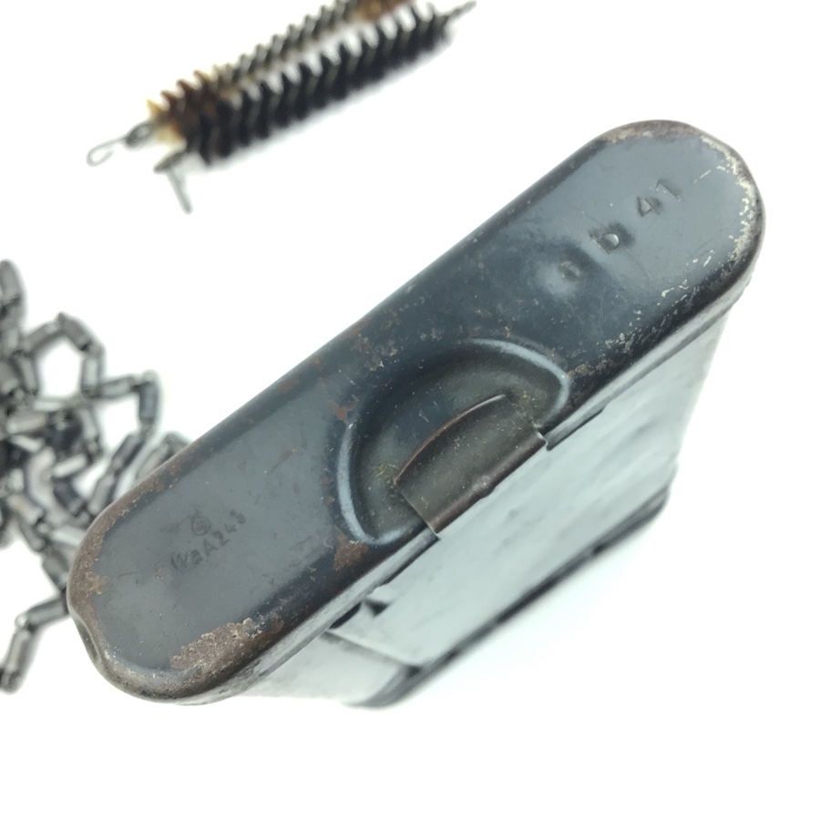 4/6/21 – Original and very good condition cleaning kit for the Mauser K98 8mm rifle. Maker name, date and waffen military stamp on the lid. “ab 41” along with WaA243. The tin has typical paint loss. The lids and clasps function properly. Nice kit.
