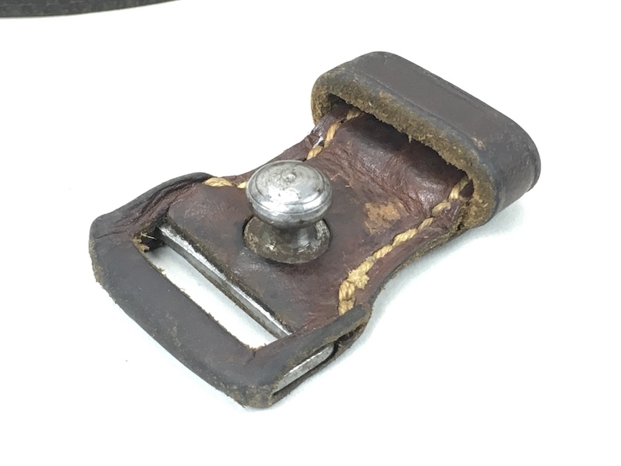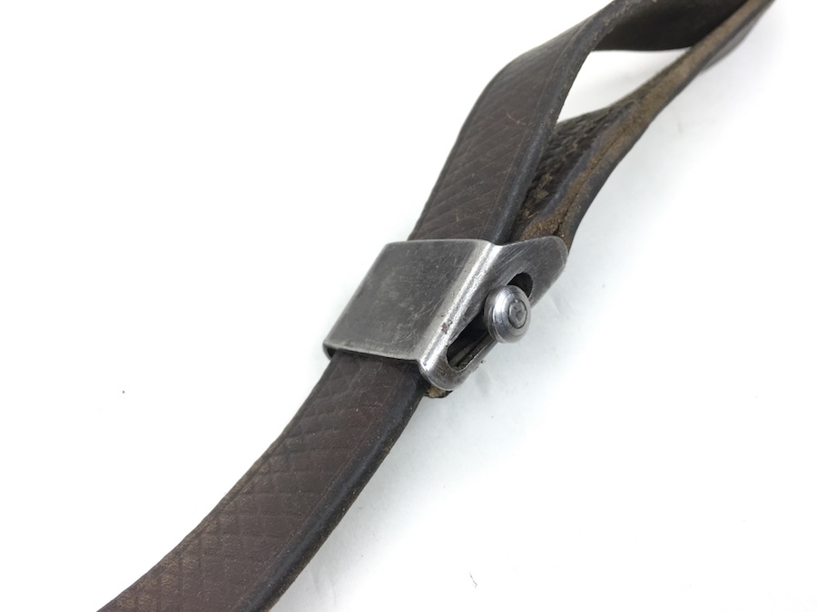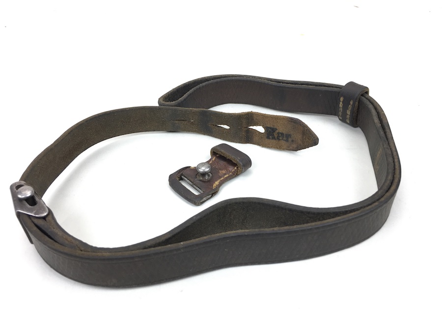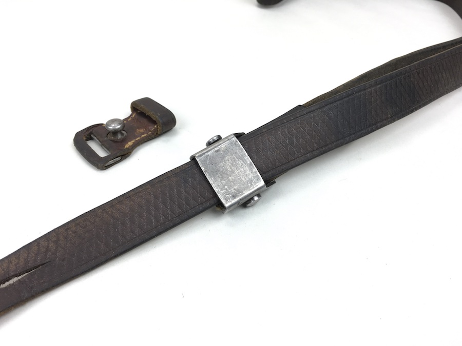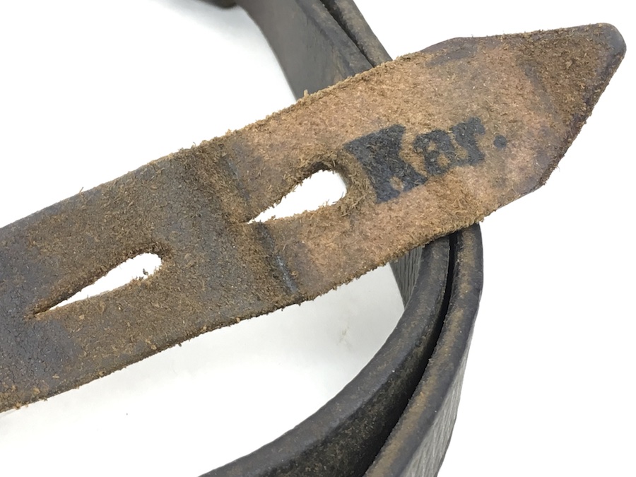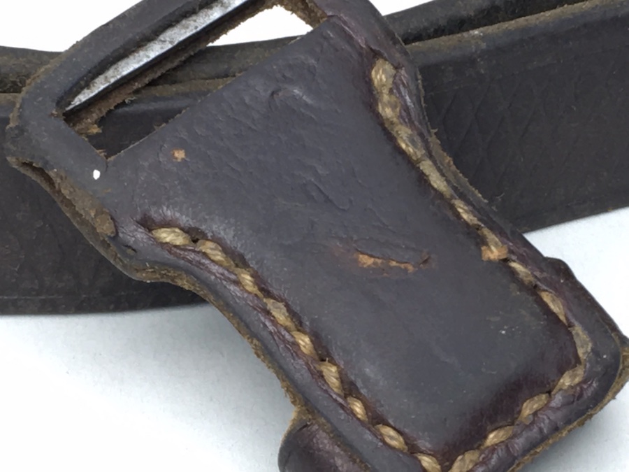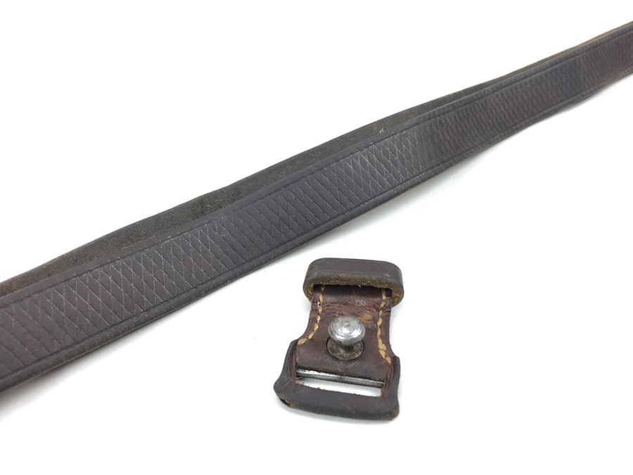 7/25/19 – This is an original leather strap for a K98 rifle manufactured during WWII. Maker stamped “c??” and “41” on the rear of the keeper stud. Maker stamp and date are weak but a “c” and the numeral “1” is visible. Ink stamped “kar” on the rear of the sling. This is short for “Karabinerriemen”, and presumably put on to differentiate it from the “MP38 u. 40” sling which was slightly different. There are no other markings. The leather is excellent and completely in tact with no notable flaws. The leather retains about 95% of the original herringbone pattern. The buckle is un-marked. The stitching is all original as well without issues. Guaranteed original.