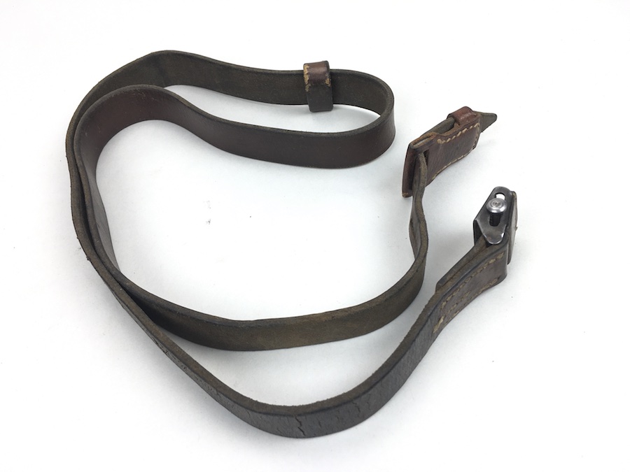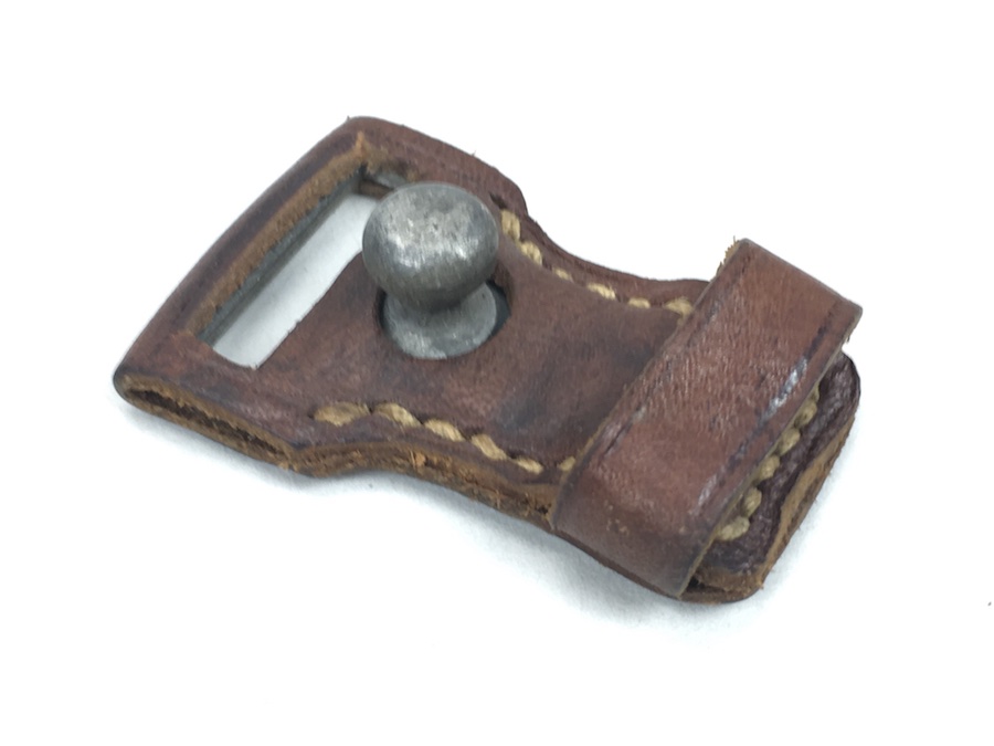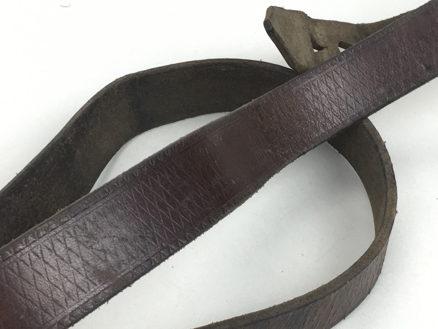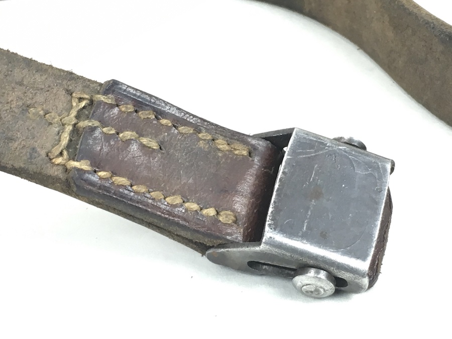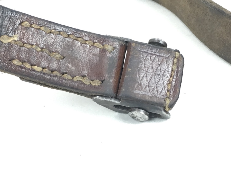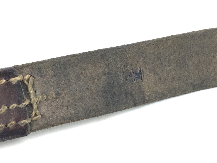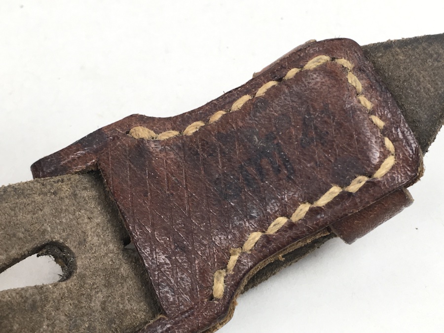 8/12/19 – This is an original leather strap for a K98 rifle manufactured during WWII. Maker stamped “amj” and “41” on the rear of the keeper stud. Date stamped on the rear about 3″ from the clasp. The leather is excellent and completely in tact with no notable flaws. The leather retains about 95% of the original herringbone pattern. The buckle is un-marked. The stitching is all original as well without issues. Guaranteed original.
