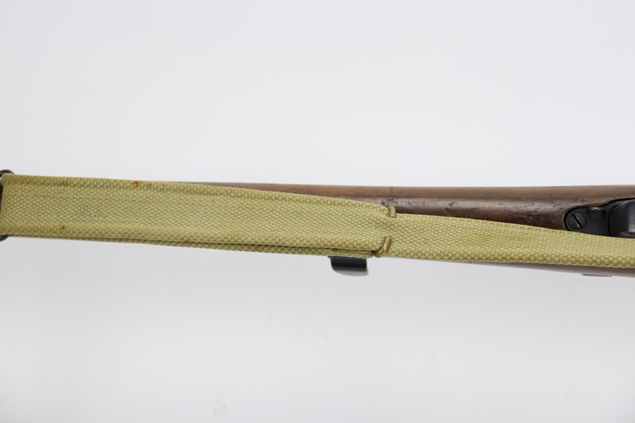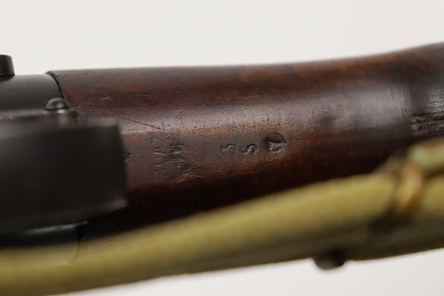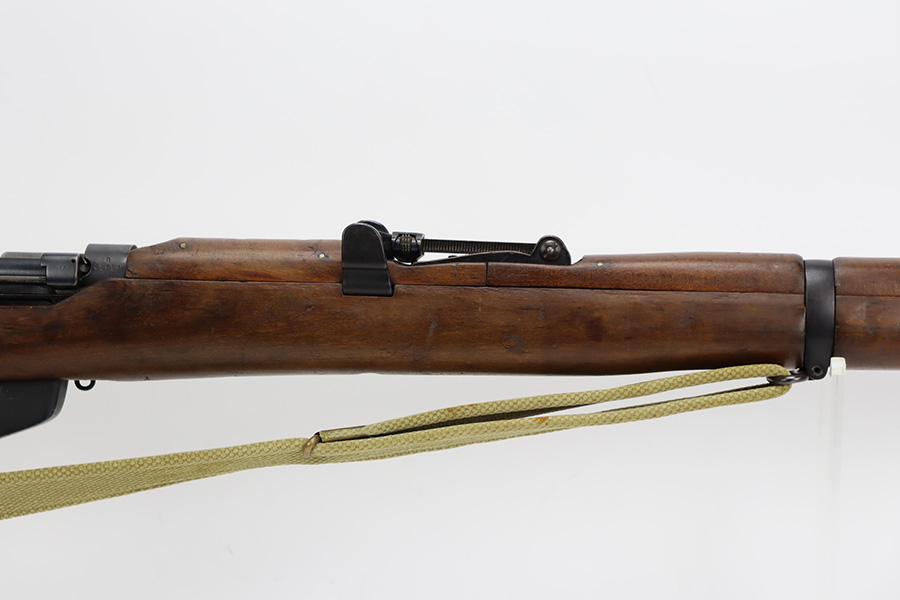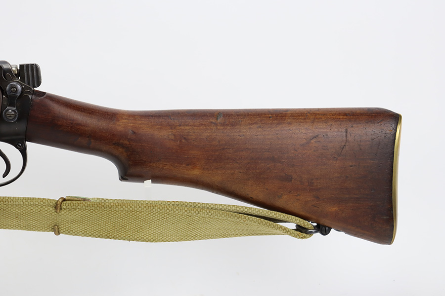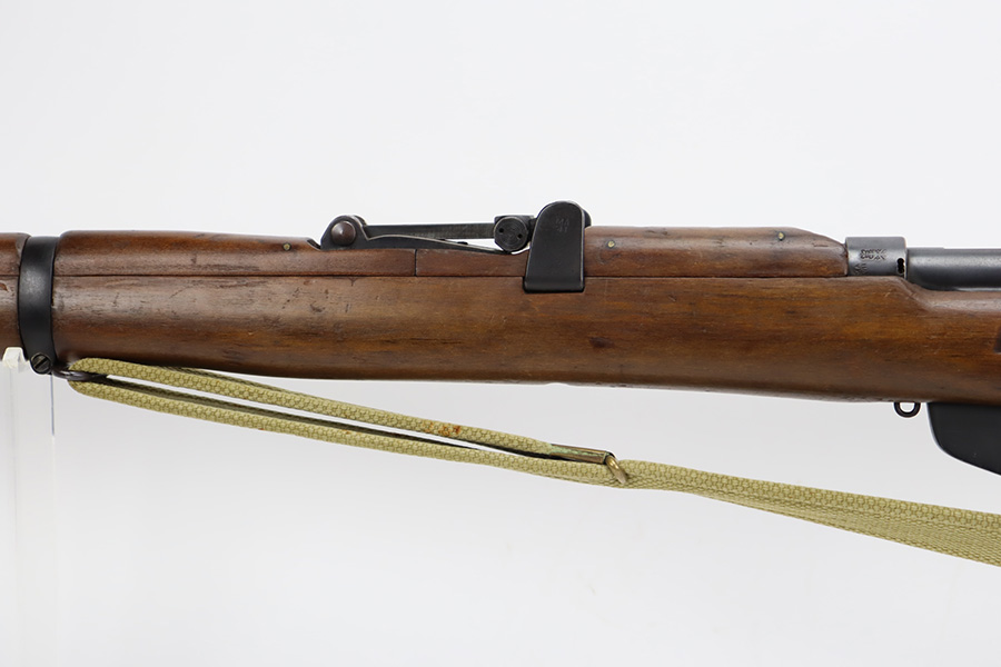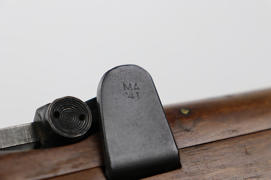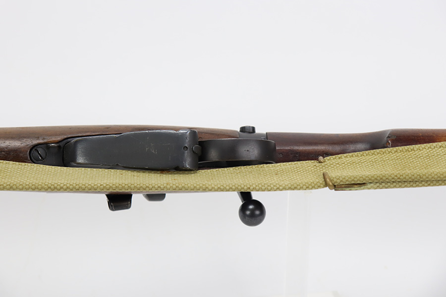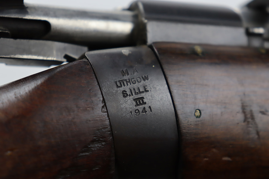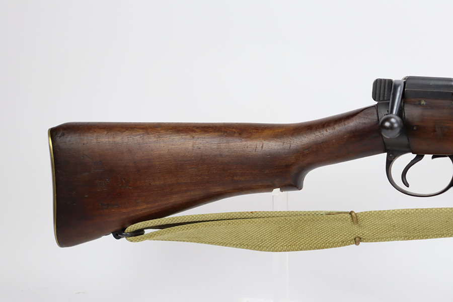 9/29/23 – This is a very nice Lithgow SMLE III from 1941. It is all matching with British proofs throughout. There is an “MAO SMLE III* HV 1944” marking on the left side of the butt stock. We assume this to mean it was reworked in 1944. The finish rates about 94% with just general minor high edge wear and some light scuffs here and there. Very nice wood stock that appears to have been lightly sanded. Minty bore. Comes with canvas sling.