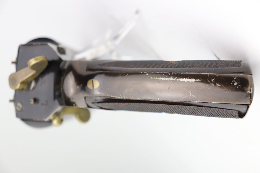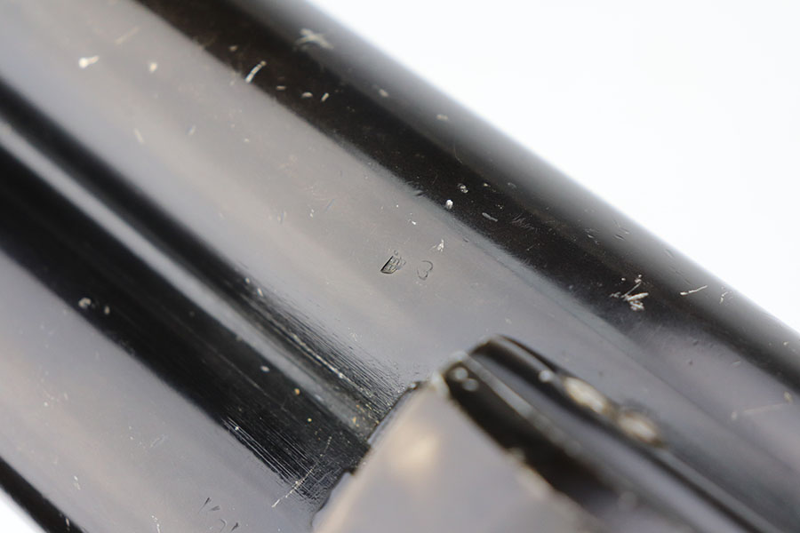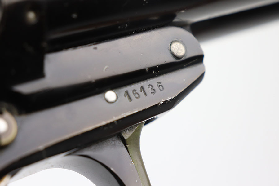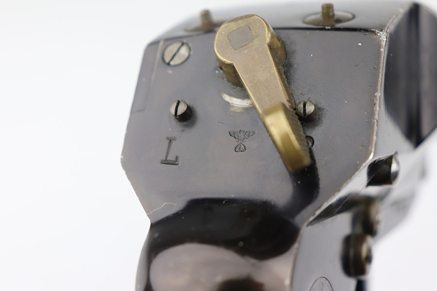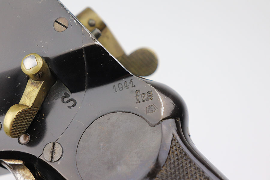 2/12/21 – This is a 1941 production double barrel Luftwaffe flare pistol. The flare pistol is 1941 dated and “fzs” maker stamped on the left side. Under the maker stamp is a droop winged luftwaffe eagle/2 proof stamp. The blued finish is in great overall condition with some brass finished small parts, as shown. Brass small parts is an earlier feature. Fully functional safety and barrel / trigger selector switch. Excellent dark brown bakelite grips. Fully functional with clean bores.