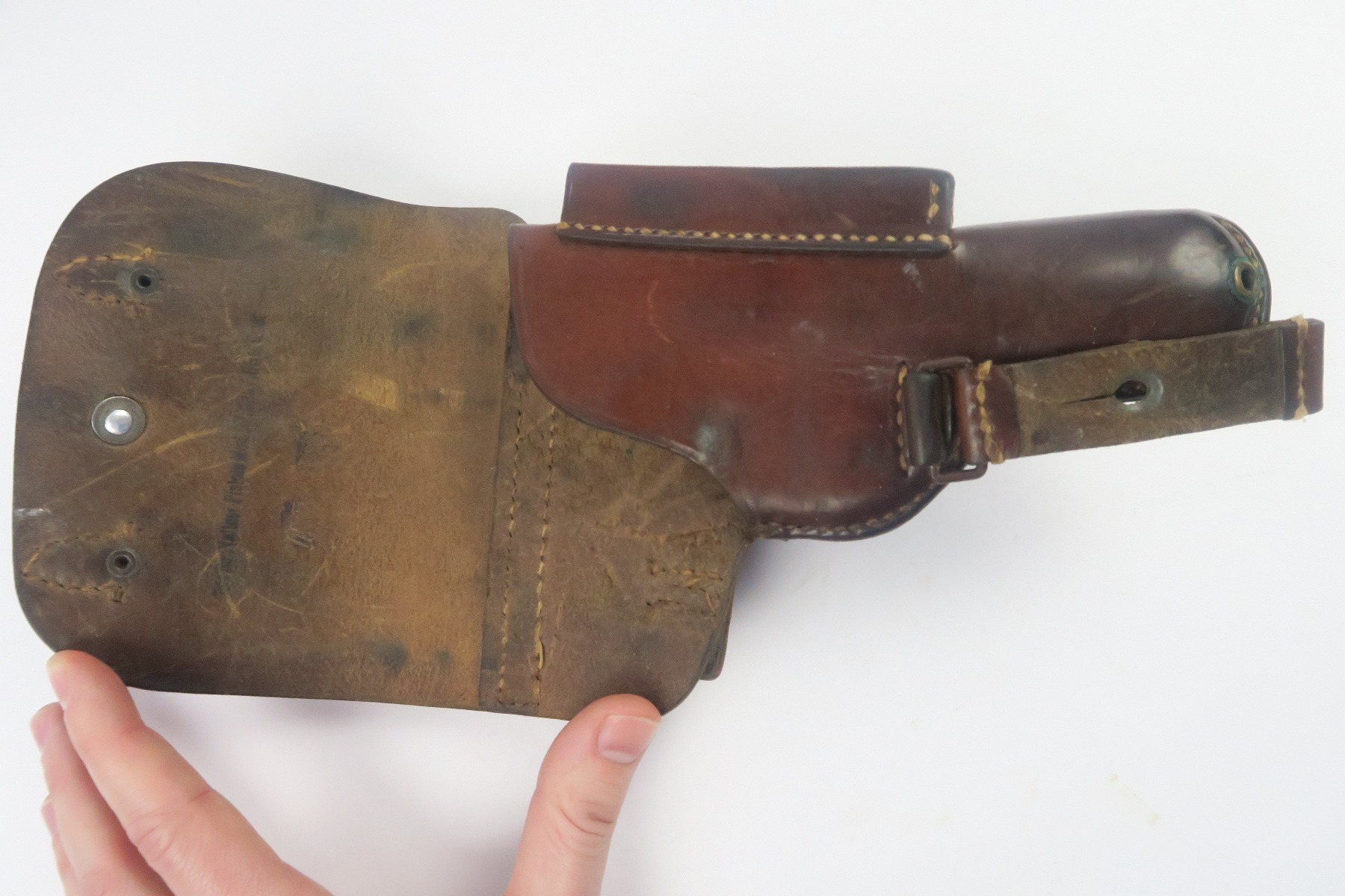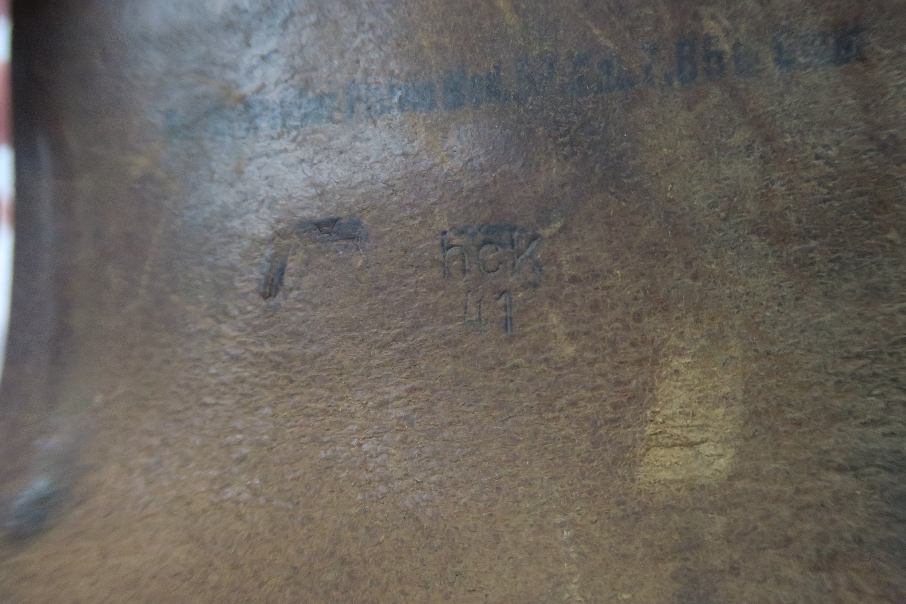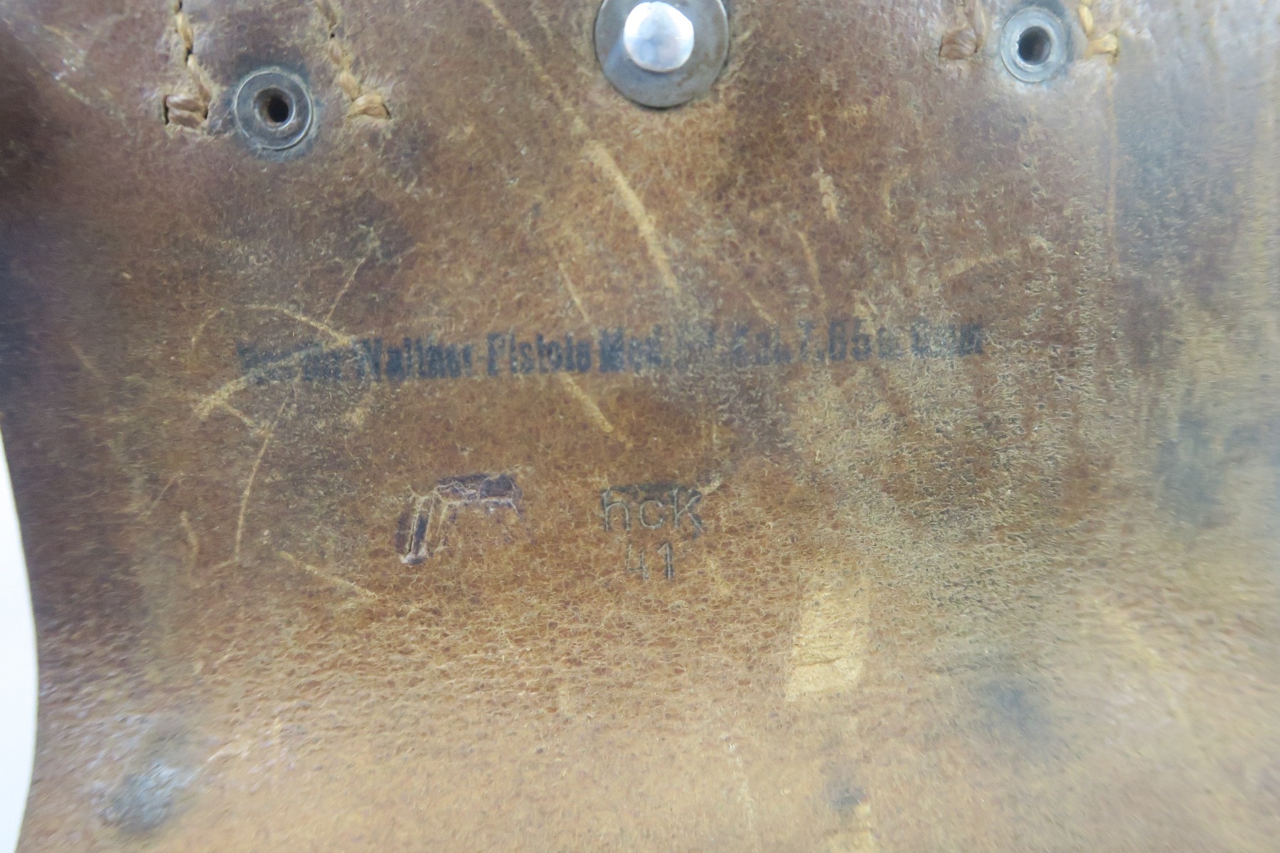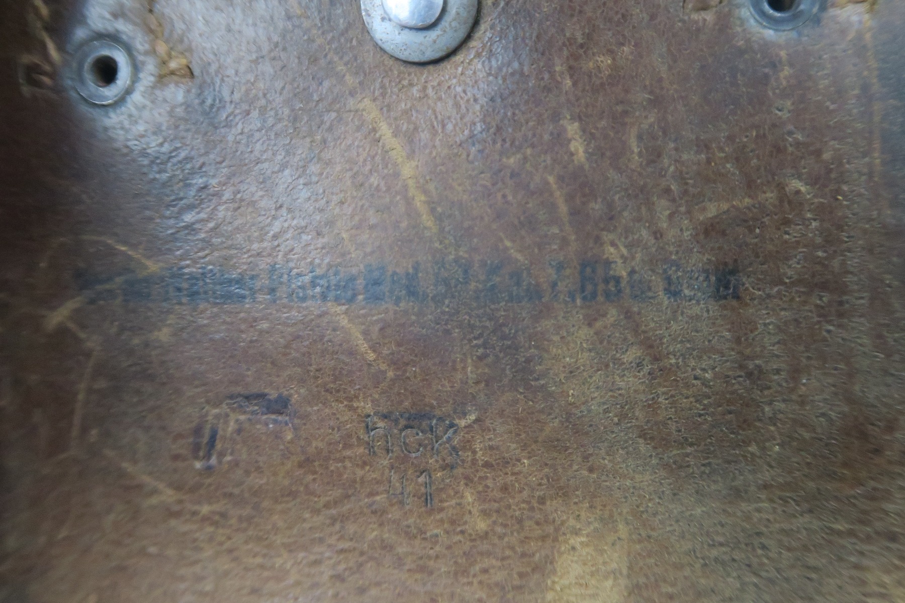 1/30/18 – This is a rare 1941 dated Luftwaffe PP dropping style holster. The dropping style is specific to the Luftwaffe, due to the lift straps on the exterior of the holster that were for pilots so they could have easier access to their sidearms if needed. This is the type II – with the lift straps on the exterior as opposed to the interior (as seen in the type I). The holster is in excellent condition with minimal wear. The front leather and top leather has light surface wrinkles, but none of these are excessive. The interior leather is fairly clean and the ink stamp is still in tact. The ink stamp clearly indicates this is for a Walther mod. PP 7.65 pistol. There is also an interior luftwaffe eagle stamp, “hck” maker stamp, and 1941 date. The stitching is all original and in tact with no notable flaws. Overall a very nice and rare holster. Guaranteed original .