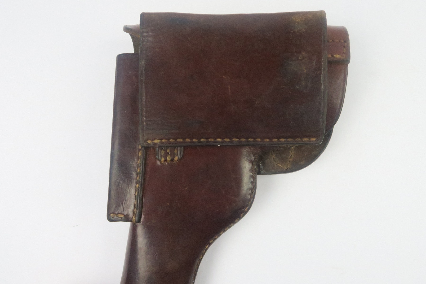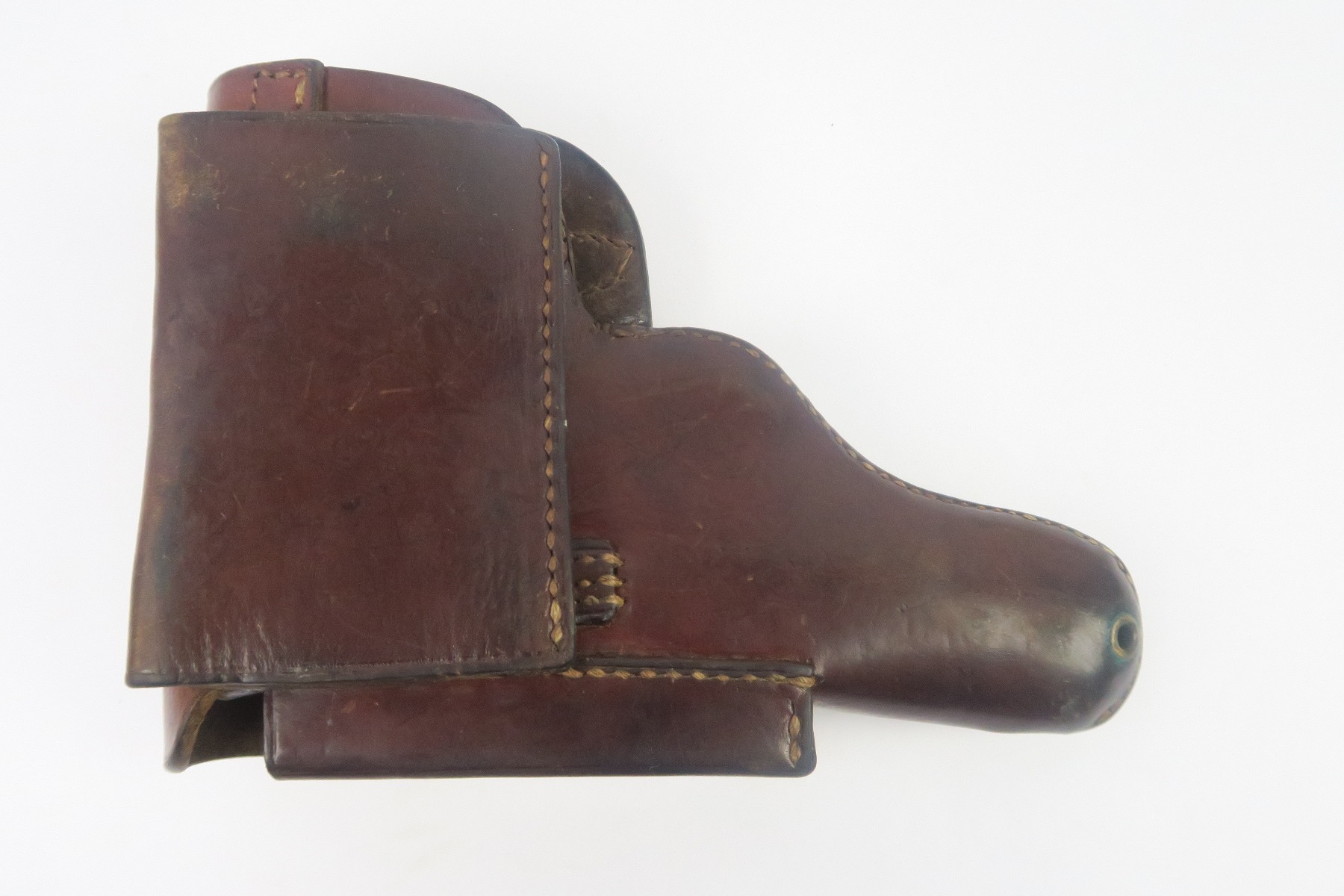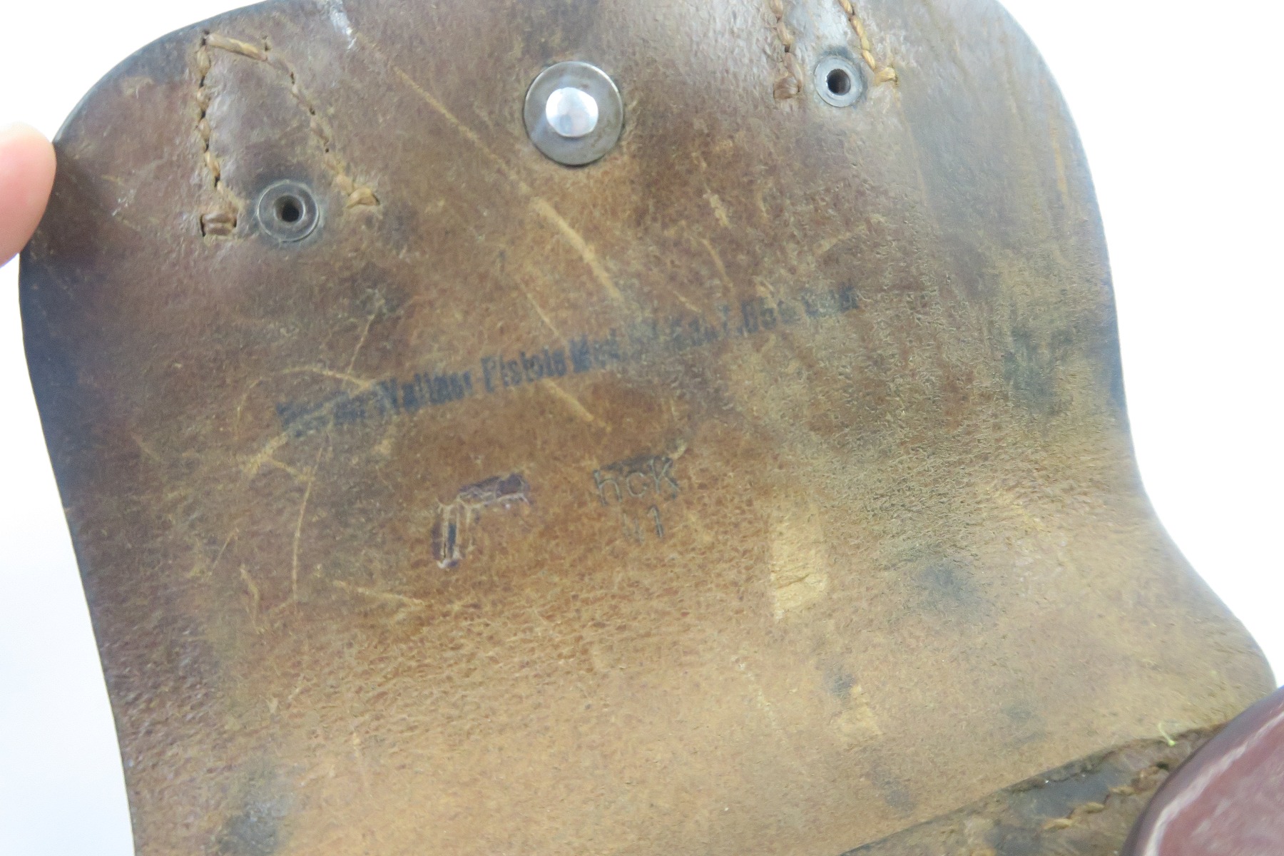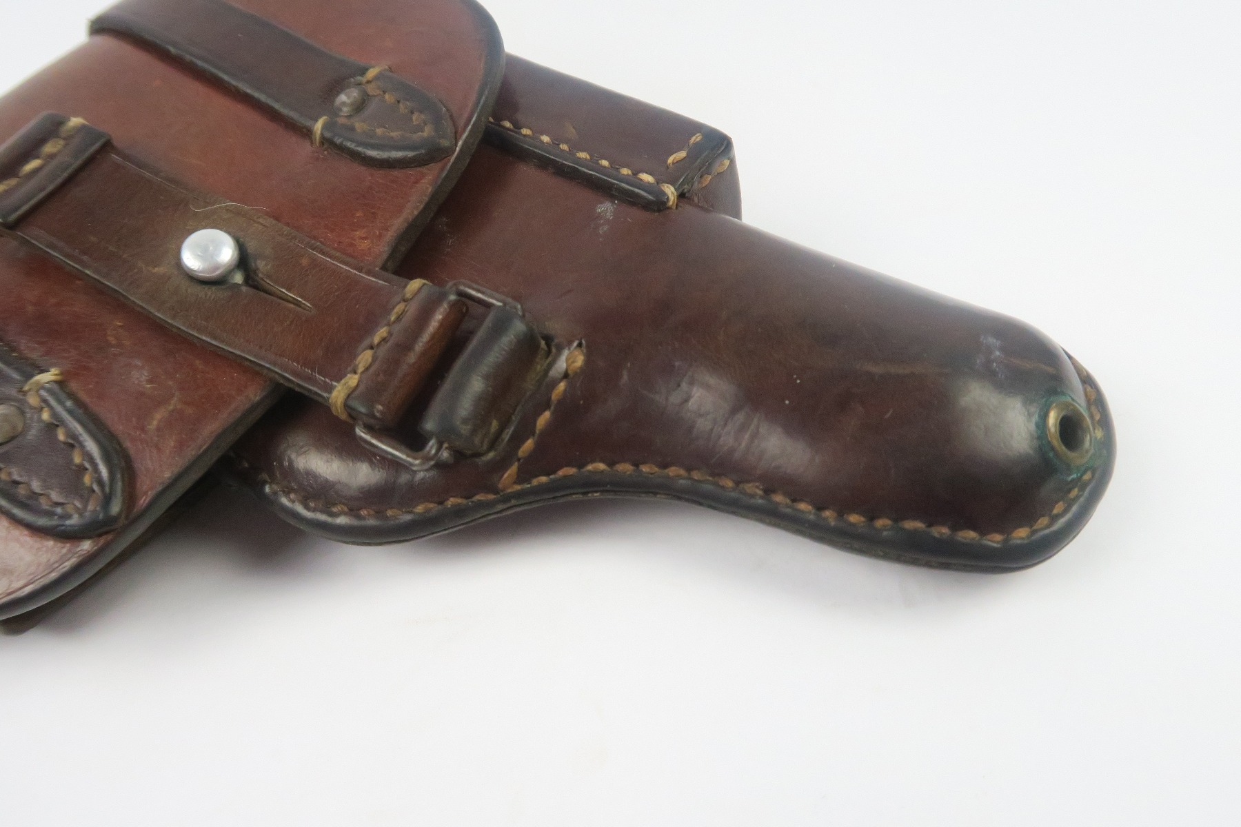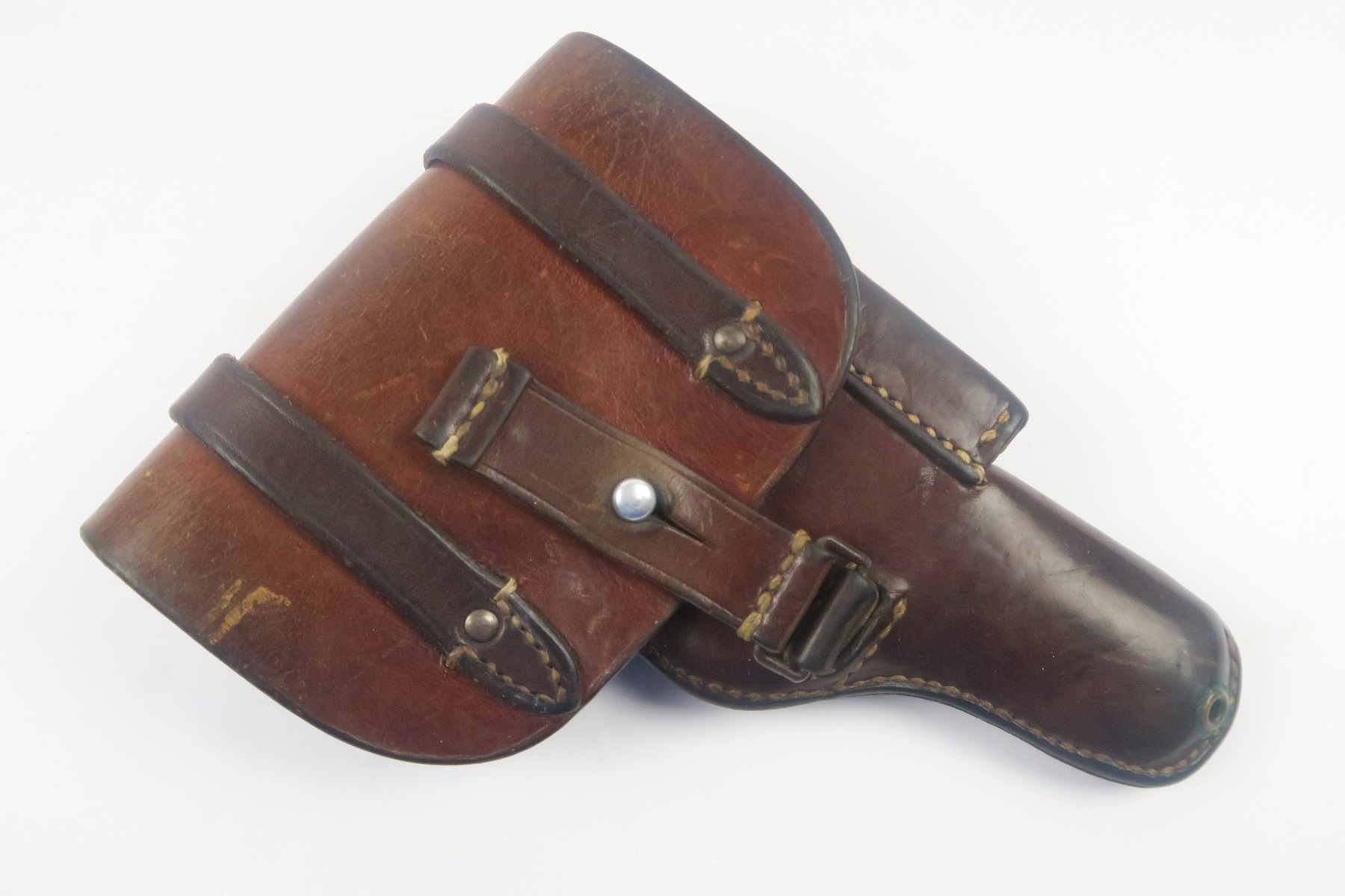 1/30/18 – This is a rare 1941 dated Luftwaffe PP dropping style holster. The dropping style is specific to the Luftwaffe, due to the lift straps on the exterior of the holster that were for pilots so they could have easier access to their sidearms if needed. This is the type II – with the lift straps on the exterior as opposed to the interior (as seen in the type I). The holster is in excellent condition with minimal wear. The front leather and top leather has light surface wrinkles, but none of these are excessive. The interior leather is fairly clean and the ink stamp is still in tact. The ink stamp clearly indicates this is for a Walther mod. PP 7.65 pistol. There is also an interior luftwaffe eagle stamp, “hck” maker stamp, and 1941 date. The stitching is all original and in tact with no notable flaws. Overall a very nice and rare holster. Guaranteed original .