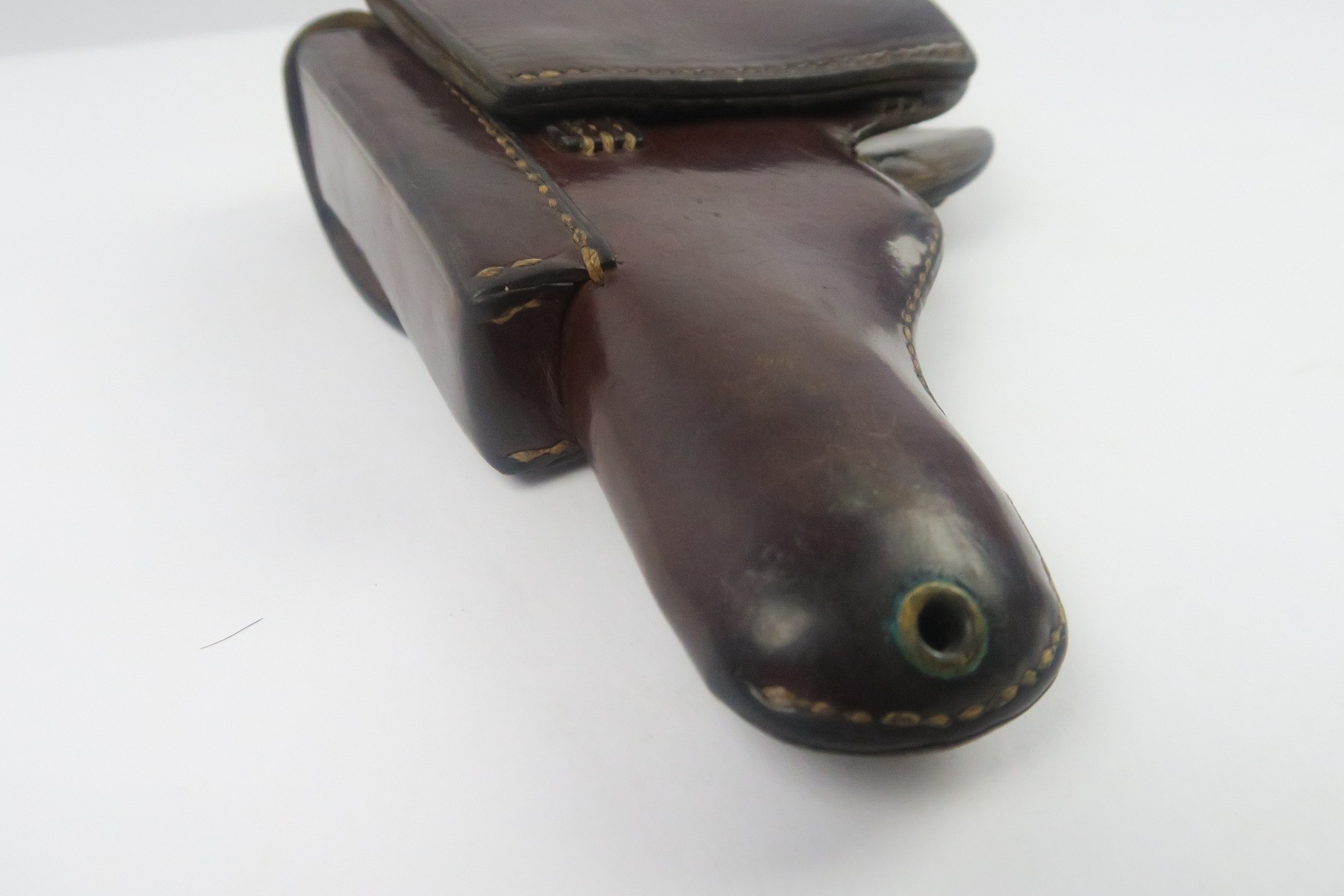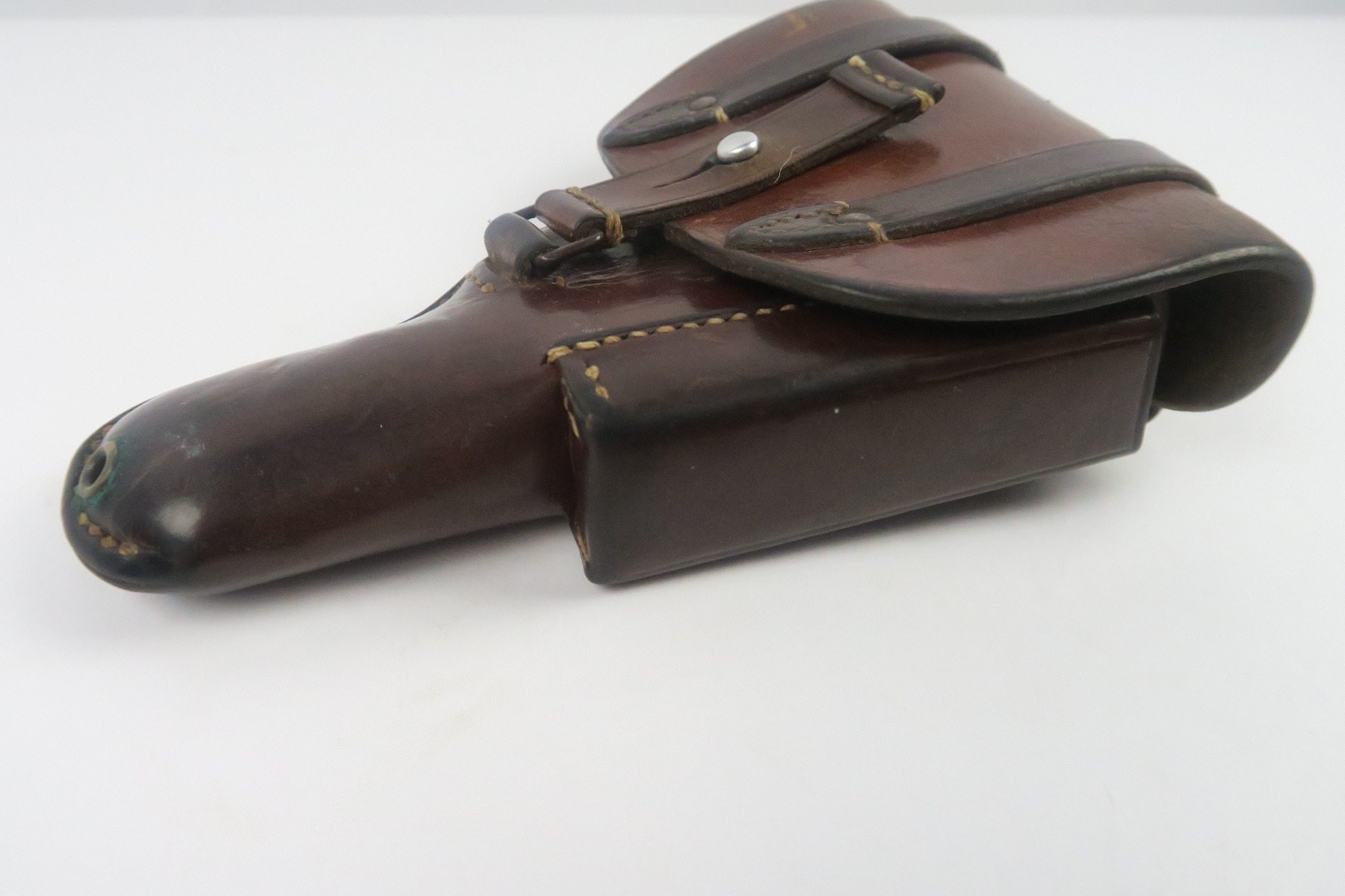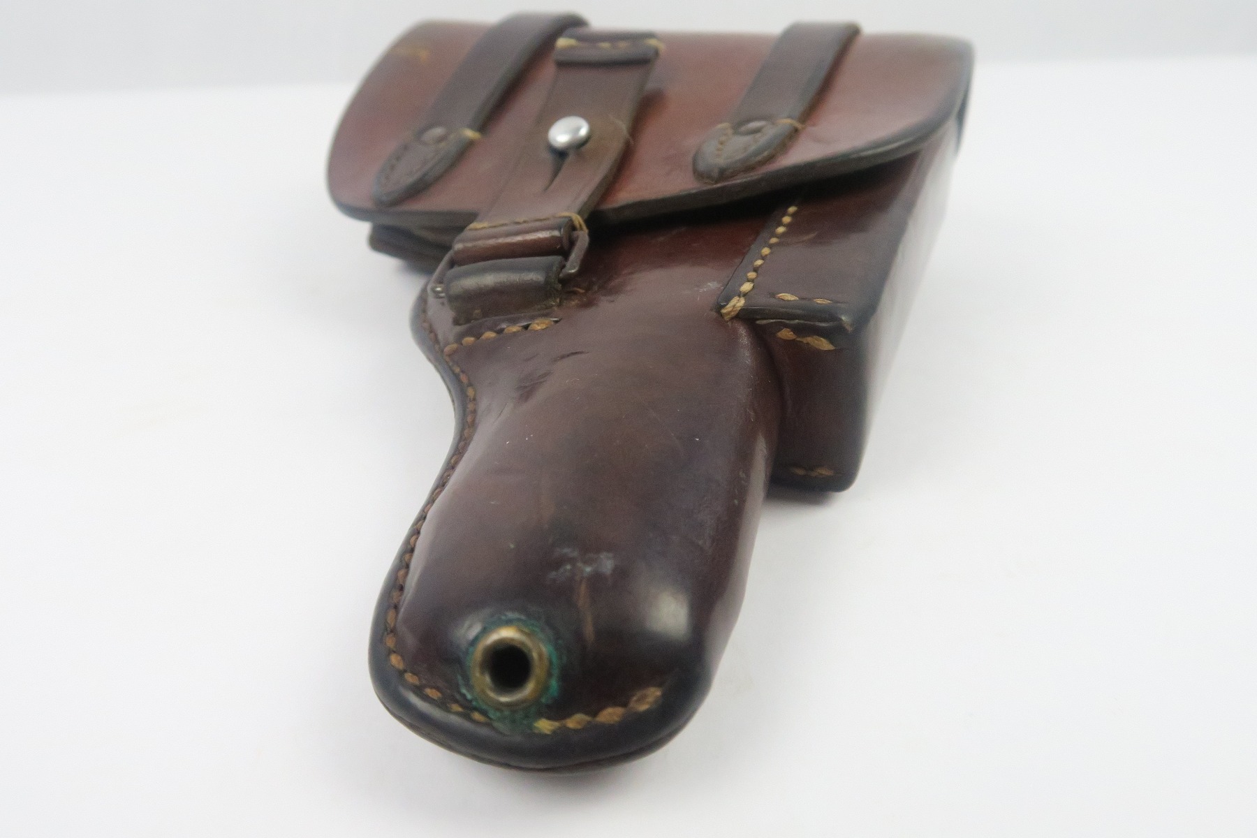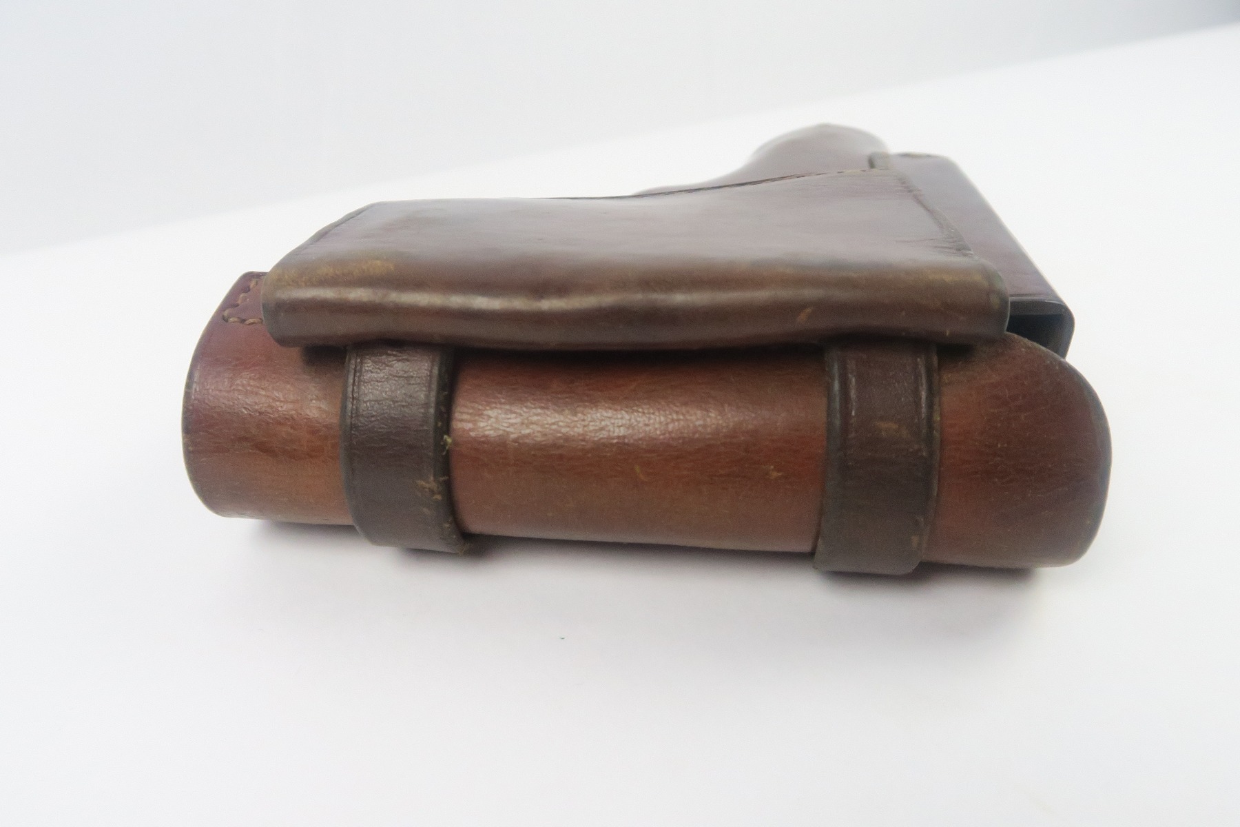 1/30/18 – This is a rare 1941 dated Luftwaffe PP dropping style holster. The dropping style is specific to the Luftwaffe, due to the lift straps on the exterior of the holster that were for pilots so they could have easier access to their sidearms if needed. This is the type II – with the lift straps on the exterior as opposed to the interior (as seen in the type I). The holster is in excellent condition with minimal wear. The front leather and top leather has light surface wrinkles, but none of these are excessive. The interior leather is fairly clean and the ink stamp is still in tact. The ink stamp clearly indicates this is for a Walther mod. PP 7.65 pistol. There is also an interior luftwaffe eagle stamp, “hck” maker stamp, and 1941 date. The stitching is all original and in tact with no notable flaws. Overall a very nice and rare holster. Guaranteed original .