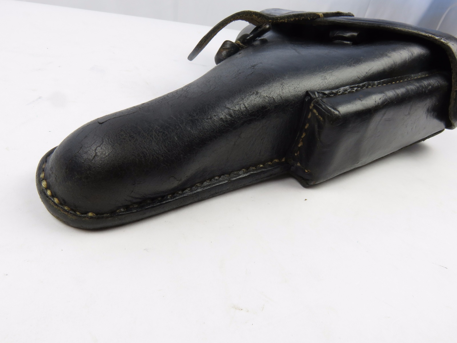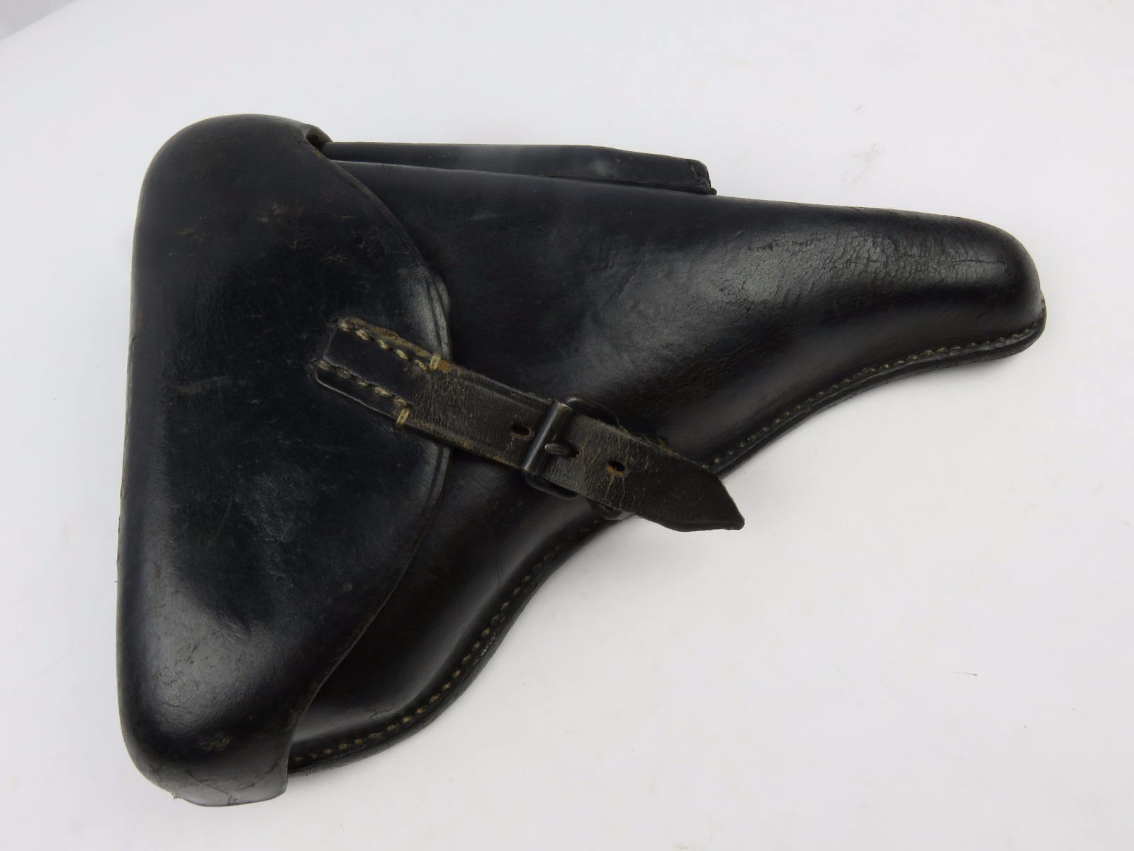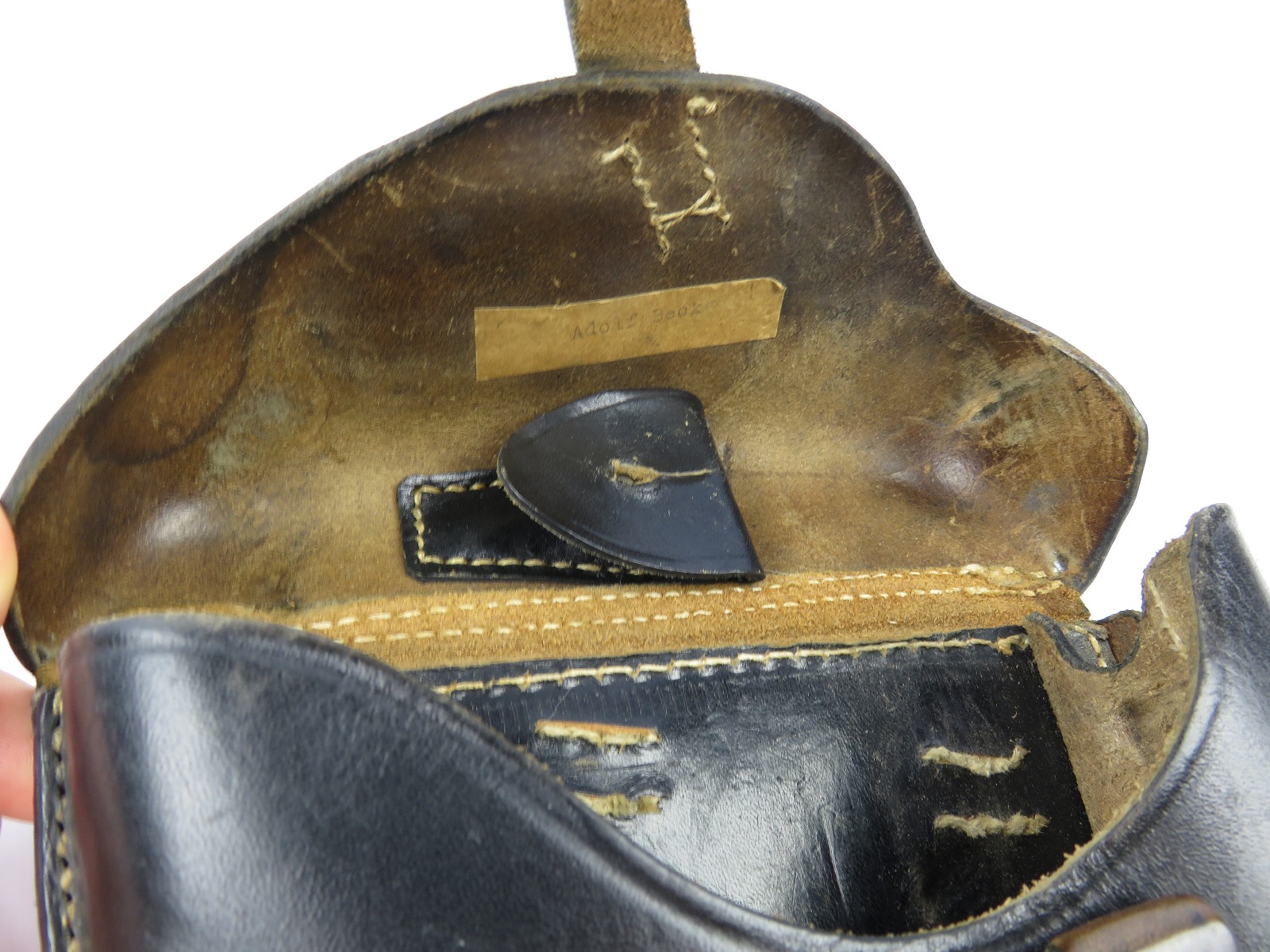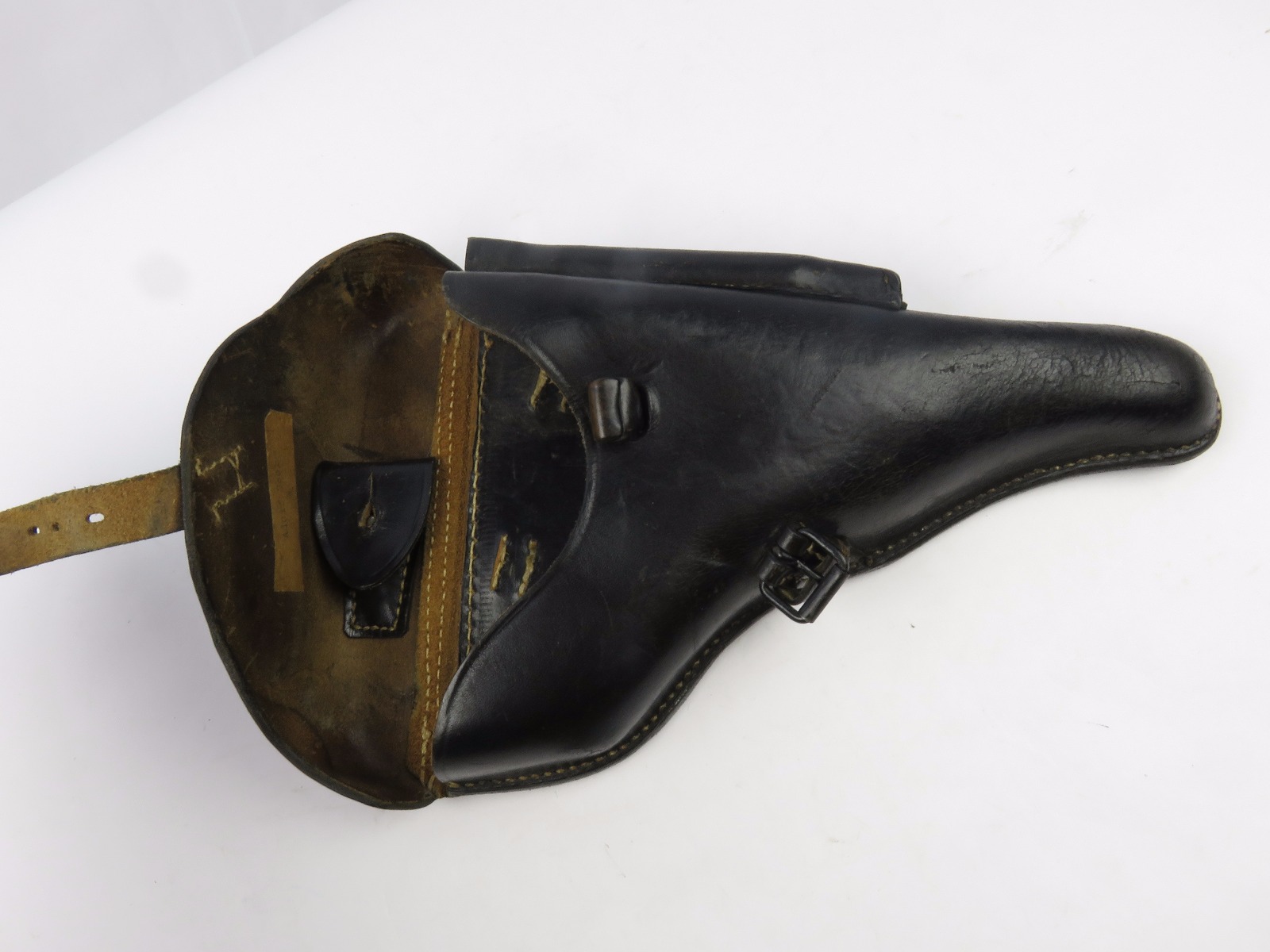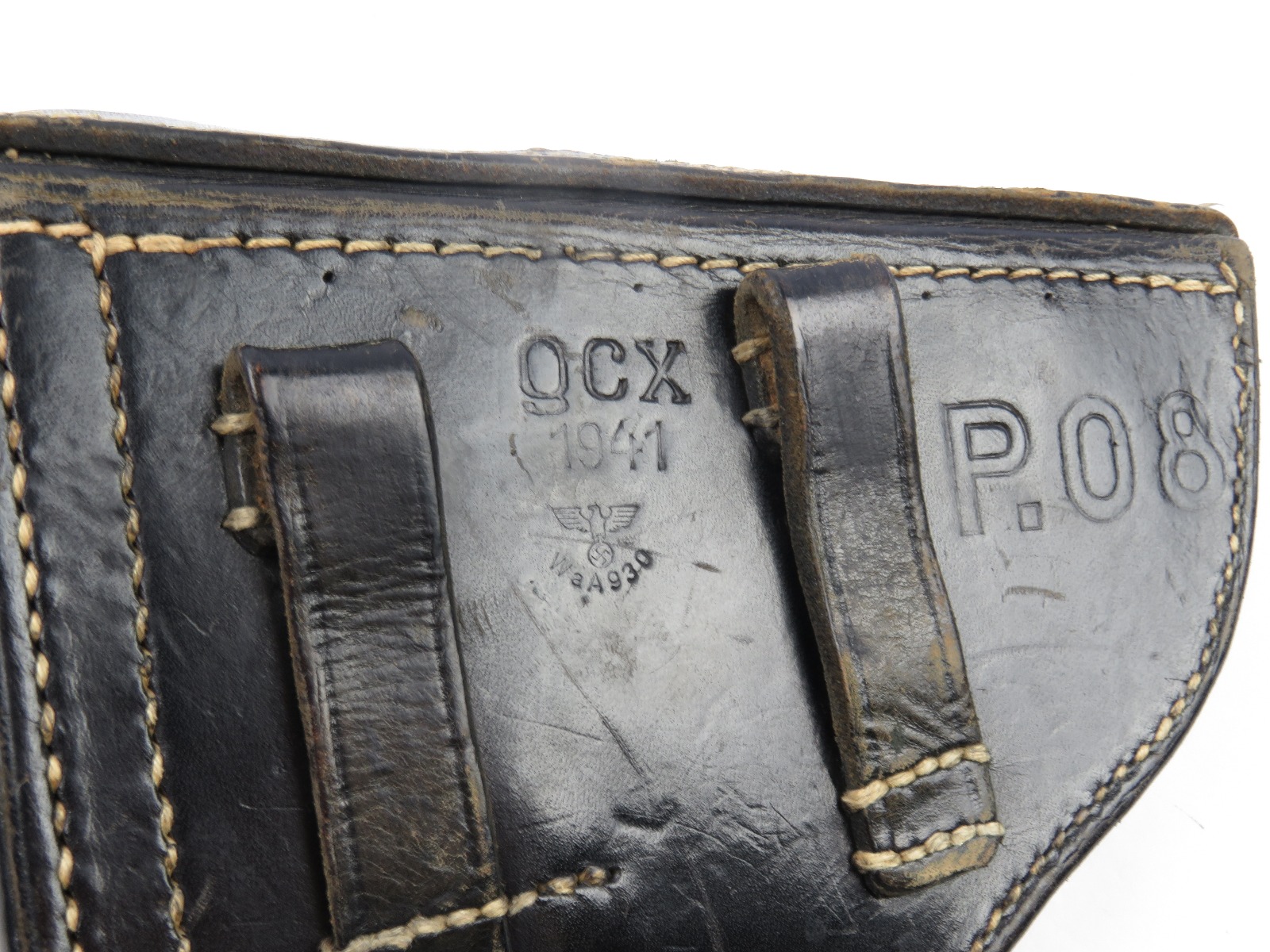 8/9/17 – This is an original WW2 era production Luger holster. The back of the holster is 1941 dated, gcx maker stamped, and waffen WaA930 military proof stamped. The black leather and date on this holster indicate this could potentially be a black widow holster. The black leather is in great shape with moderate pliability and mild wear. The front toe of leather has the surface wrinkling, and beginning signs of cracking, but no serious cracking or damage. The stitching is all tight and original with no issues. The interior leather is fairly clean, and has a German name tag affixed inside. Guaranteed original.