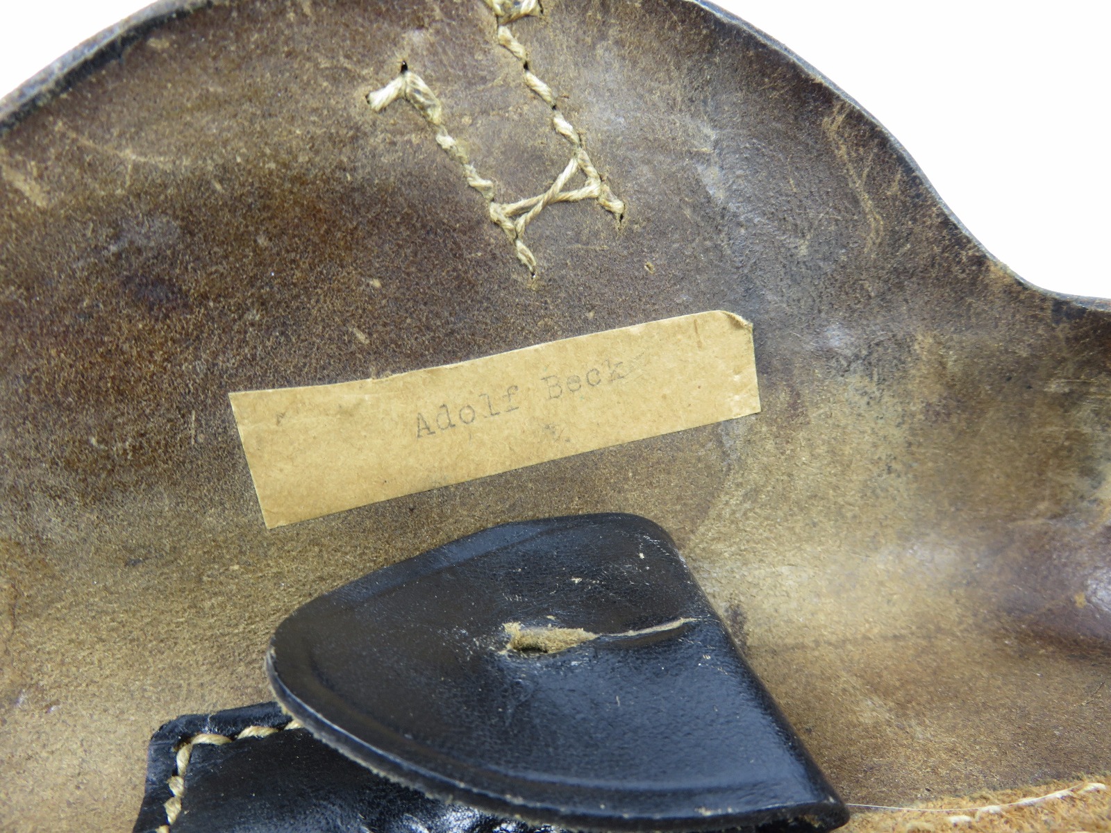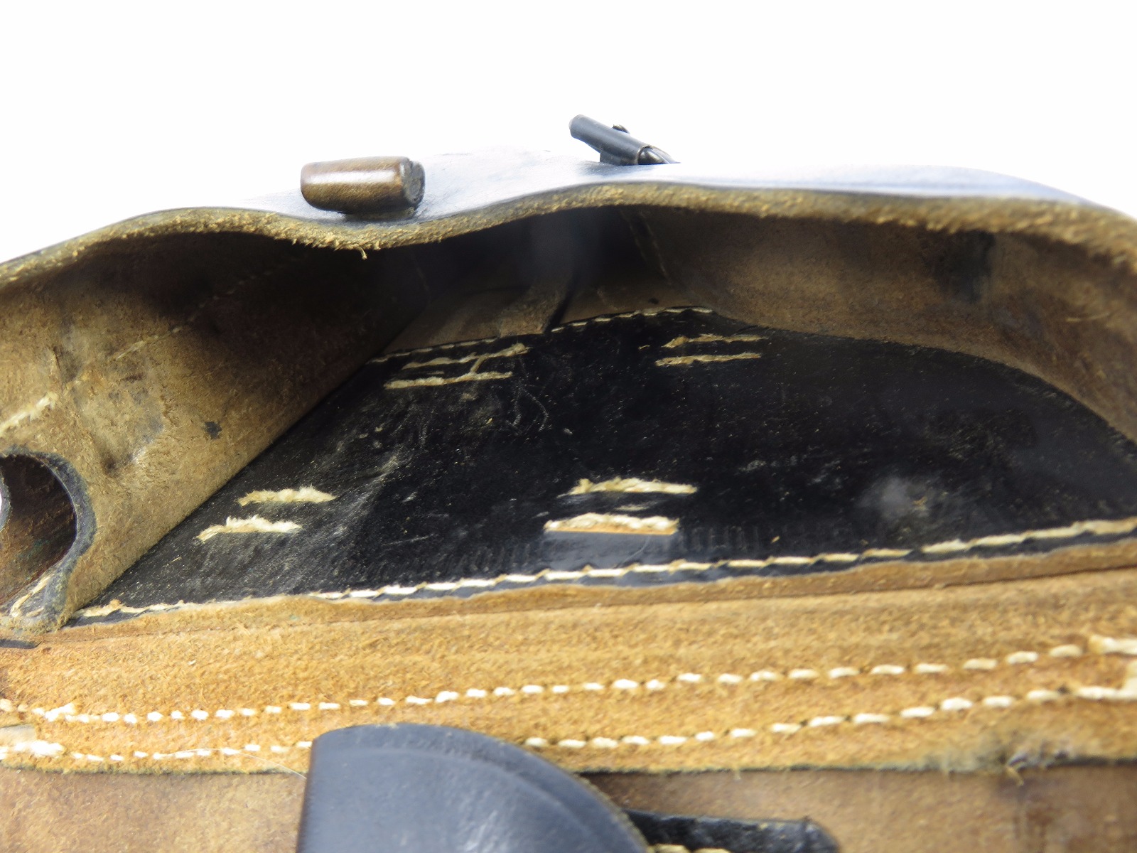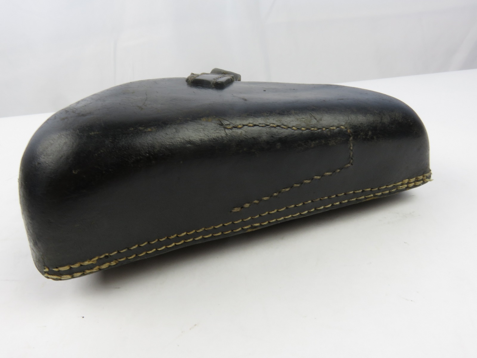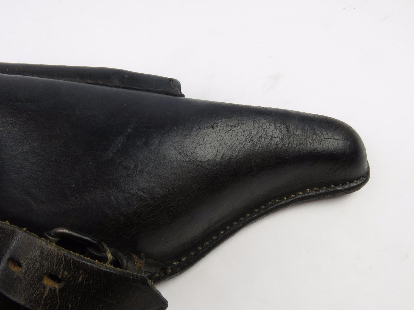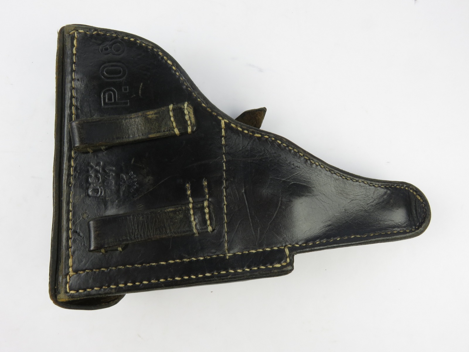 8/9/17 – This is an original WW2 era production Luger holster. The back of the holster is 1941 dated, gcx maker stamped, and waffen WaA930 military proof stamped. The black leather and date on this holster indicate this could potentially be a black widow holster. The black leather is in great shape with moderate pliability and mild wear. The front toe of leather has the surface wrinkling, and beginning signs of cracking, but no serious cracking or damage. The stitching is all tight and original with no issues. The interior leather is fairly clean, and has a German name tag affixed inside. Guaranteed original.