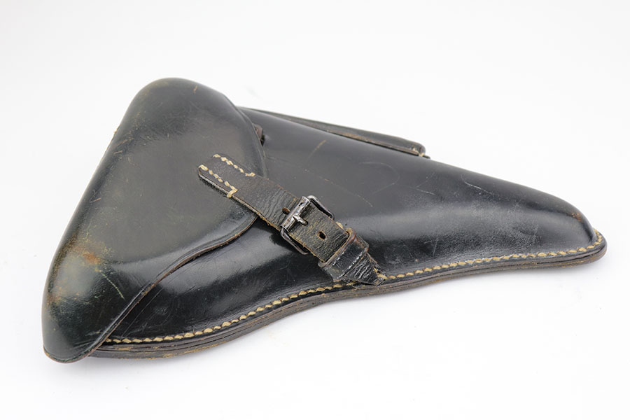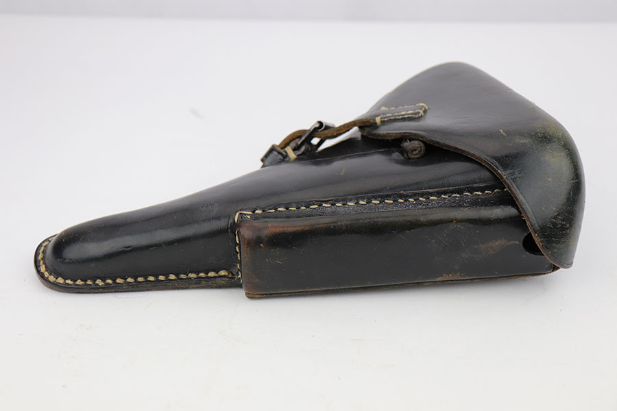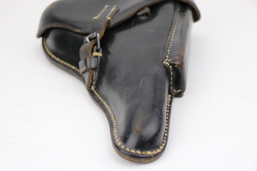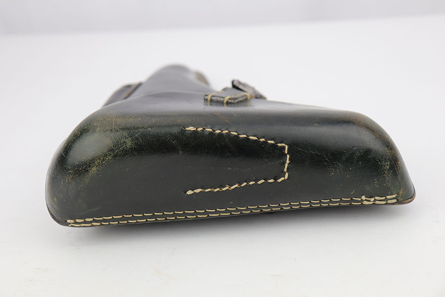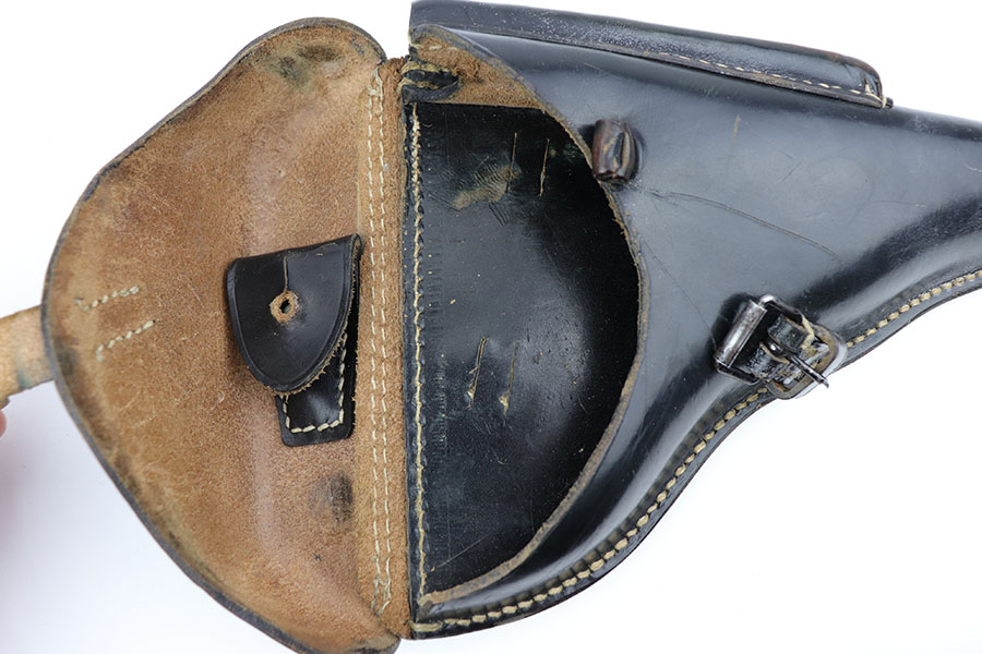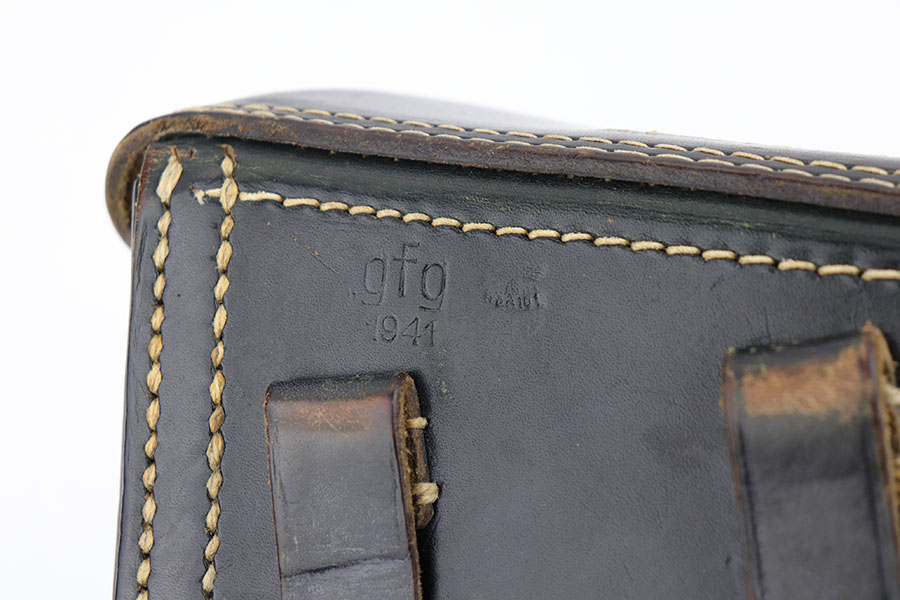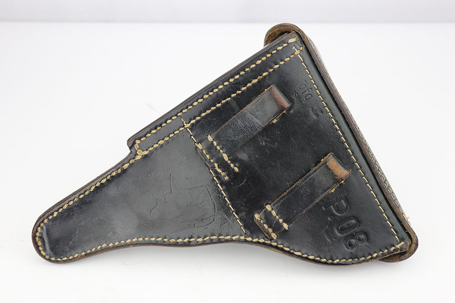 9/3/19 – This is an original 1941 dated Luger P.08 holster from WWII. The holster is in great overall condition with all original leather and stitching. The back of the holster is maker coded “gfg” and dated 1941 next to a waffen military eagle proof stamp. The back leather is also stamped “P.08”. The black leather has minimal exterior wear / scuffing and a very clean interior. All original stitching is tight and in tact.