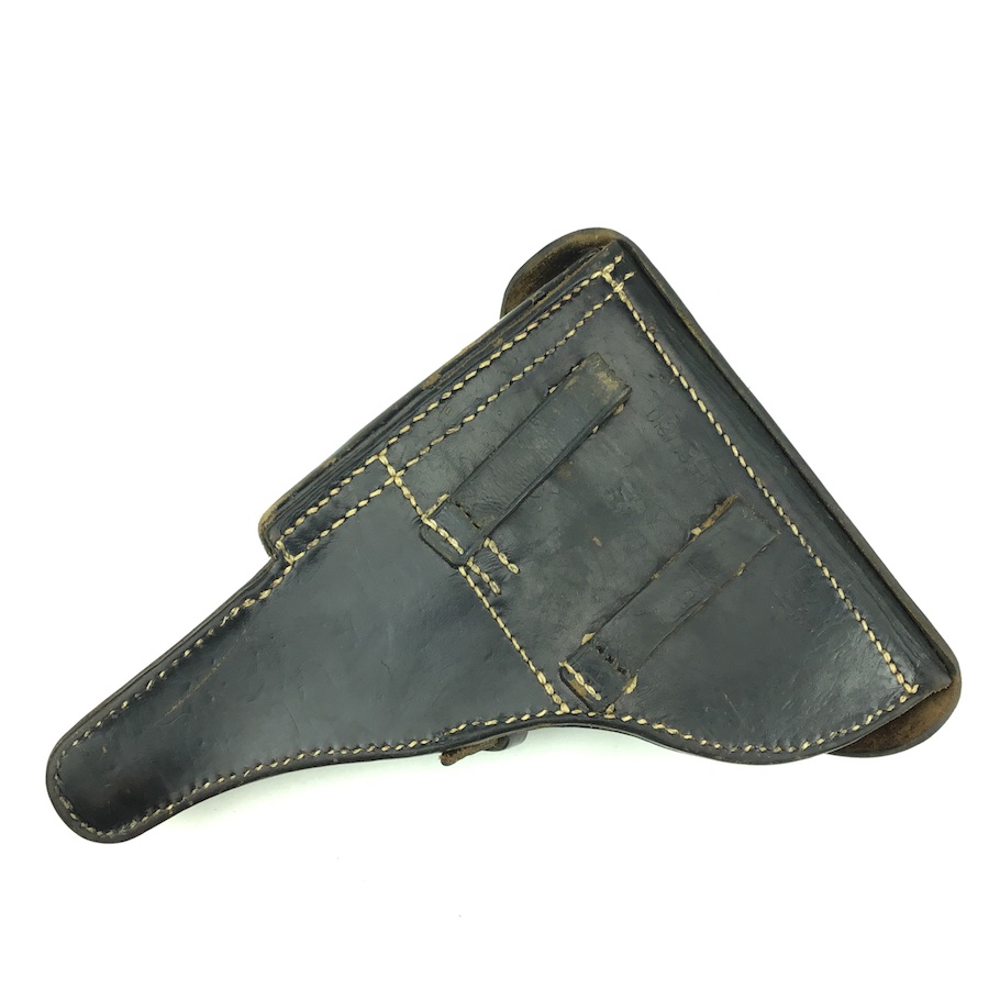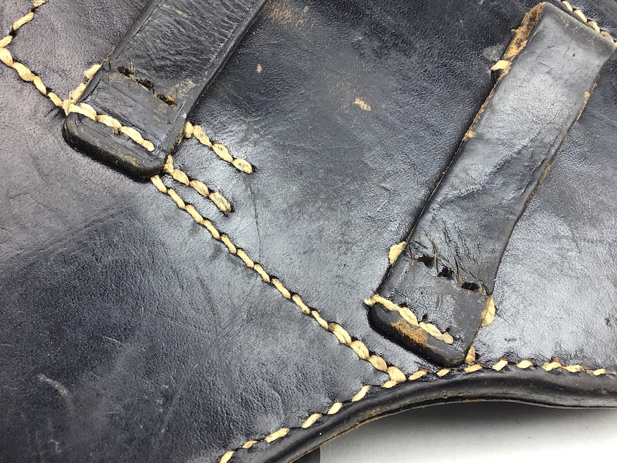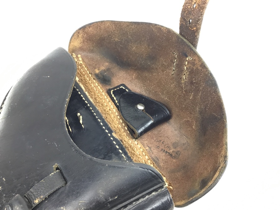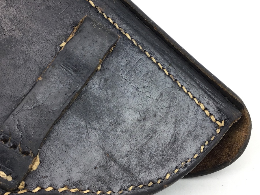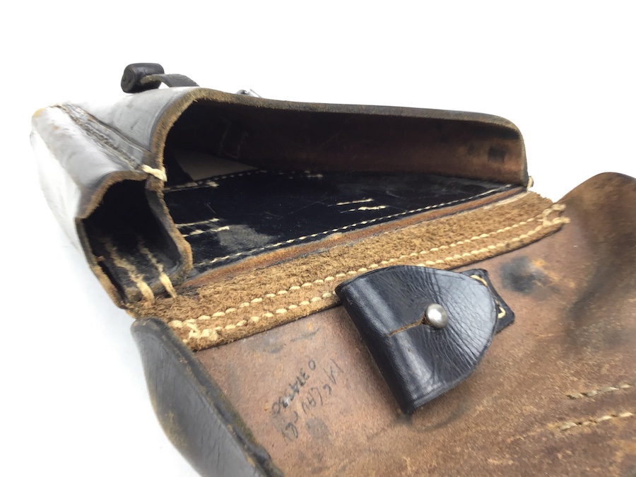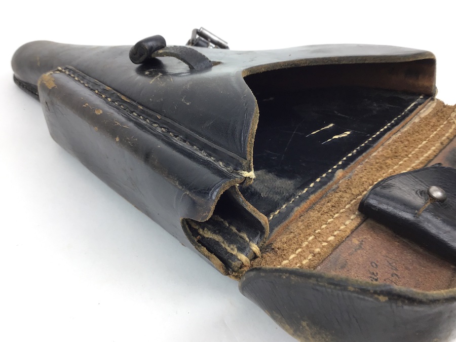 4/8/20 – This is a good condition 1941 dated, P.08 Luger holster. The holster is “bla” made and waffen military proof stamped. Although the stamp is faint, it is visible just below the maker stamp. These are most commonly seen with Black Widow Lugers. This holster has very strong leather that is minimally pliable. The black leather has minimal wrinkling as well, mostly on the closure strap. Most of the wear and scuffing is on the closure flap. One short row of stitching is missing from the bottom belt loops, however, the loops are secure. The interior leather is clean with a secure lift strap.