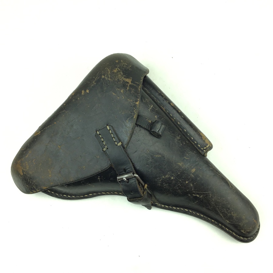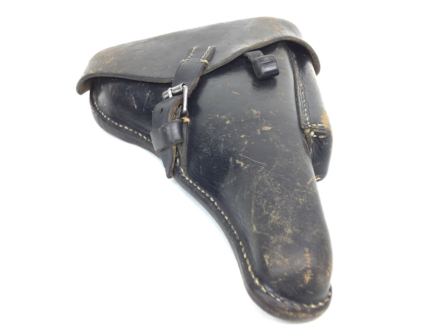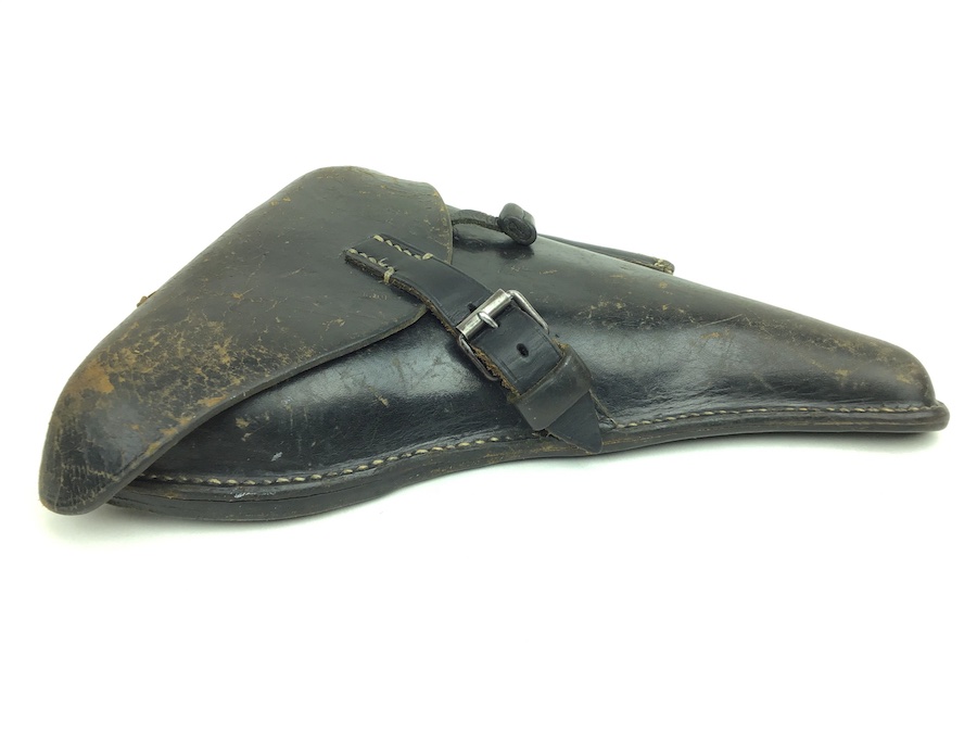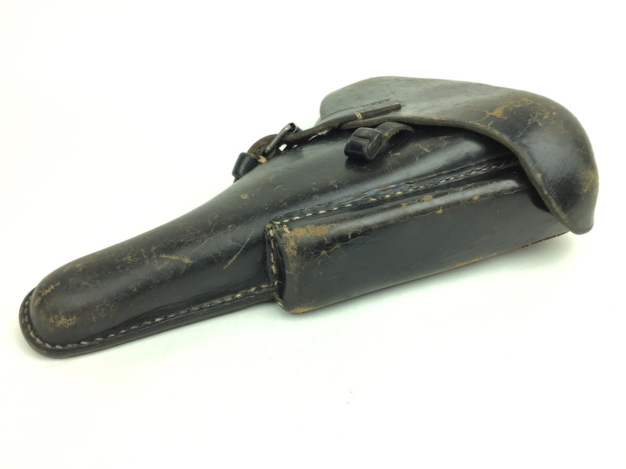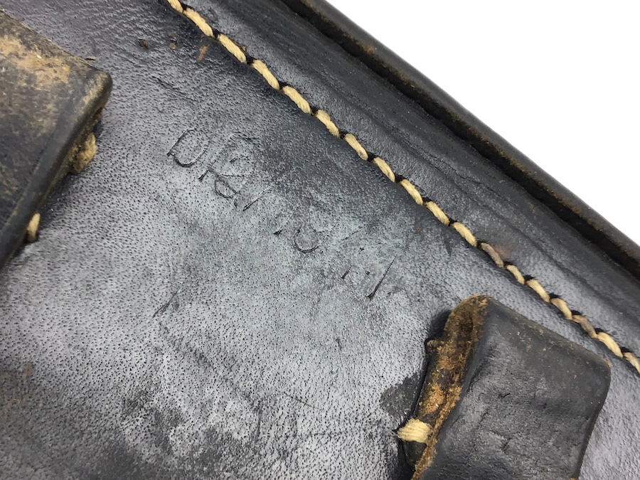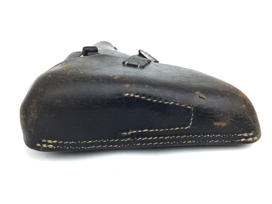 4/8/20 – This is a good condition 1941 dated, P.08 Luger holster. The holster is “bla” made and waffen military proof stamped. Although the stamp is faint, it is visible just below the maker stamp. These are most commonly seen with Black Widow Lugers. This holster has very strong leather that is minimally pliable. The black leather has minimal wrinkling as well, mostly on the closure strap. Most of the wear and scuffing is on the closure flap. One short row of stitching is missing from the bottom belt loops, however, the loops are secure. The interior leather is clean with a secure lift strap.