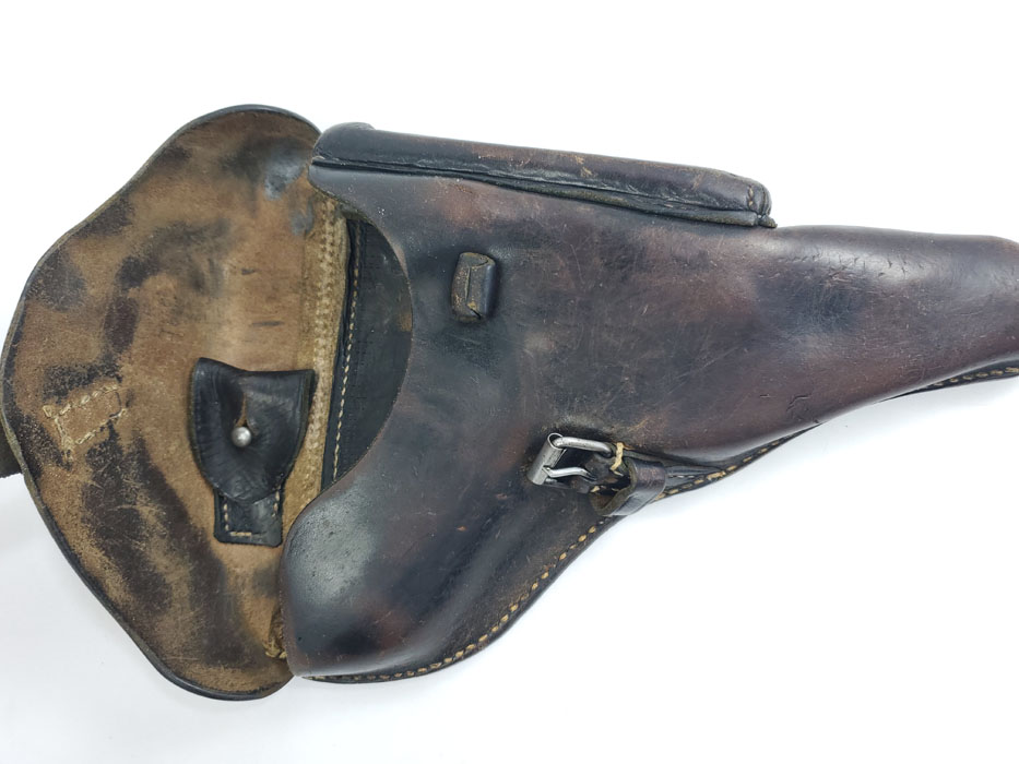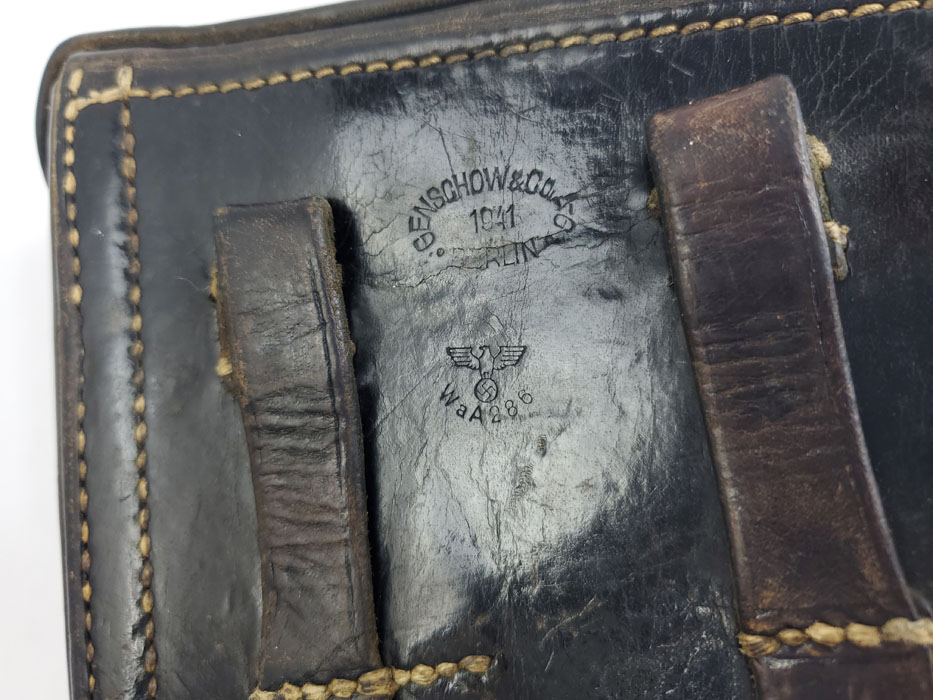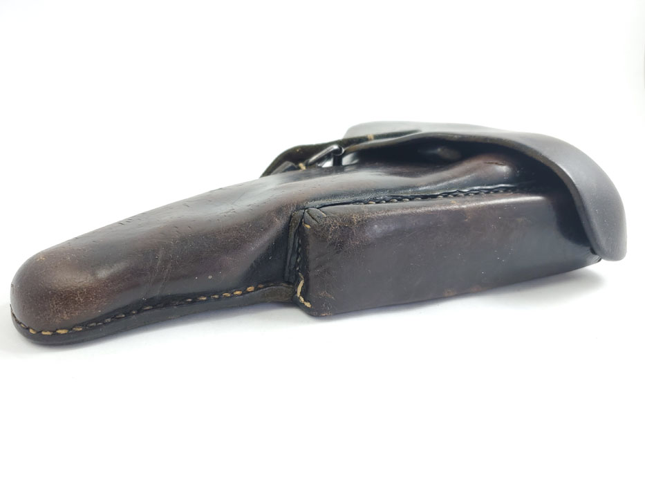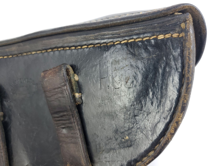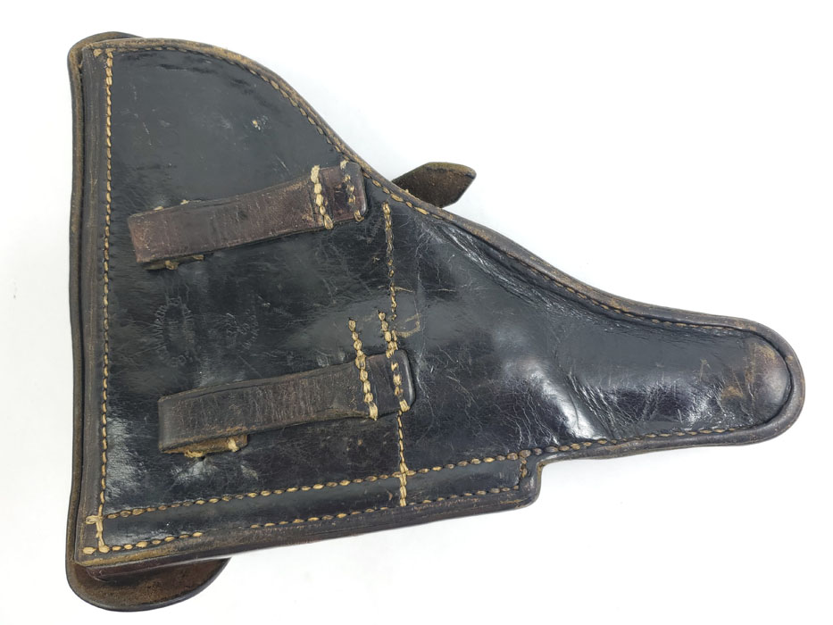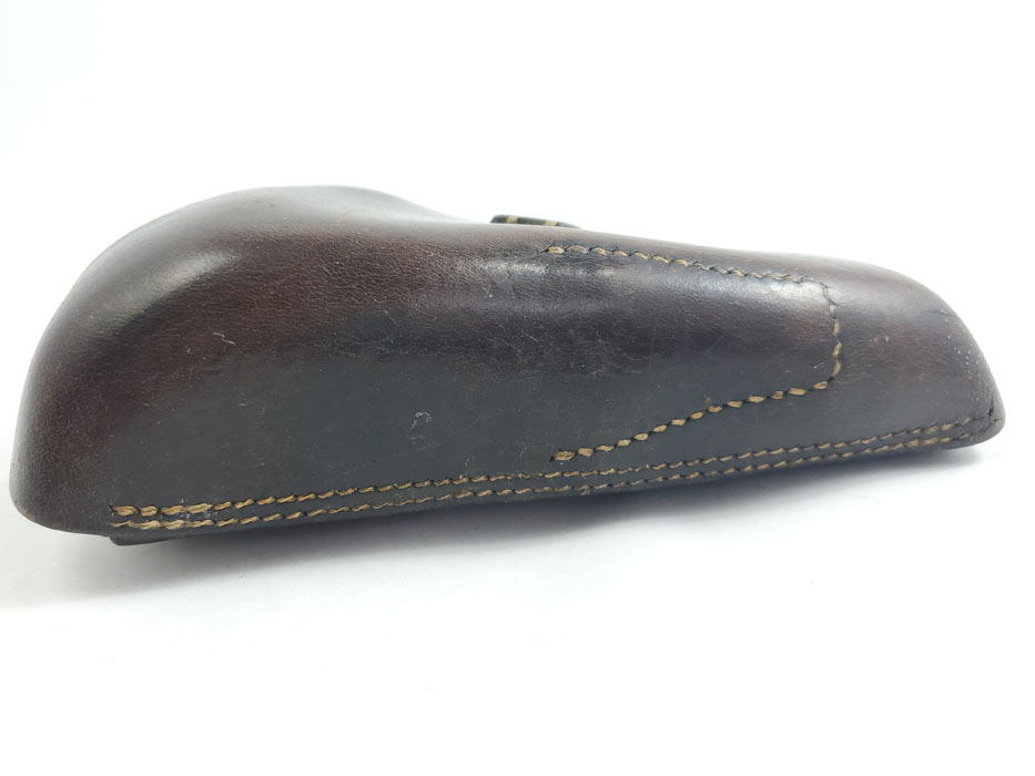5/23/20 – This is an original 1941 Luger holster from WW2. The holster is maker stamped, dated, and waffen proofed on the back leather. The leather is soft and very pliable but in tact with no major flaws. This holster would have been dyed black, but most of the black dye is missing from the front leather. The back leather still shows a lot of the black finish. The stitching is all original and i tact as well.