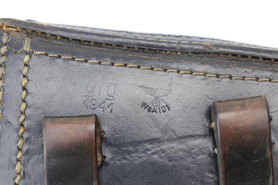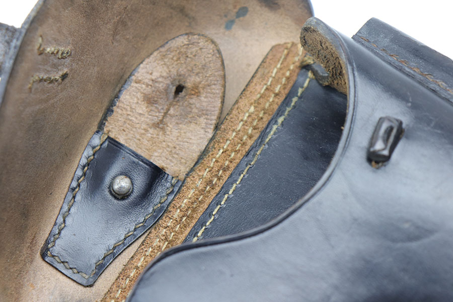 8/28/20 – This is an excellent 1941 black luger holster. The holster has very nice, lightly pliable leather and all original stitching in tact. The leather has some surface wrinkling a light scuffing on the lid, and mild cracking on the closure strap but is solid. Interior leather is clean.
