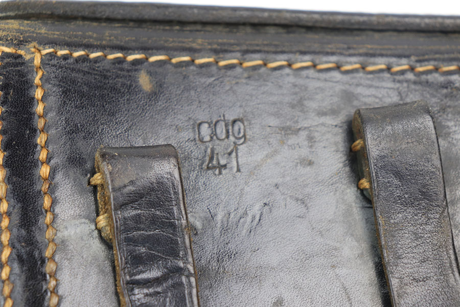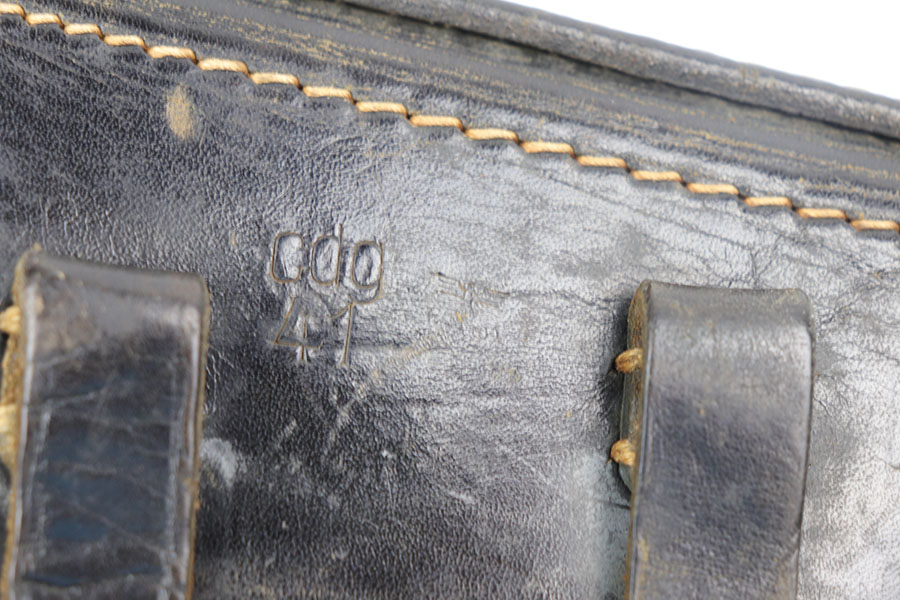 10/28/20 – This is an original 1941 dated Luger holster from WW2. Nice black leather with normal pliability and all original stitching in tact. Light wrinkling near the toe. The back of the holster is maker stamped and dated with a faint waffen proof stamp and P.08 stamp. Clean interior leather.