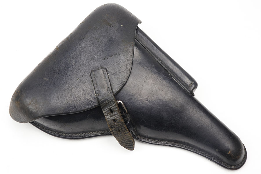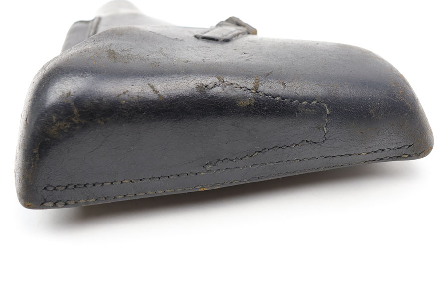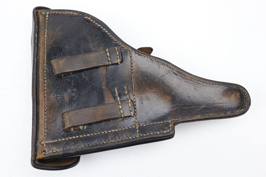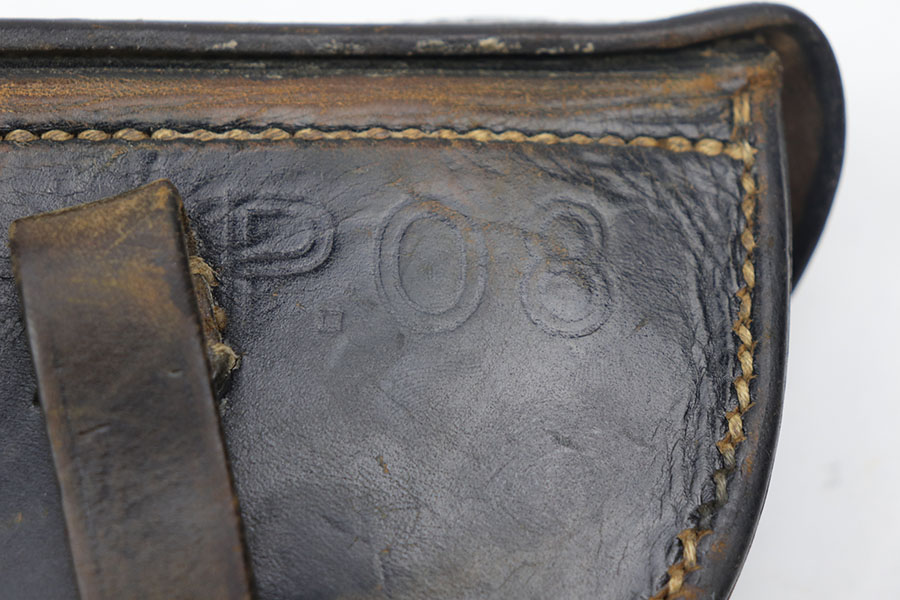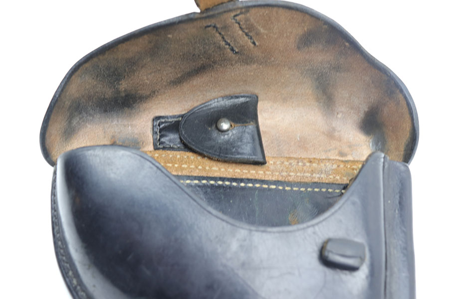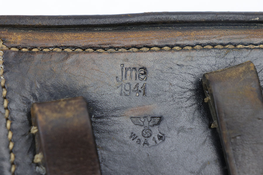 11/19/20 – This is an original 1941 luger holster. The back of the holster is maker stamped “jme” and dated 1941. Also waffen stamped and P.08 stamped. The black leather has normal pliability and some very light surface wrinkling / cracking on the lid. Clean interior leather and all original stitching in tact.