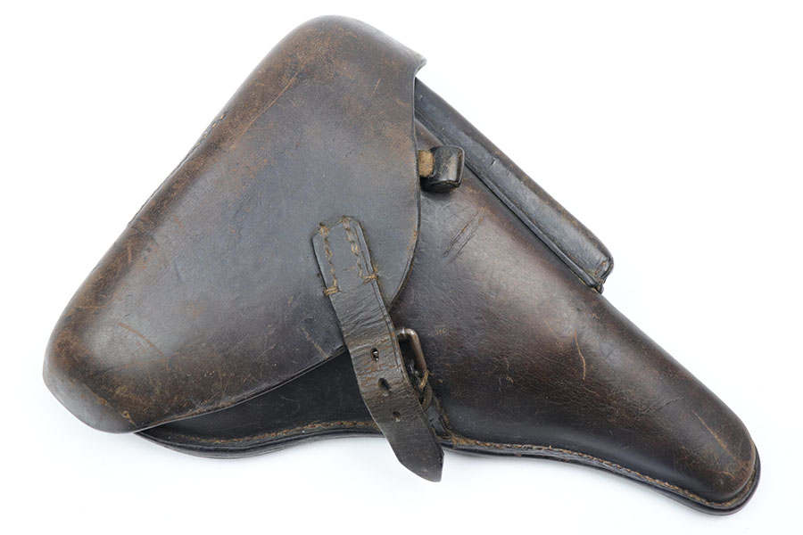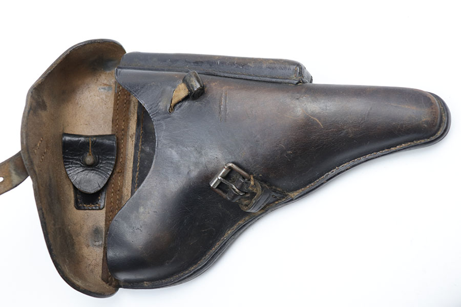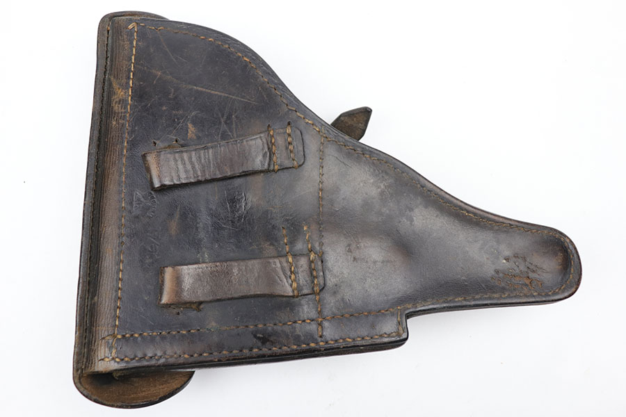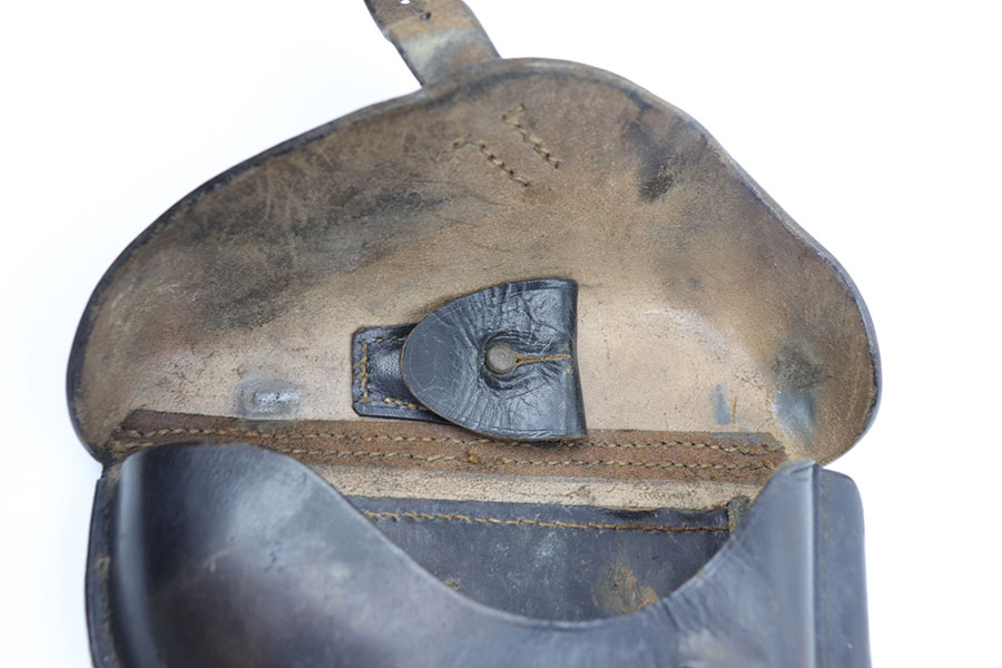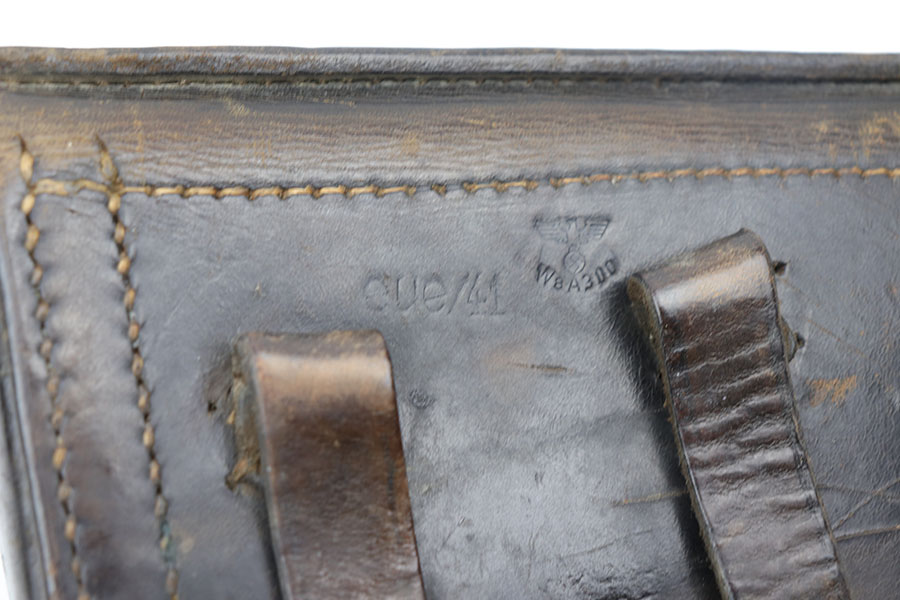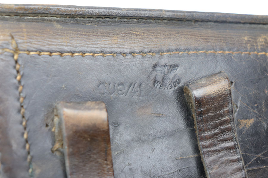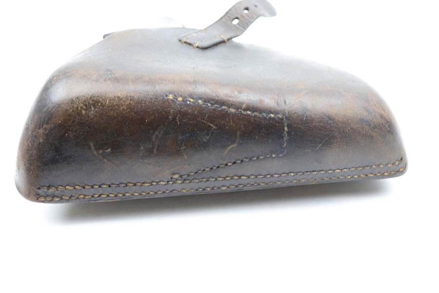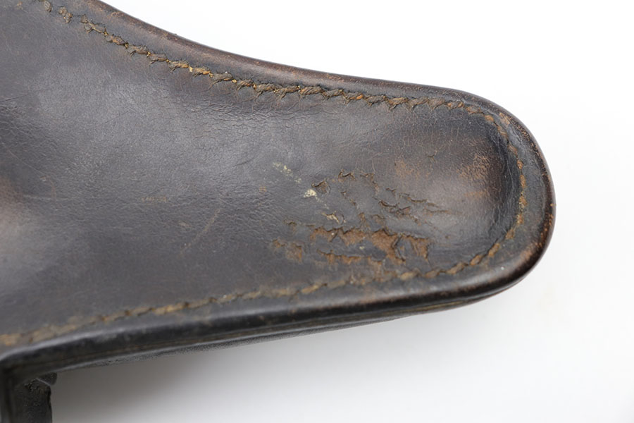 12/7/20 – This is an original 1941 dated Luger holster from WW2. The back leather is “eue” maker stamped with a ’41 date, waffen proof stamp, and P.08 stamp. The leather has some exterior scuffing, but this is normal. Some light surface scratches near the toe of the holster. The stitching is all tight and original with no stitching issues. The interior leather is very clean. No major flaws.