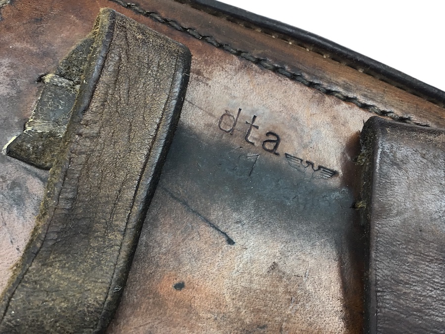 2/10/21 – This is a very good condition 1941 dated, P.08 Luger holster. The holster is “dta” made and waffen military proof stamped. Although the waffen stamp is somnewhat worn, it is still visible. This holster has very strong leather that is minimally pliable, and has surface scuffs and marks. The leather has minimal wrinkling, mostly on the closure strap. The interior leather is clean with a secure lift strap. Intact original stitching.