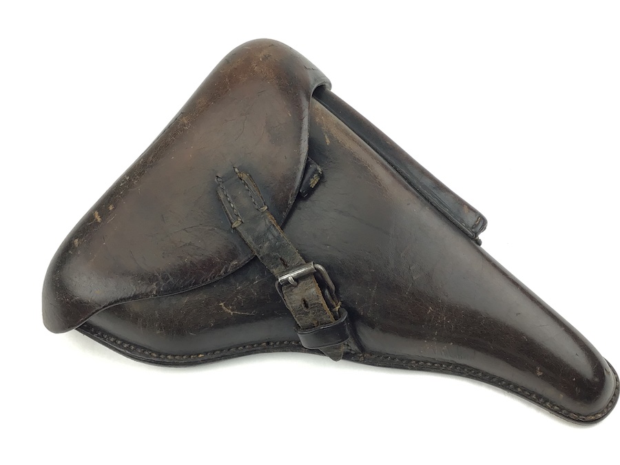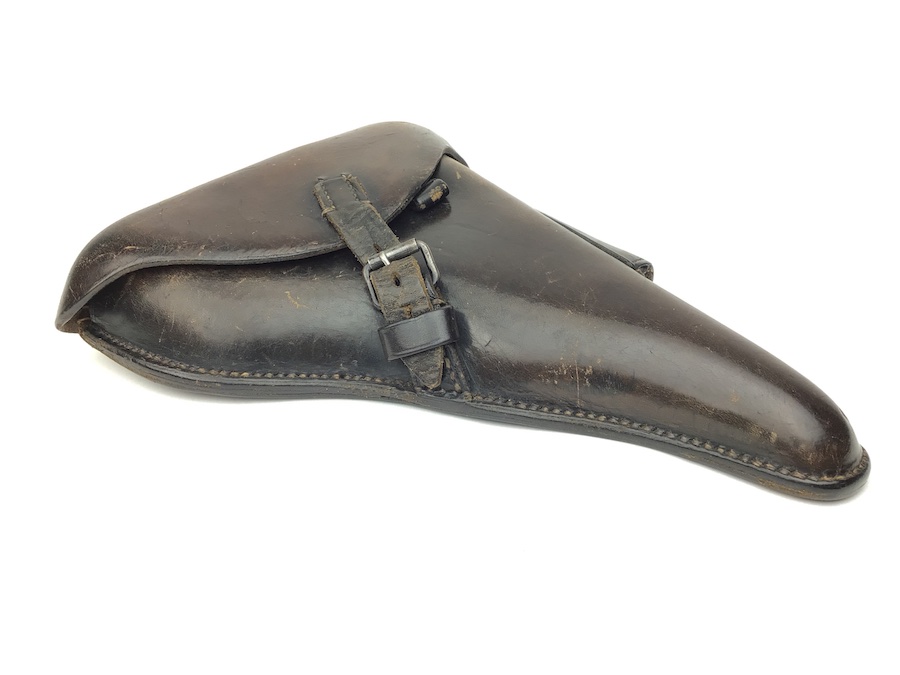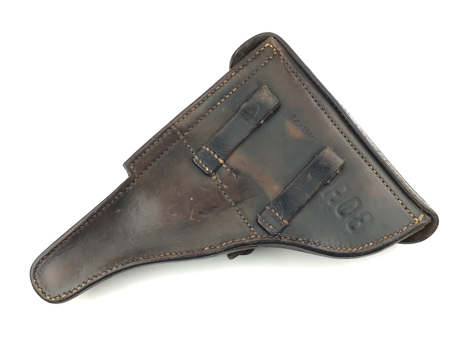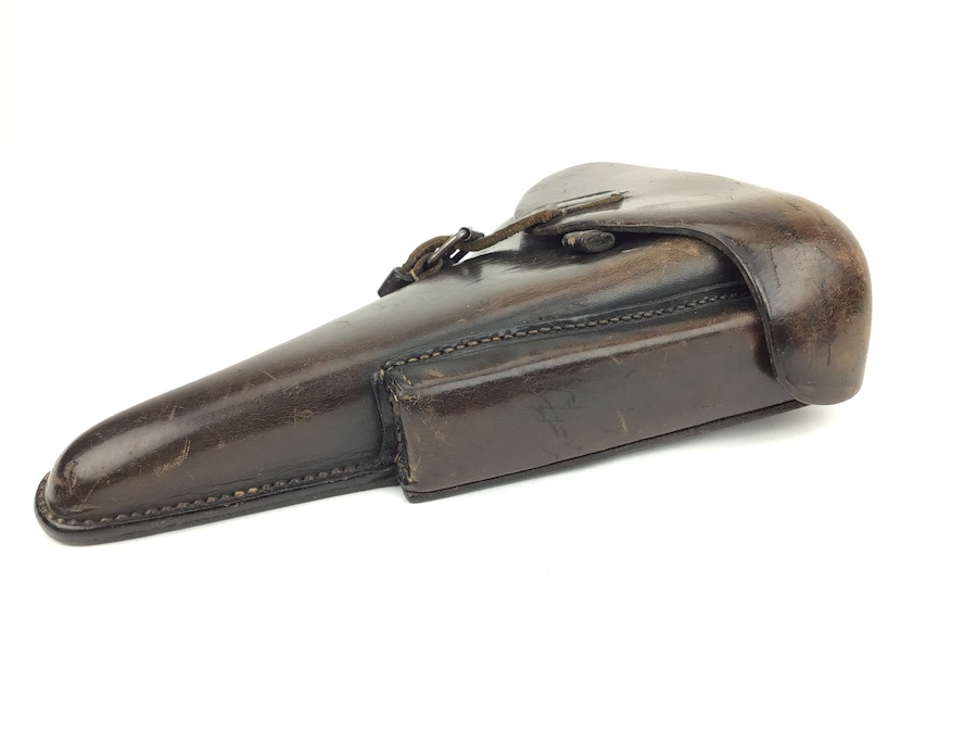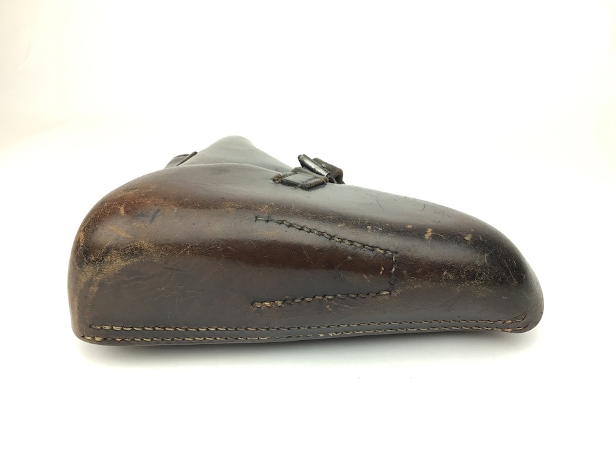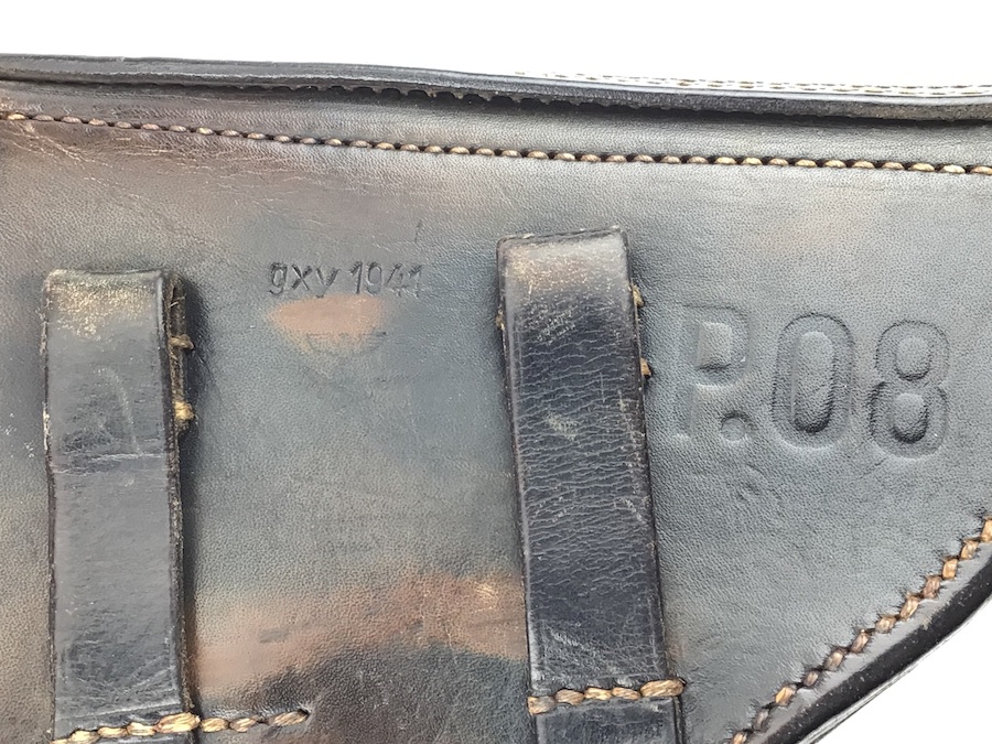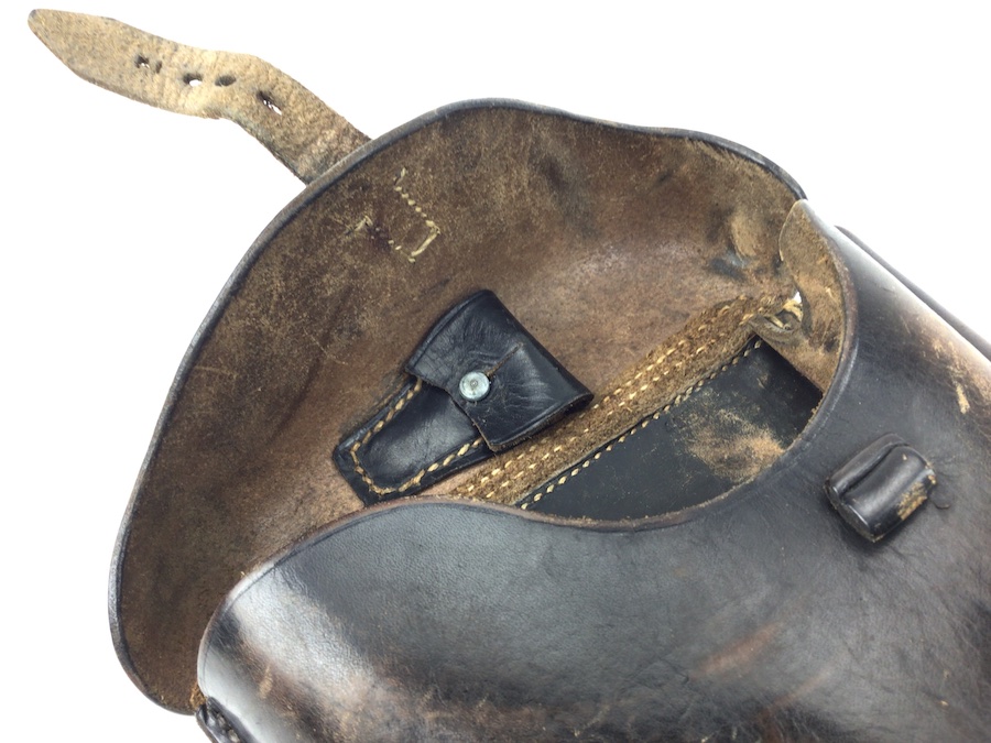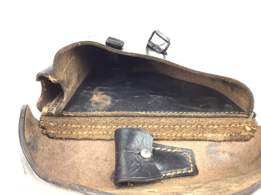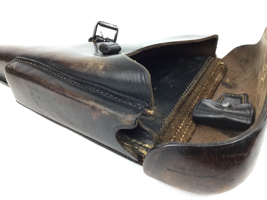 7/7/21 – Original and great condition. 1941 dated P.08 Luger holster. The holster is “gxy” made and waffen military proof stamped. Although faint, the stamp is visible. These are most commonly seen with Black Widow Lugers. This holster has very strong leather that is minimally pliable. The leather has minimal wrinkling as well. The interior leather is clean with no stitching issues. The tip of the tool pouch has been clipped. Otherwise, everything is fully intact.