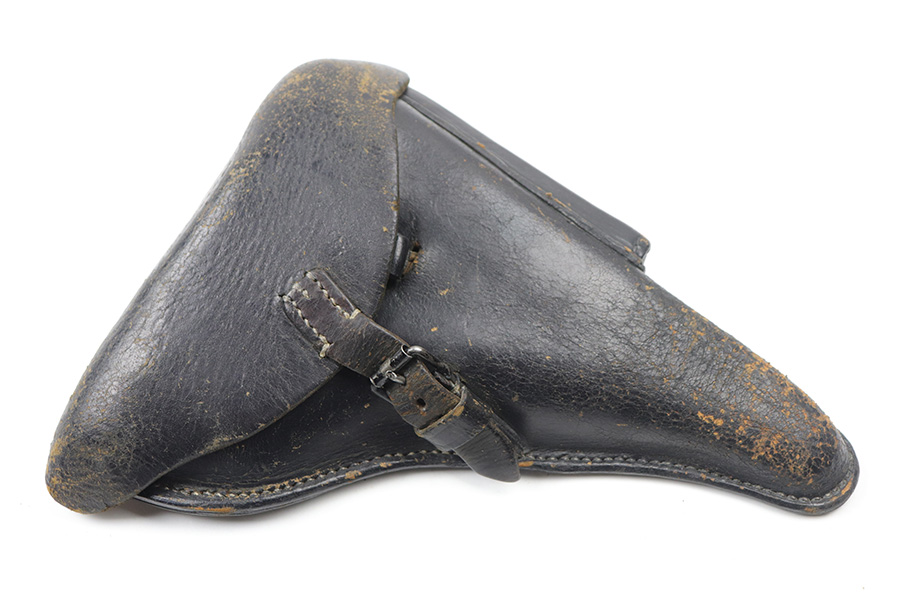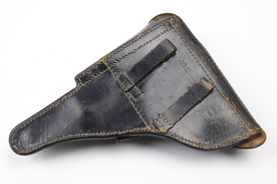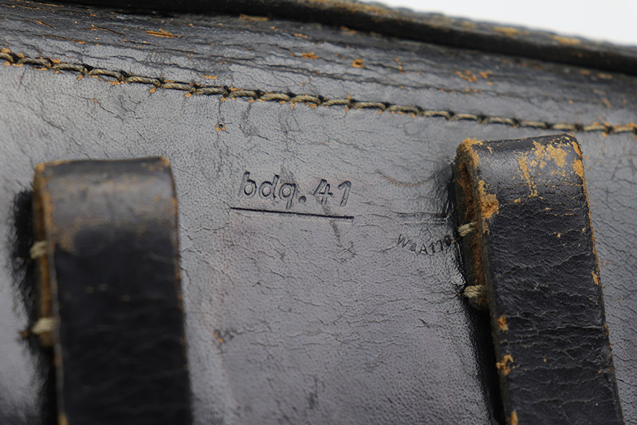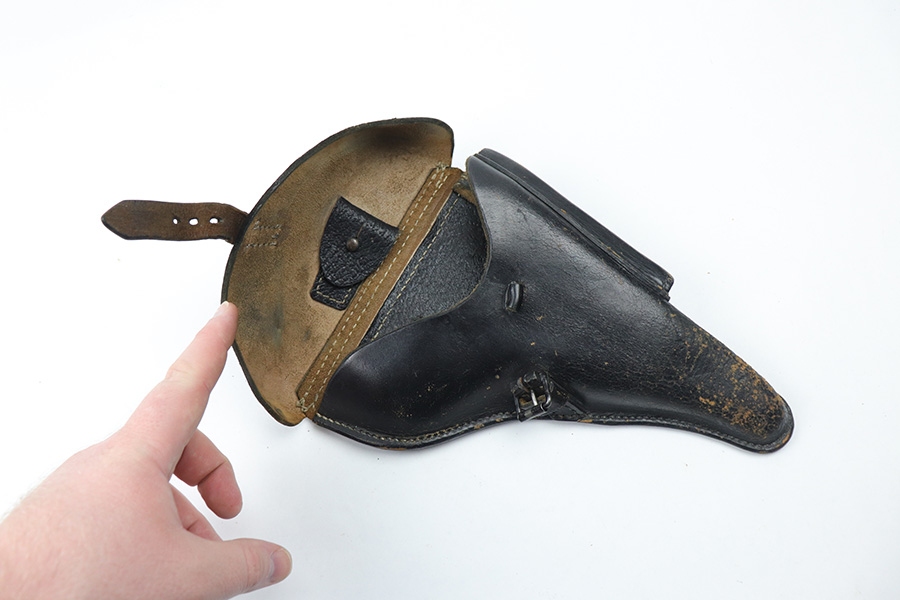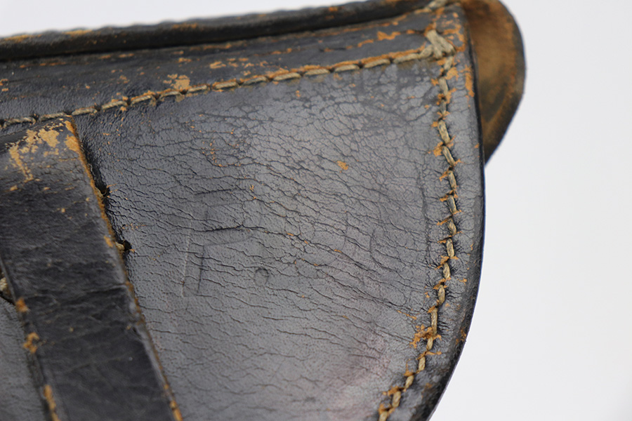 2/2/22 – This is an original 1941 dated luger holster from WW2. The holster leather is worn throughout, with high pliability and wrinkling throughout the front leather. There’s some scuffing / flaking of the black finished leather near the toe, as shown. The back leather is maker stamped, dated, and waffen proofed. The stitching is tight and without any major issues, though we’re not certain the stitching is original. Price reduced accordingly. The interior leather is clean.