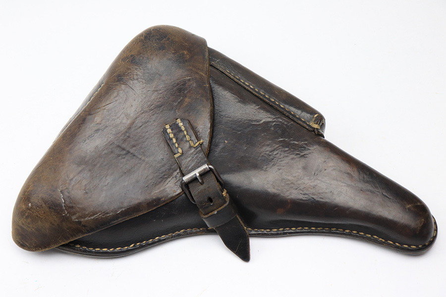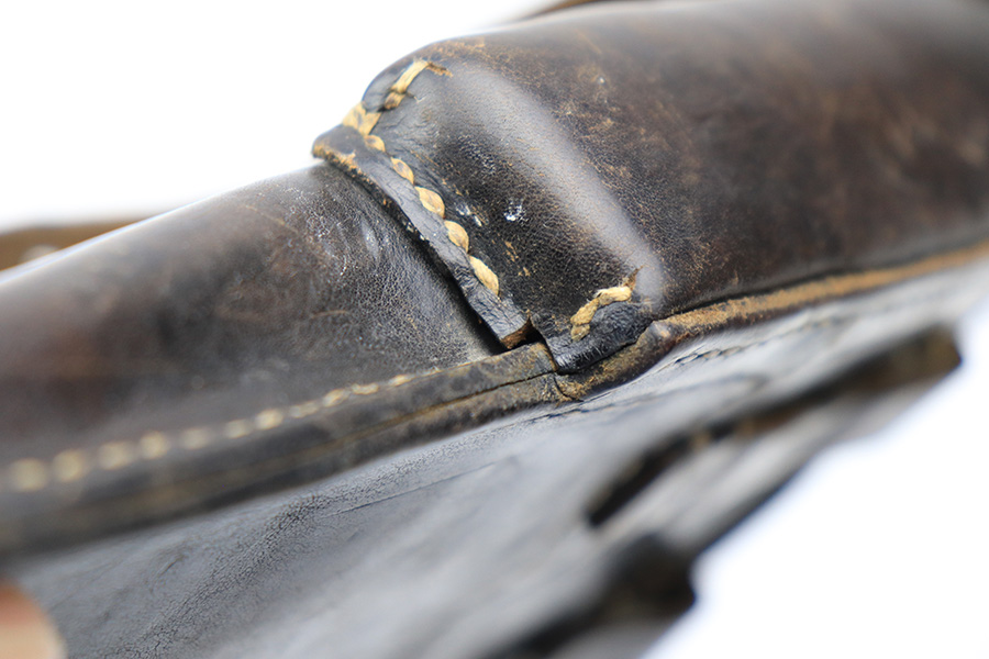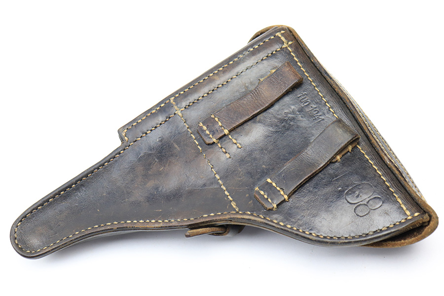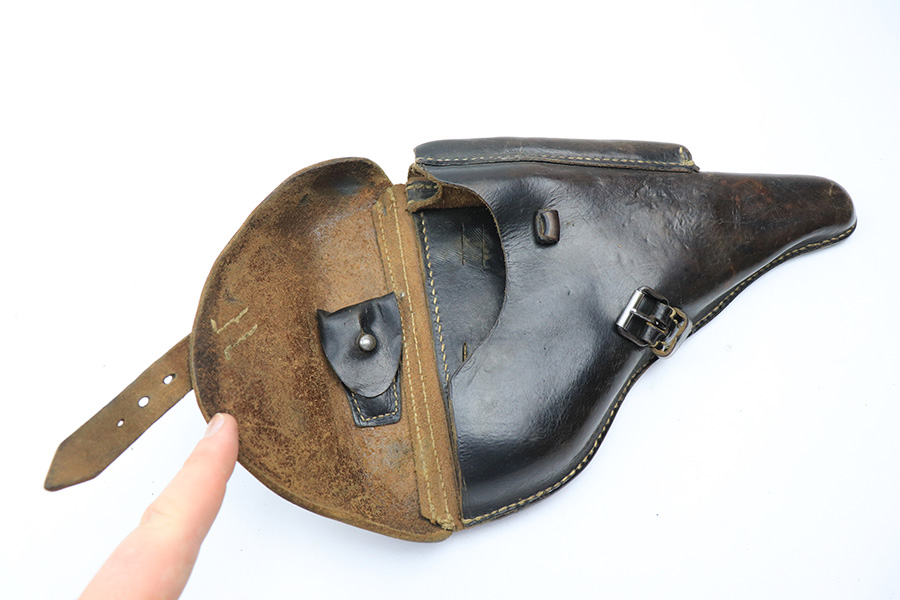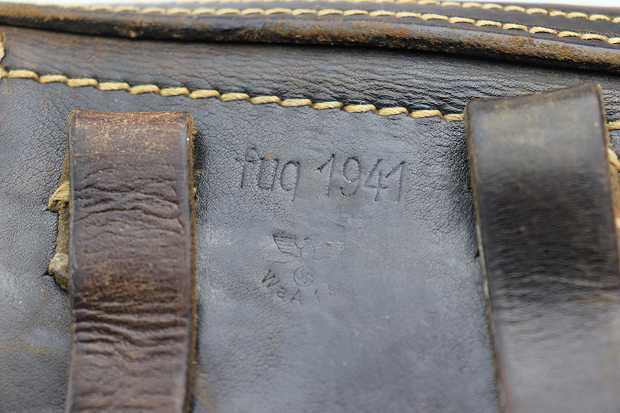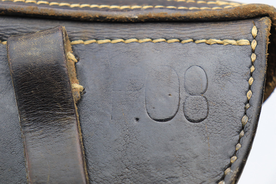 5/12/22 – This is an original 1941 dated Luger holster. The holster has nice leather and stitching with some honest wear throughout. The back of the holster is maker stamped, dated, P.08 stamped, and waffen proofed. The leather is pliable but in good condition overall. The black dye has faded throughout the front and top leather, but this is fairly common. The stitching is all original and in tact.