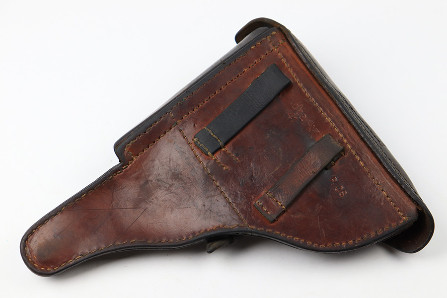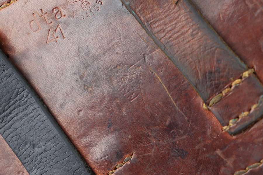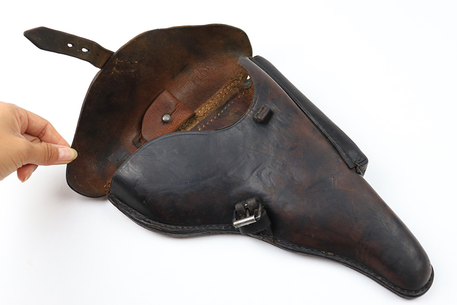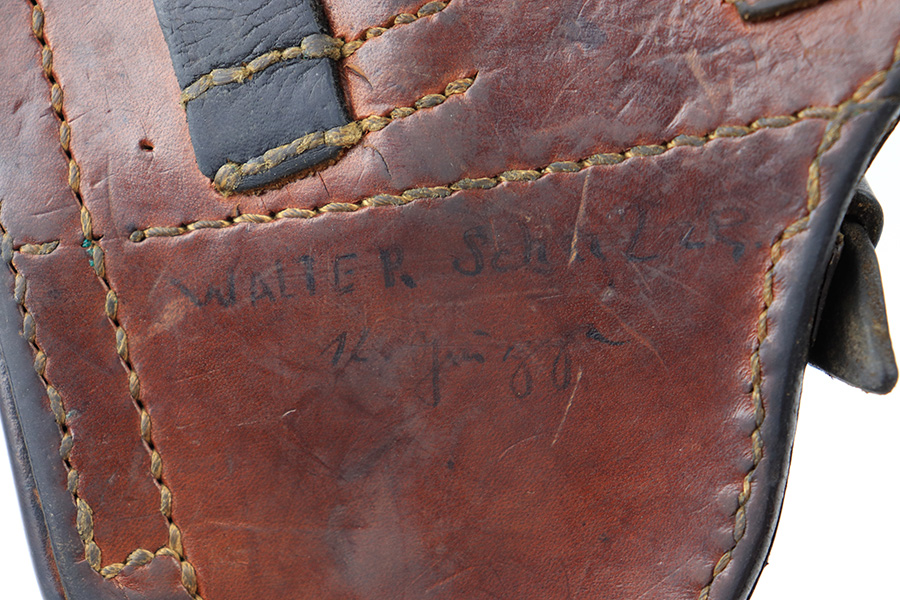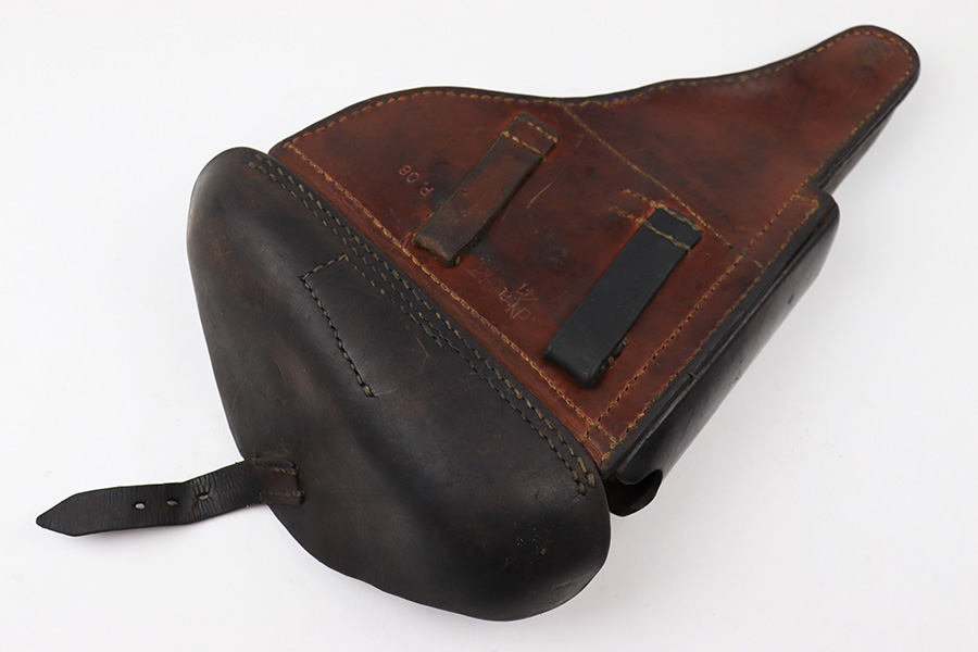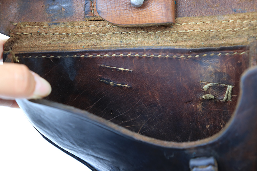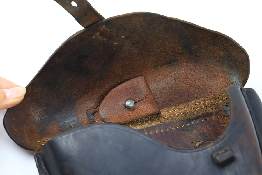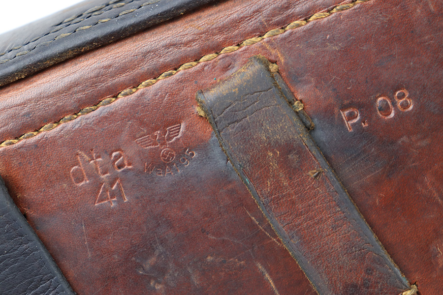 7/19/22 – This is an original 1941 dated Luger holster. The back leather is maker stamped, dated, waffen proofed, and P.08 stamped. The stamps are all crisp and clearly visible. The leather has some honest wear throughout, and the leather is pliable. The black dye has mostly faded out of the back leather (as shown, the back leather looks brown) and there is fading throughout the front leather as well. The stitching appears all original with no notable issues. A straightforward example with honest wear and aging.