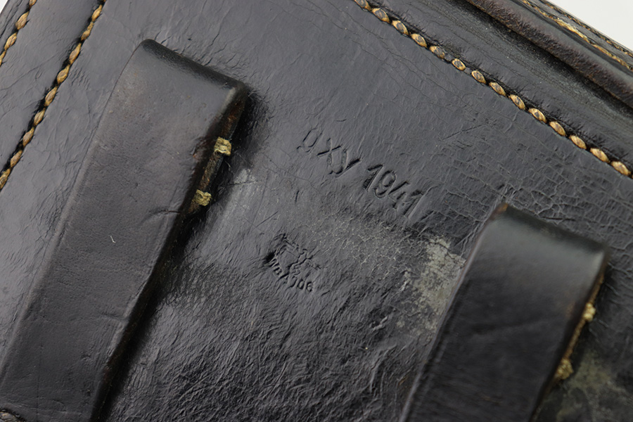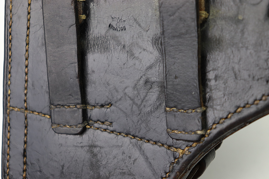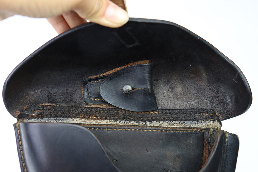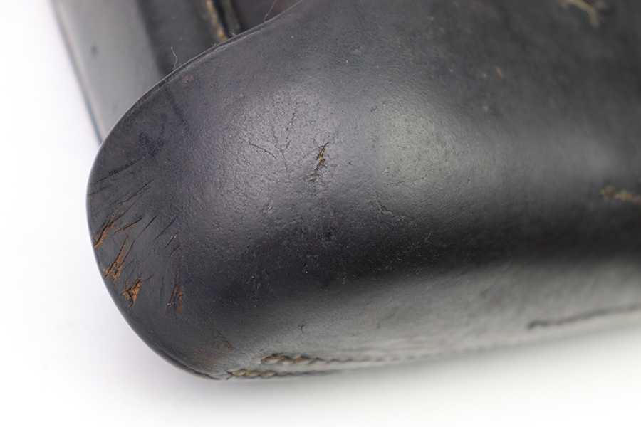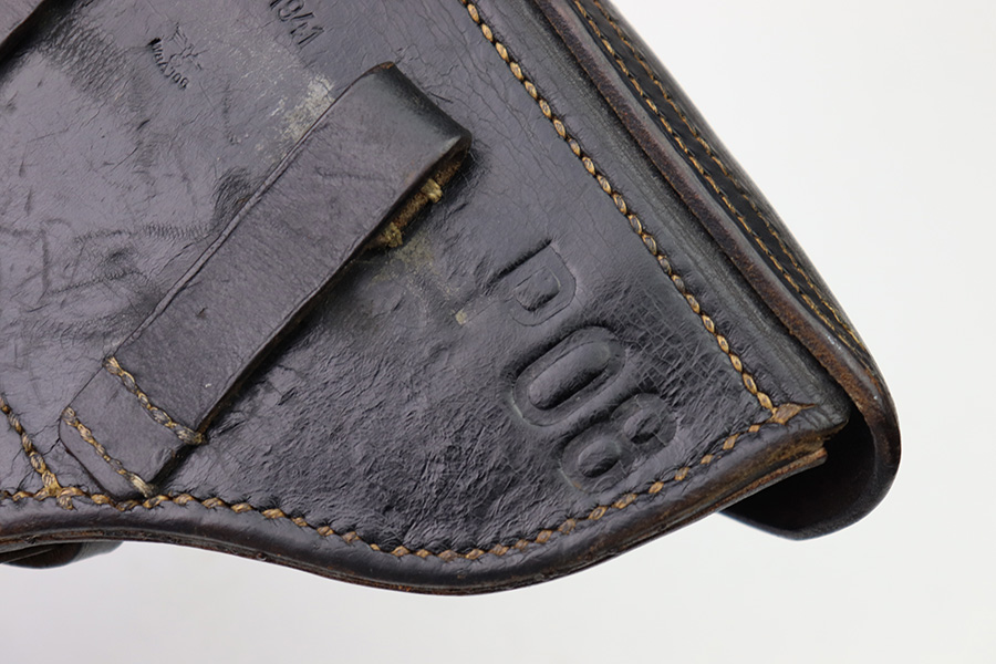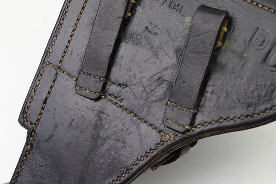 8/1/22 – This is an original 1941 dated Luger holster. The back leather is maker stamped, dated, waffen proofed, and P.08 stamped. The leather is very strong and firm with minimal pliability. There’s some mild surface scuffs and scratches but no major issues with the leather. All original stitching appears tight and intact. The only takeaway from this example is the interior lid has been dyed black (we’re not sure why).