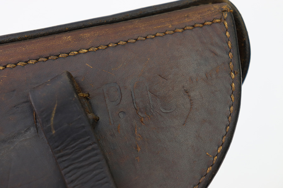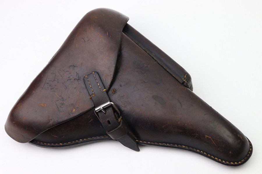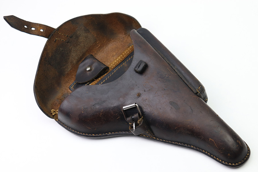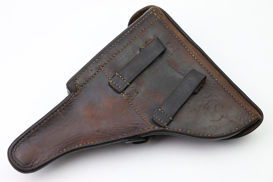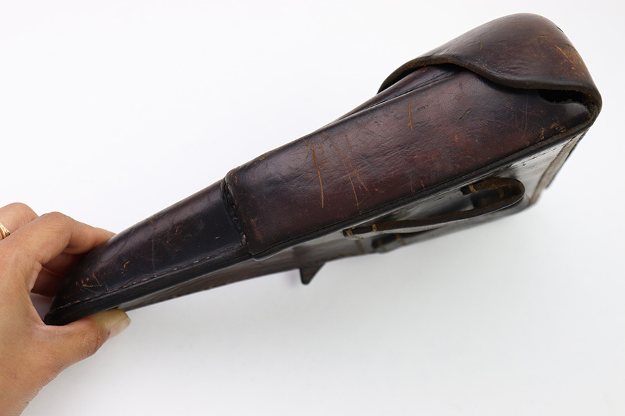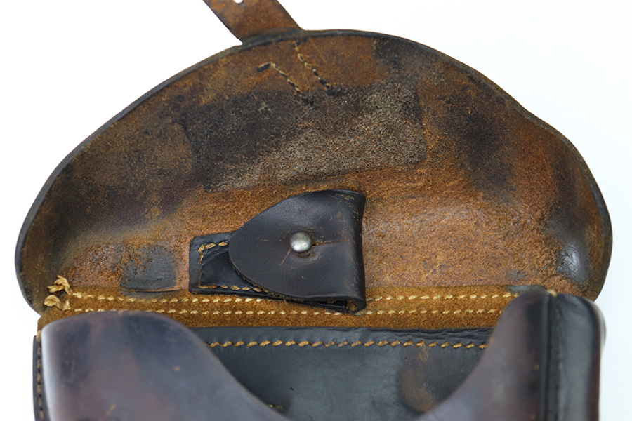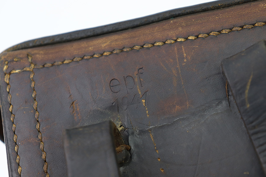 8/9/22 – This is an original 1941 dated Luger holster. The holster is in very good condition with a maker stamp, date, waffen proof, and P.08 stamp on the back leather. The waffen proof is somewhat faded but still visible. The black dyed leather is losing some of the coloring, leaving a dark brown / black color throughout the leather. The leather has normal pliability and typical aging and use wear but no major issues. All original stitching is tight throughout the holster.