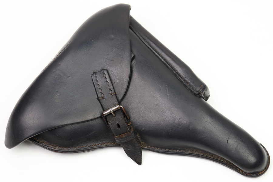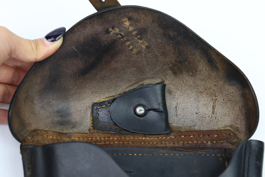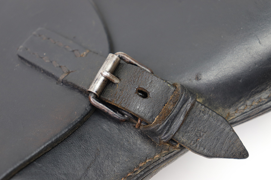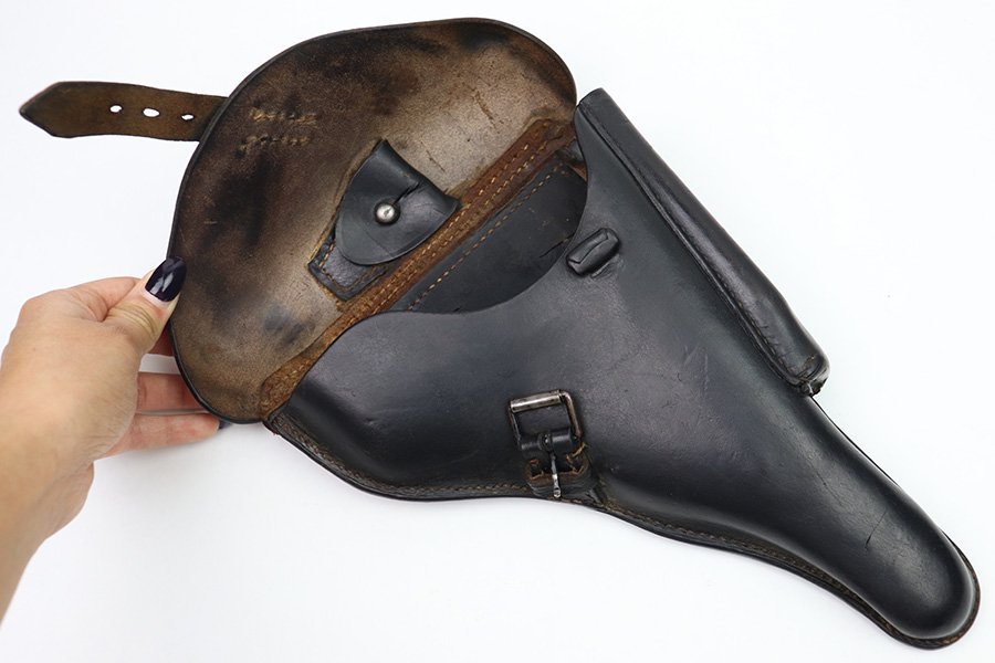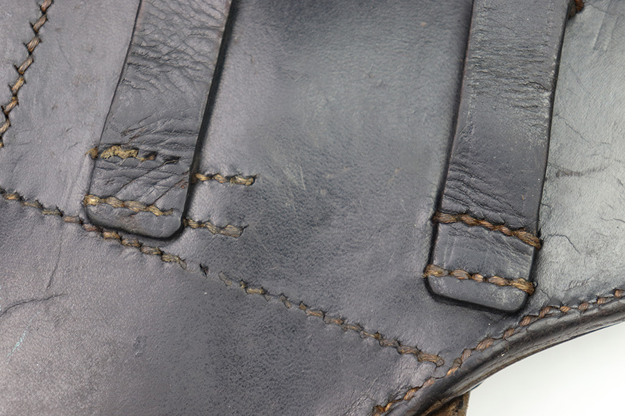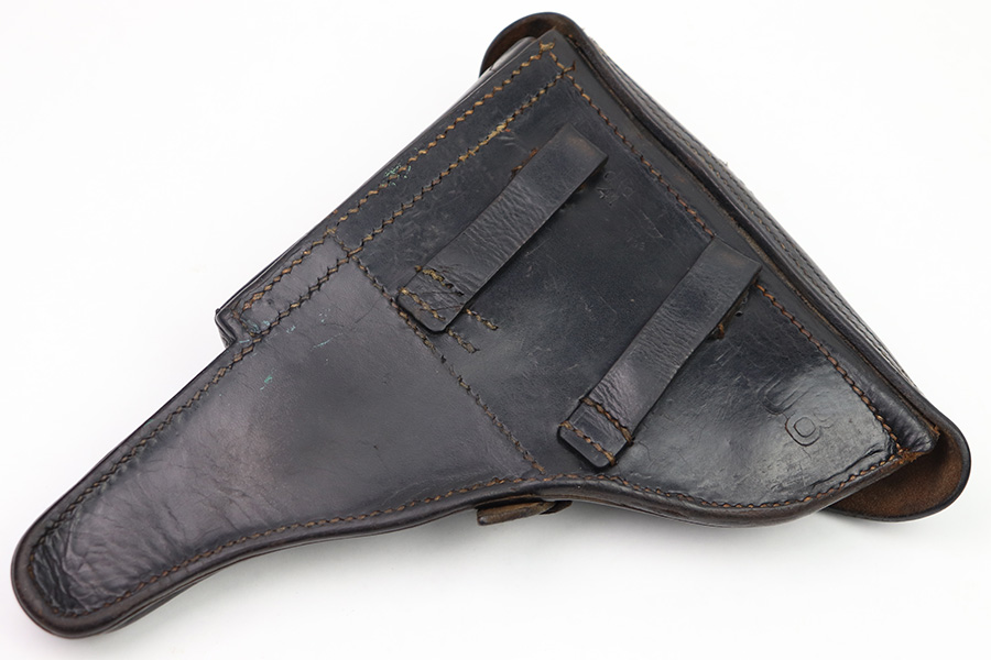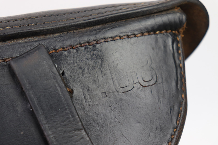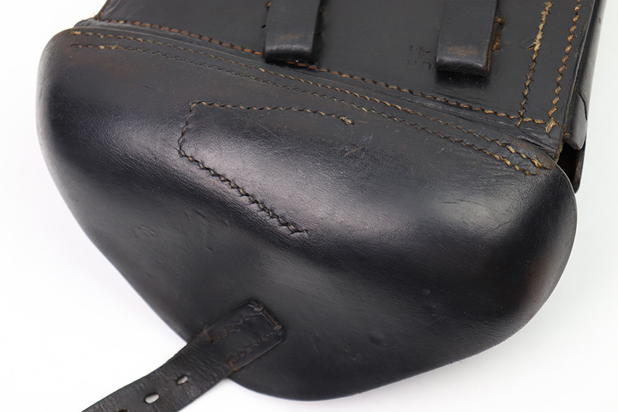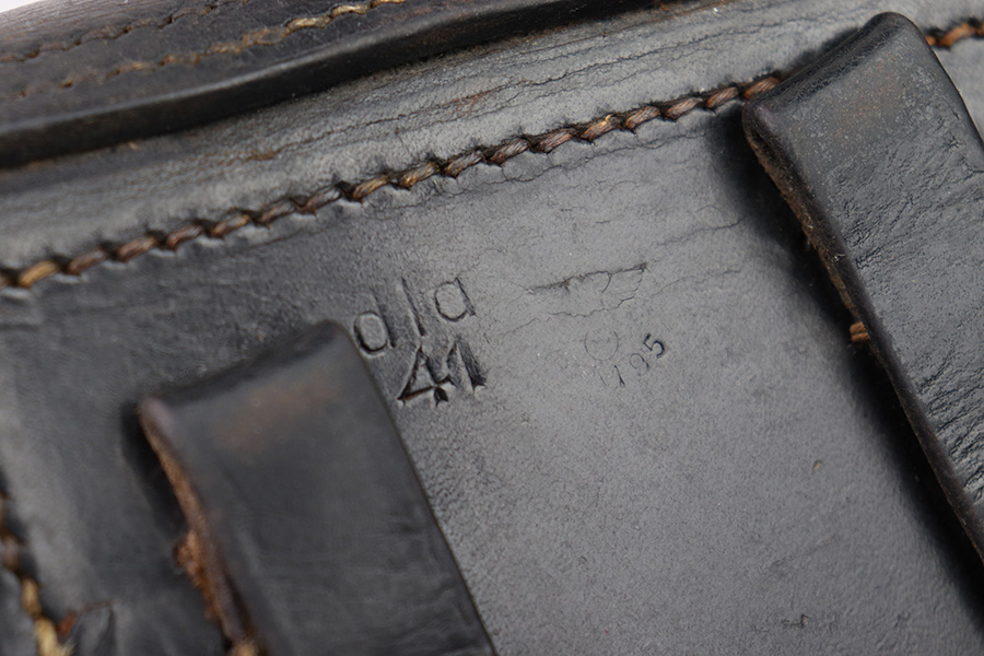 11/11/22 – This is an original 1941 dated Luger holster from WW2. The holster has soft and pliable leather that shows use but no excessive wear or damage. The black leather is completely intact with mild scuffs and surface wrinkling. There’s one or two loose stitches on the back left belt loop but overall the stitching is excellent. Maker stamped, dated, waffen proofed, and P.08 stamped on the back leather.