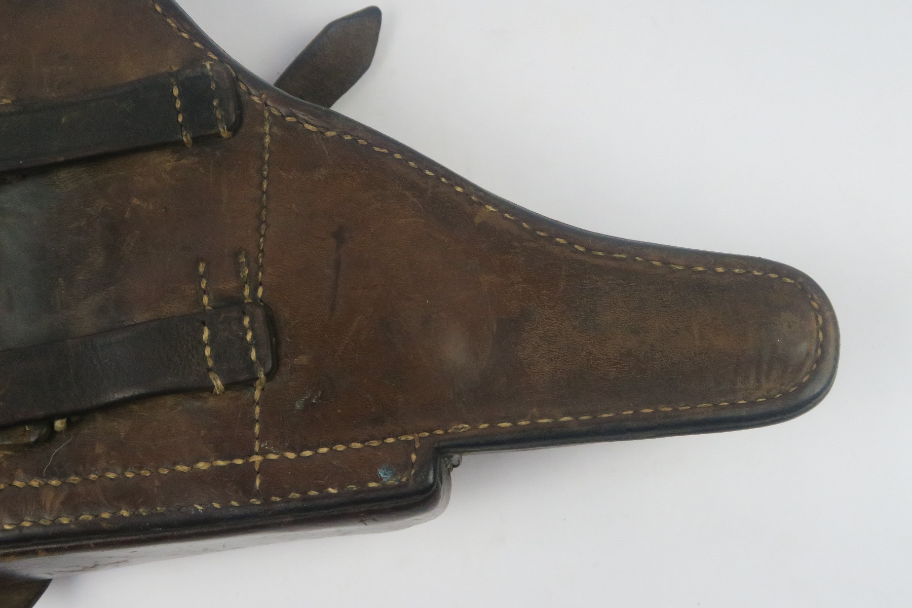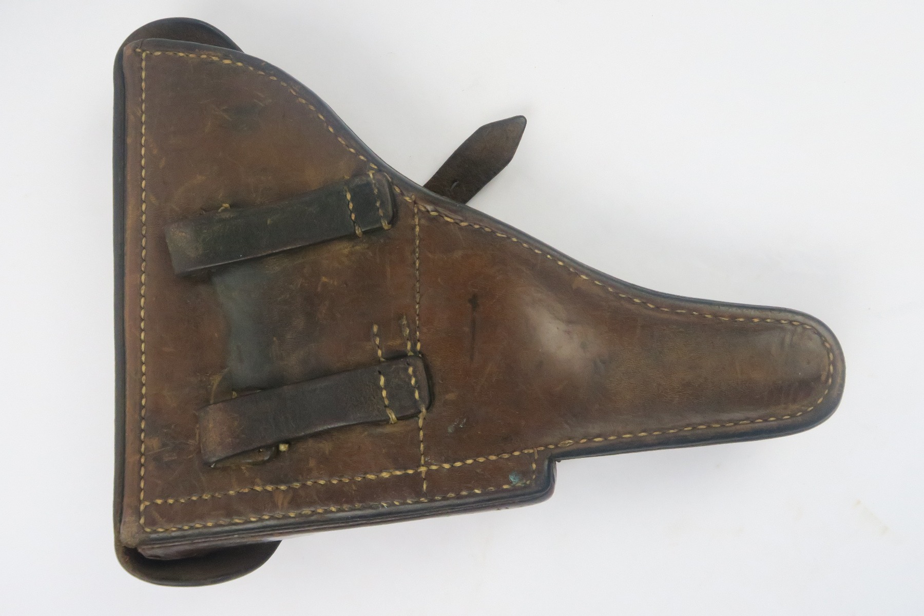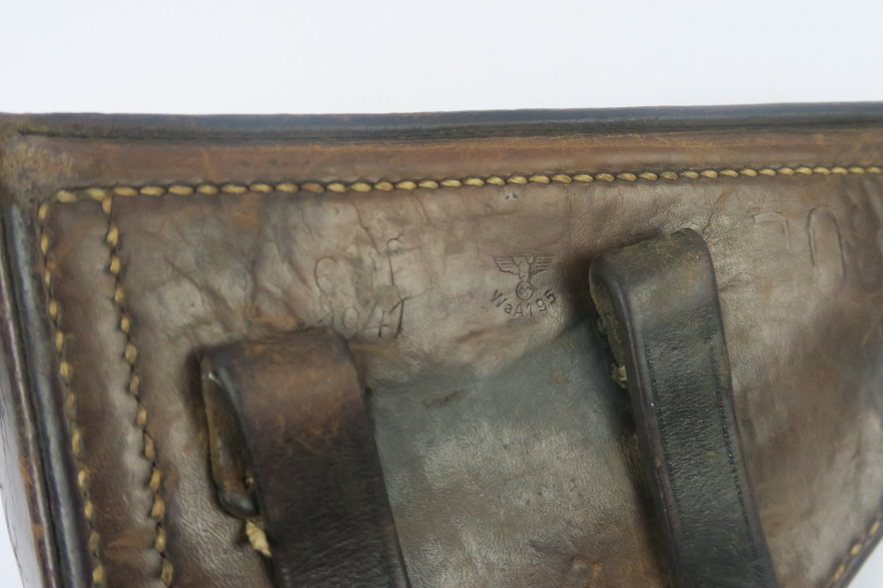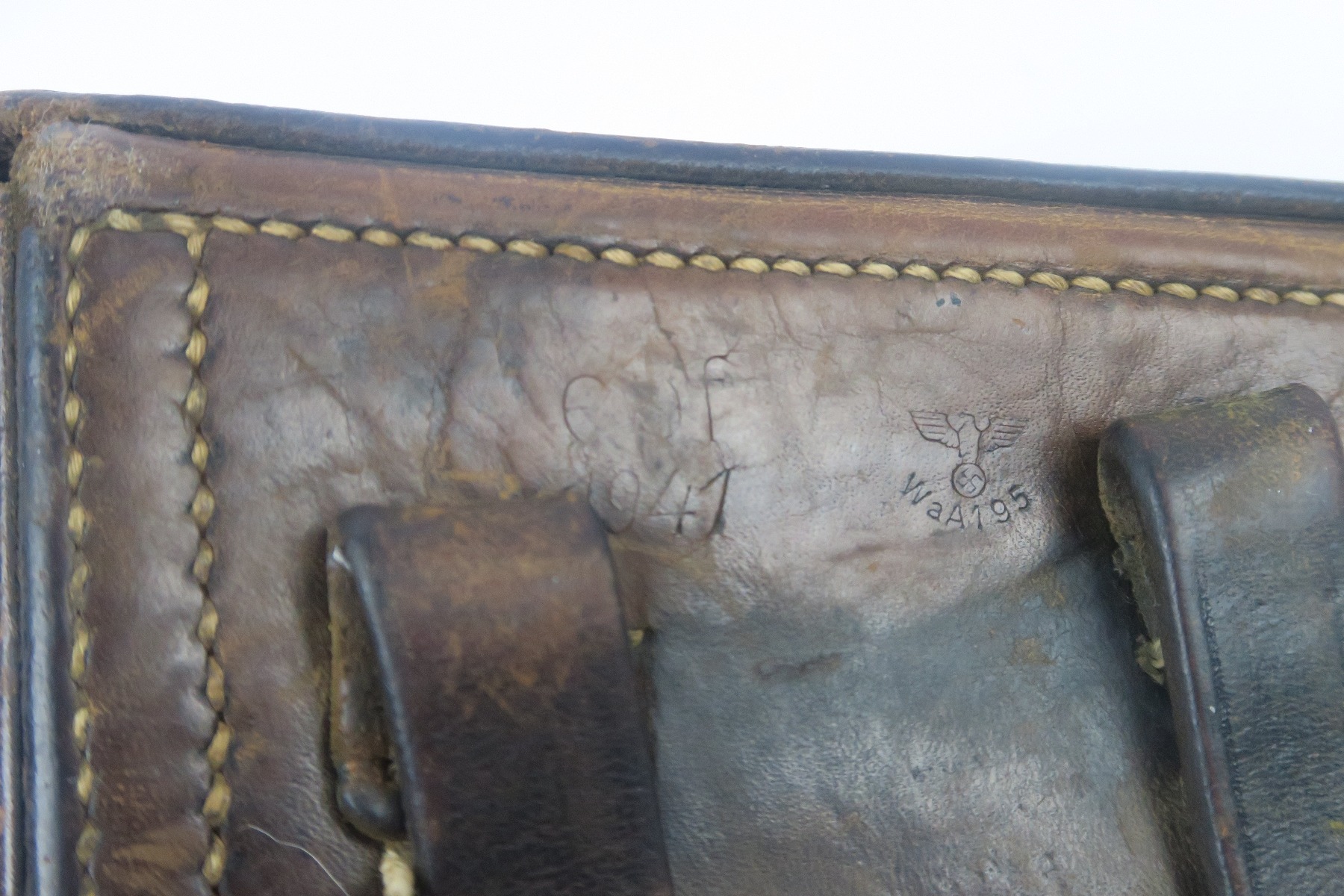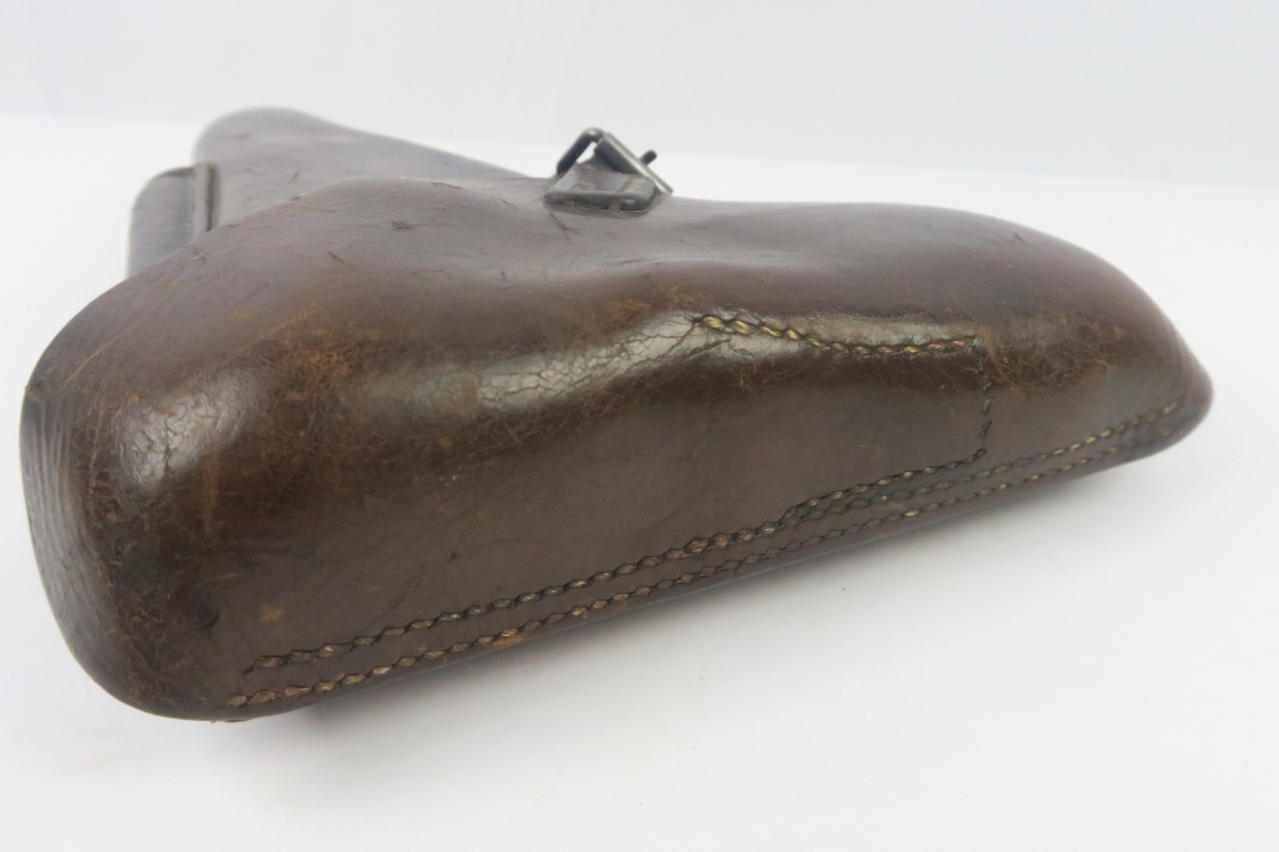 1/30/18 – This is an original WW2 production, 1941 dated Luger holster. The holster has brown leather, which is most likely due to the black dye wearing off. The maker is fairly uncommon, “epf” on the back of the holster. The waffen stamp is crisp and WaA195. The leather is pliable overall and fairly weak. There is some wrinkling and surface cracking as well, but this is light and not deep wear. The stitching and leather is all in tact. Priced to sell and guaranteed original.