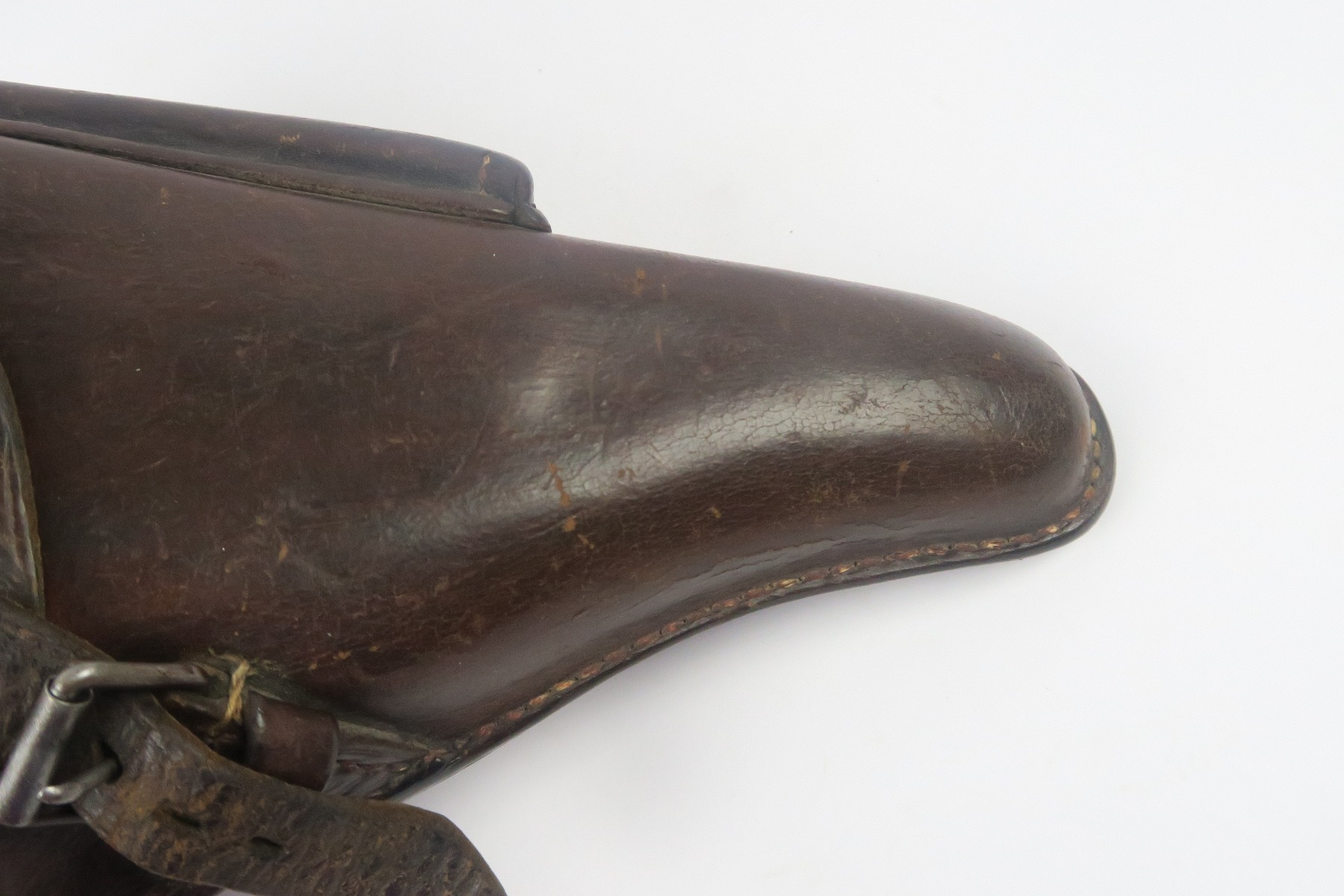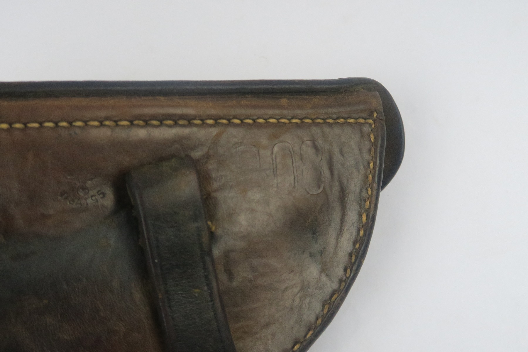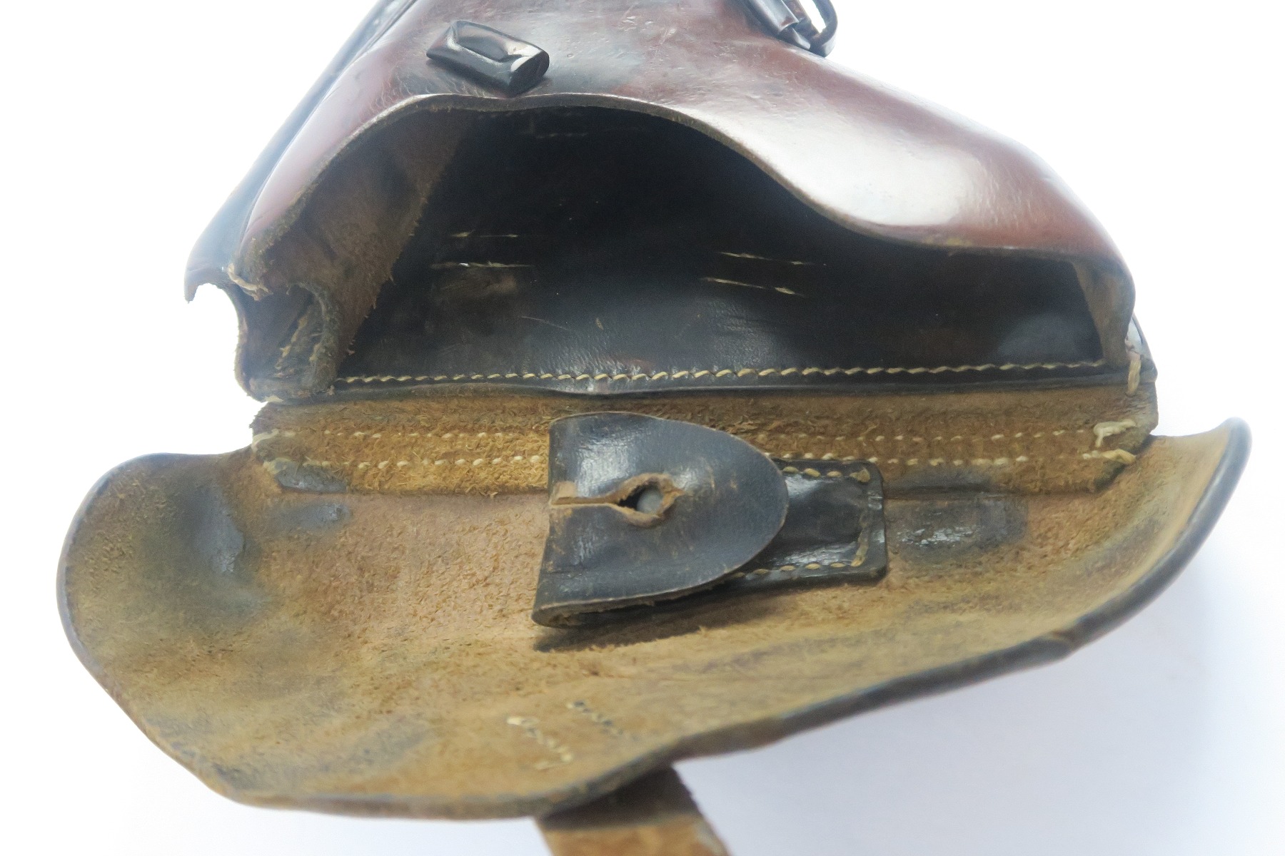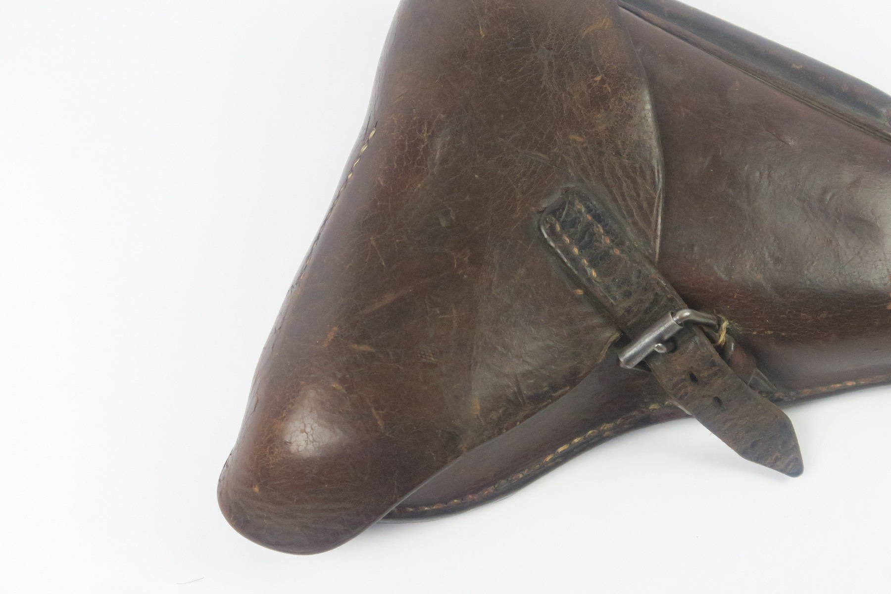 1/30/18 – This is an original WW2 production, 1941 dated Luger holster. The holster has brown leather, which is most likely due to the black dye wearing off. The maker is fairly uncommon, “epf” on the back of the holster. The waffen stamp is crisp and WaA195. The leather is pliable overall and fairly weak. There is some wrinkling and surface cracking as well, but this is light and not deep wear. The stitching and leather is all in tact. Priced to sell and guaranteed original.