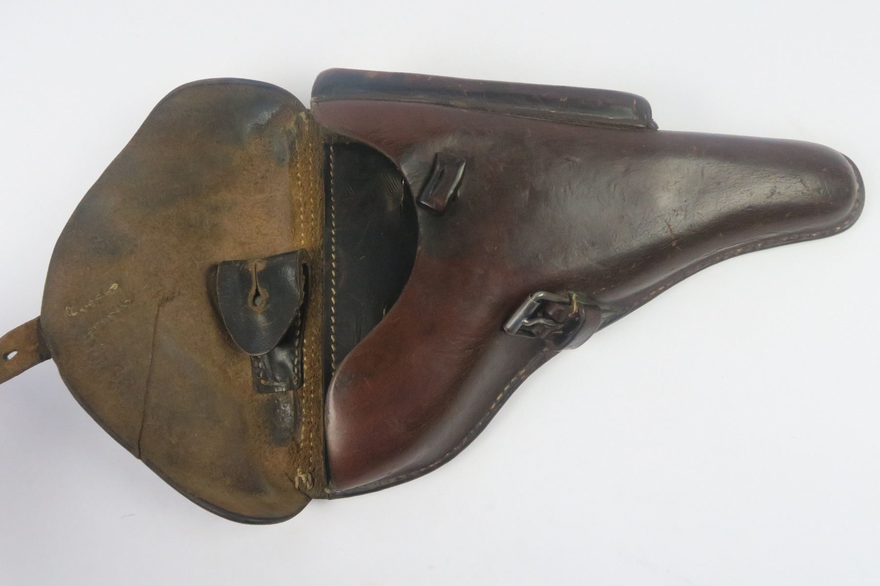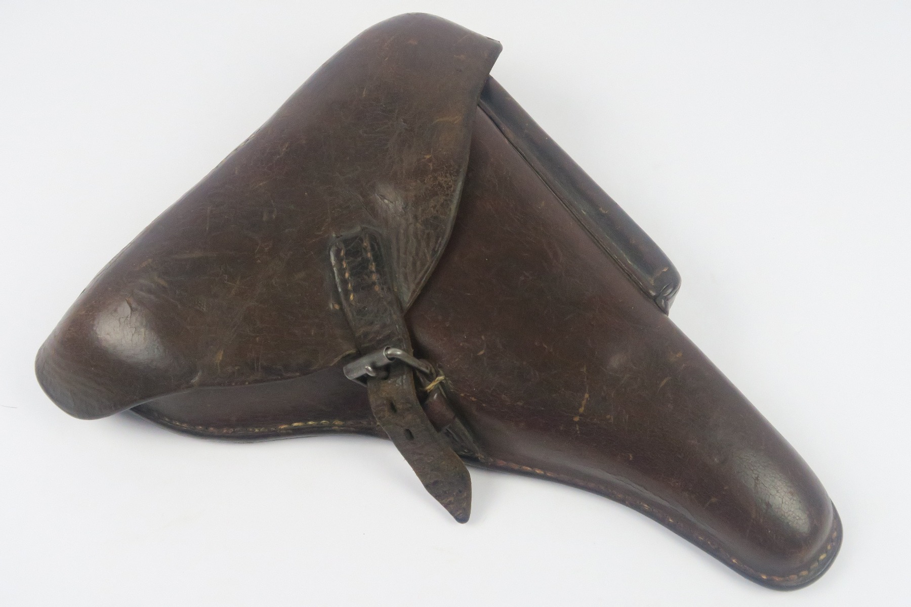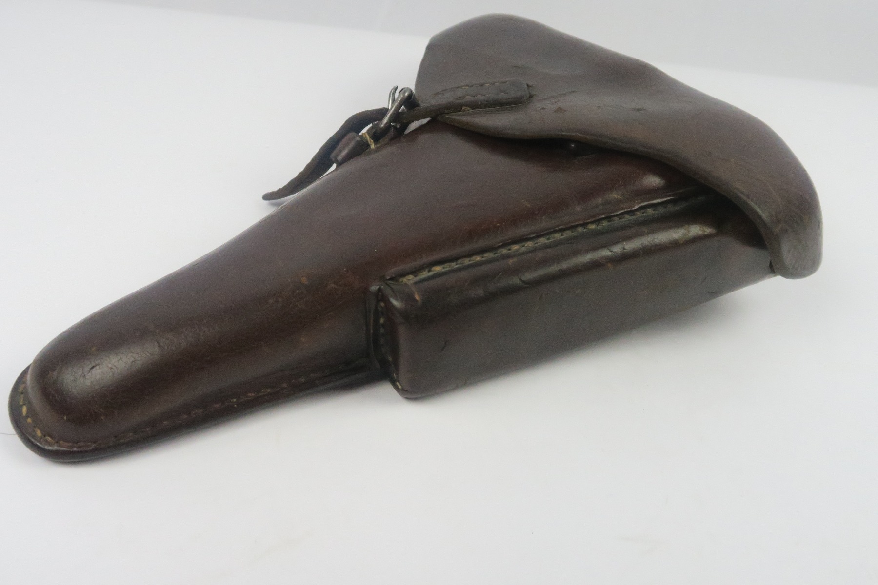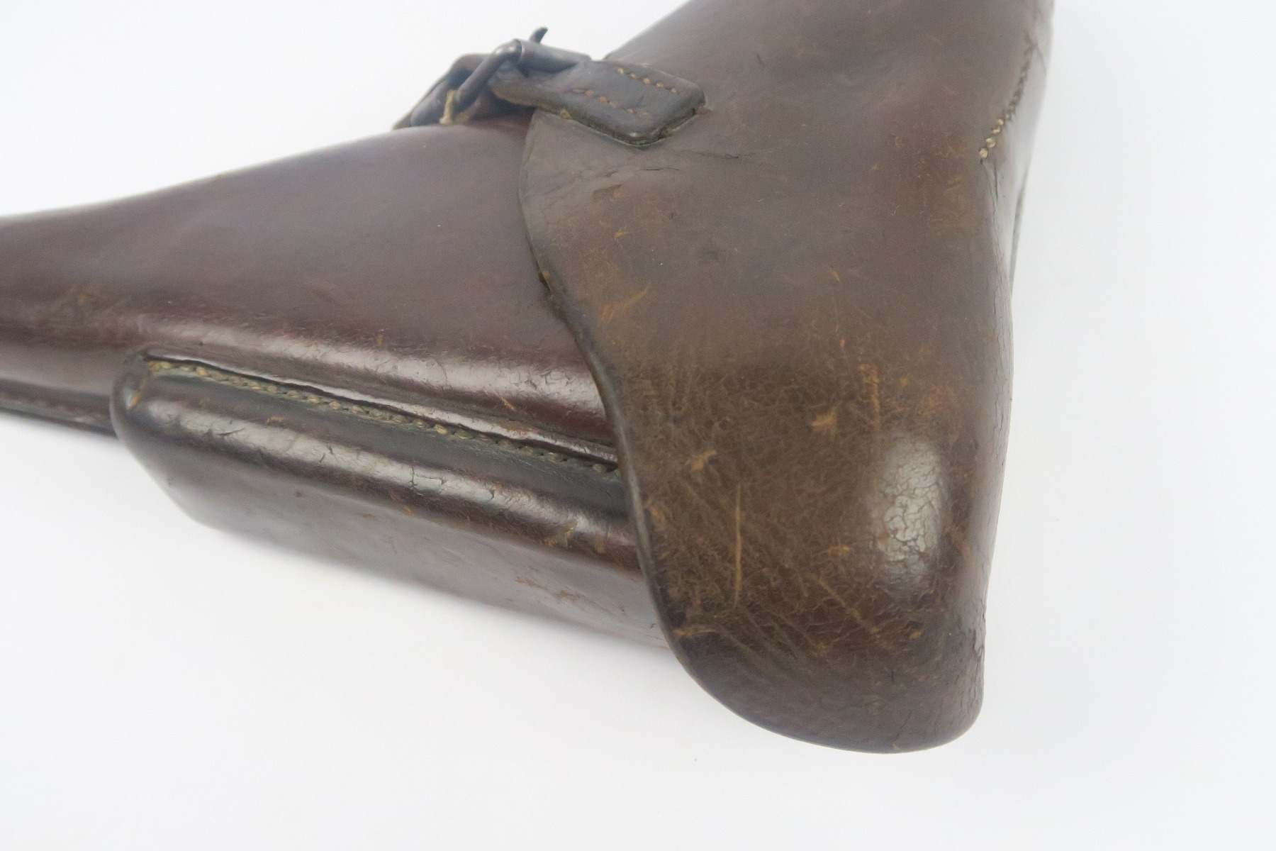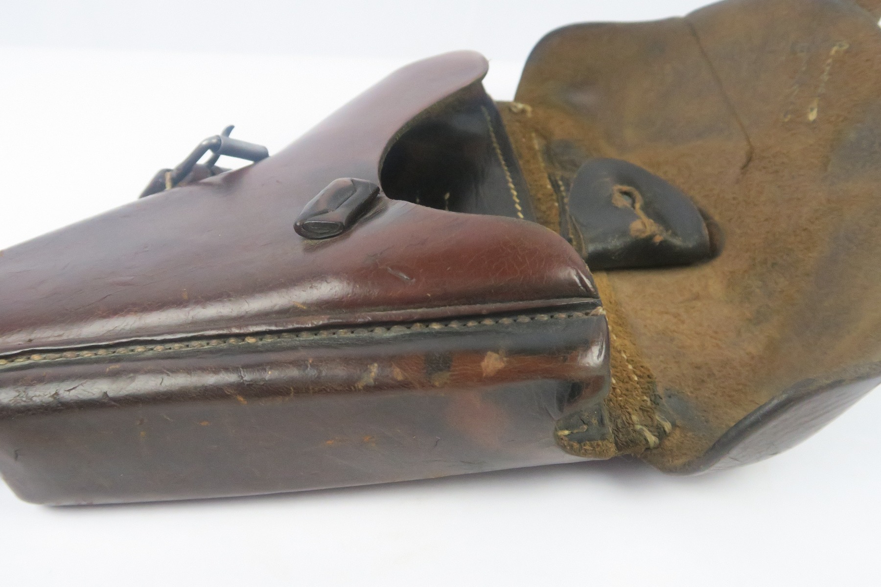1/30/18 – This is an original WW2 production, 1941 dated Luger holster. The holster has brown leather, which is most likely due to the black dye wearing off. The maker is fairly uncommon, “epf” on the back of the holster. The waffen stamp is crisp and WaA195. The leather is pliable overall and fairly weak. There is some wrinkling and surface cracking as well, but this is light and not deep wear. The stitching and leather is all in tact. Priced to sell and guaranteed original.