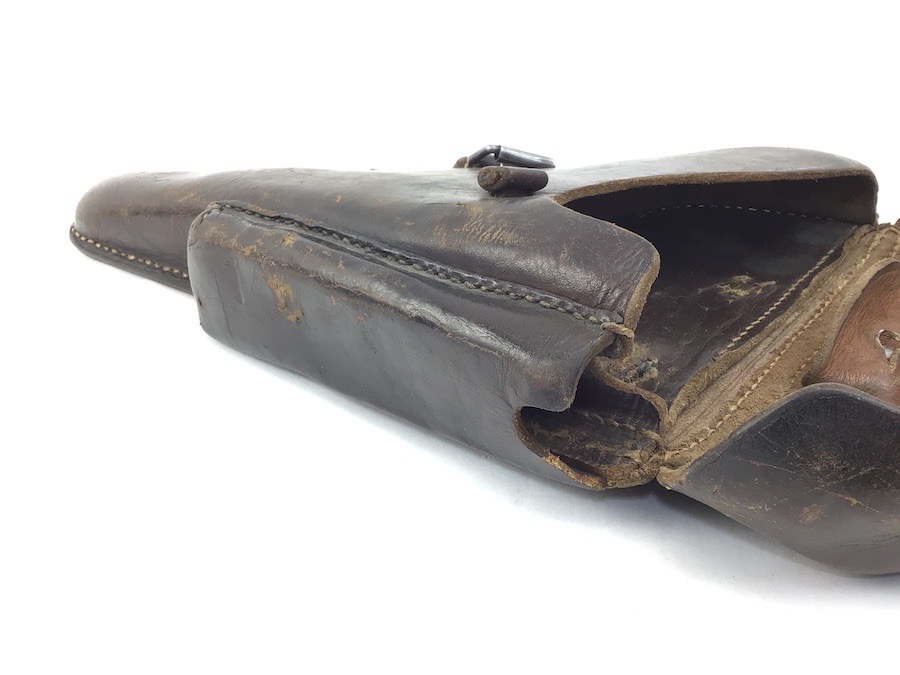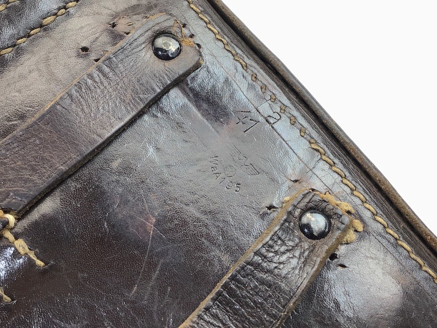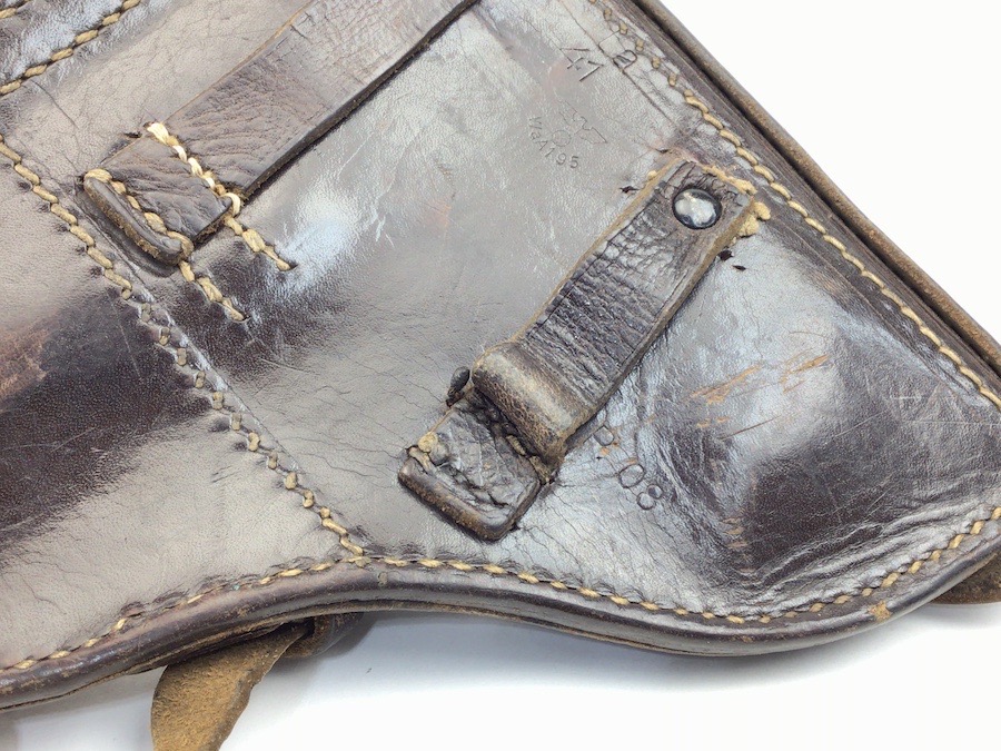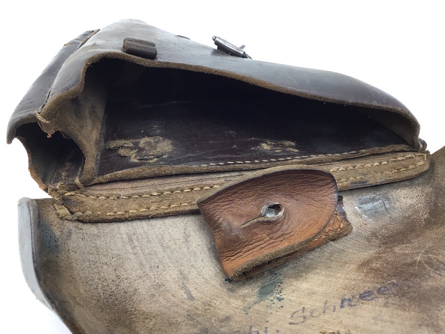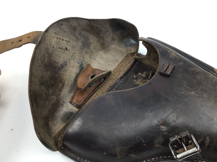 5/3/23 – Original and good condition. 1941 dated, P.08 Luger holster. The holster is maker and date stamped, however, the maker stamp shows only 2 letters “ta” of the “dta” maker stamp. There’s also a military waffen proof stamp stamp “WaA195”. The top of the belt loops have been repaired with rivets and they are secure. Remaining stitching is original and secure. Personalized with ink under the closure lap. Minor scars and wear on the outer surface. The interior leather is clean with a secure lift strap.