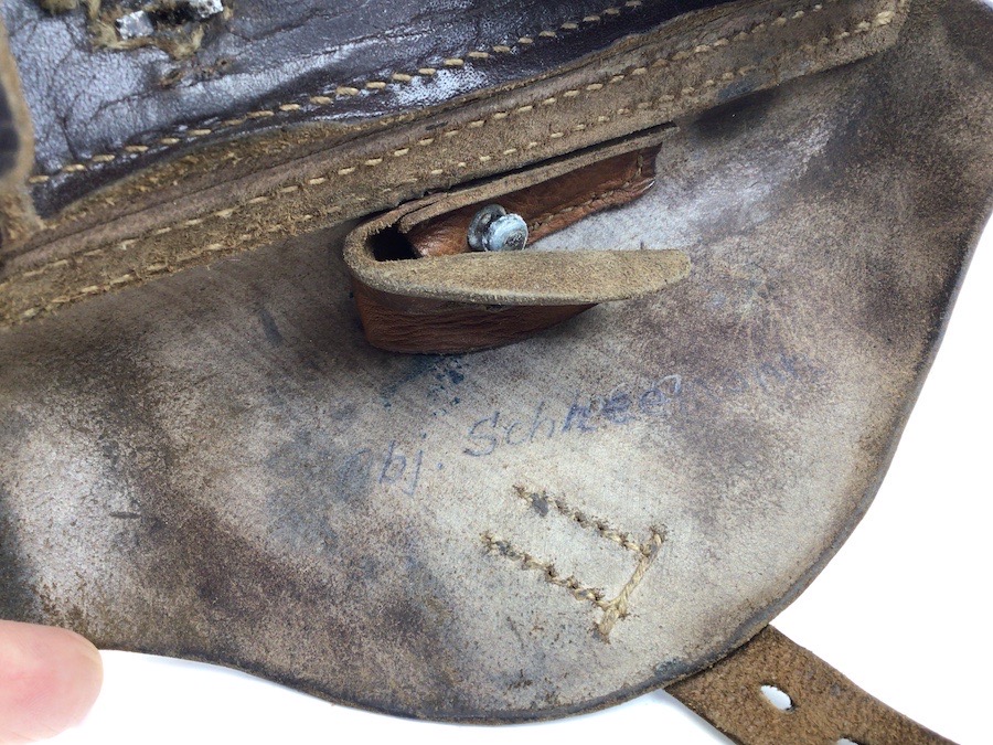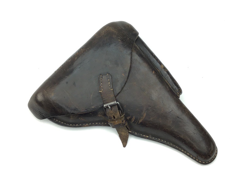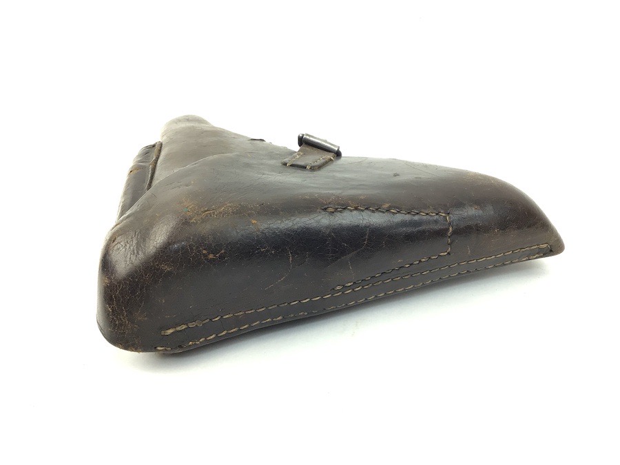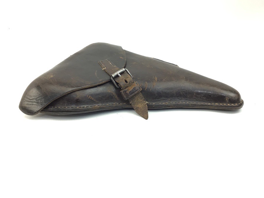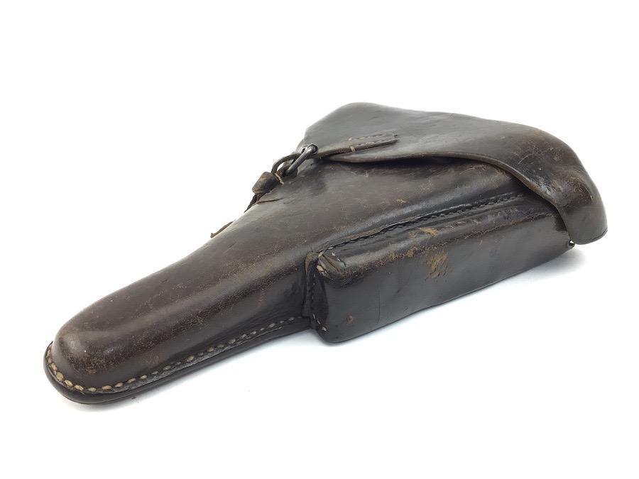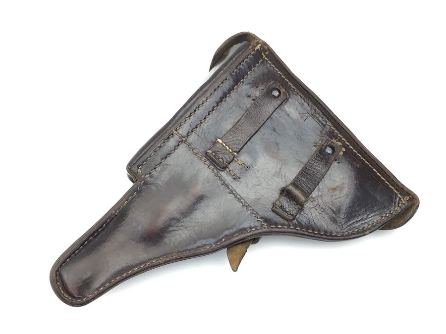5/3/23 – Original and good condition. 1941 dated, P.08 Luger holster. The holster is maker and date stamped, however, the maker stamp shows only 2 letters “ta” of the “dta” maker stamp. There’s also a military waffen proof stamp stamp “WaA195”. The top of the belt loops have been repaired with rivets and they are secure. Remaining stitching is original and secure. Personalized with ink under the closure lap. Minor scars and wear on the outer surface. The interior leather is clean with a secure lift strap.