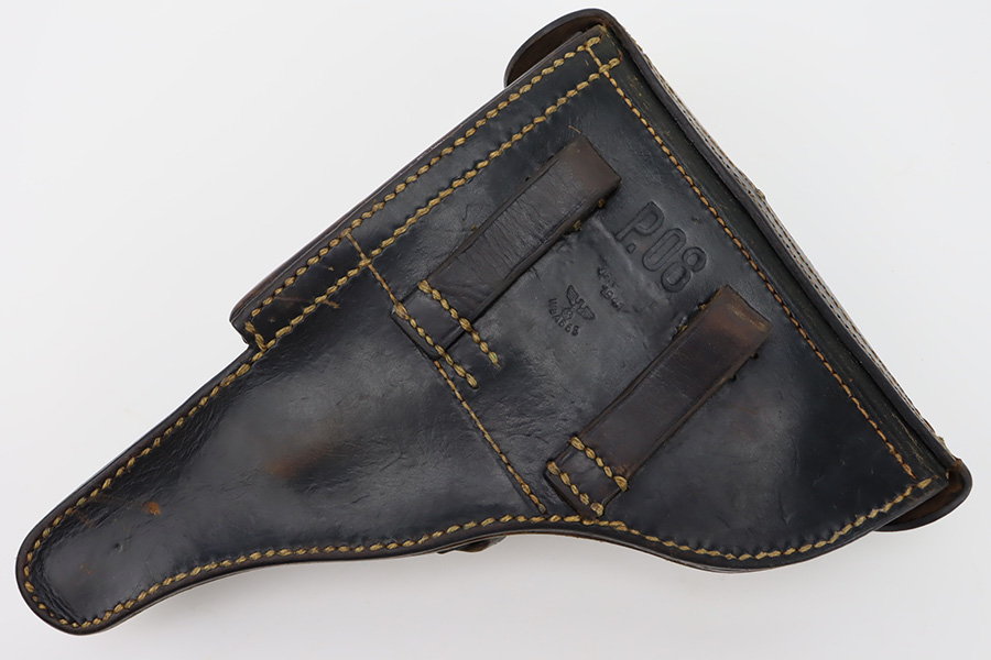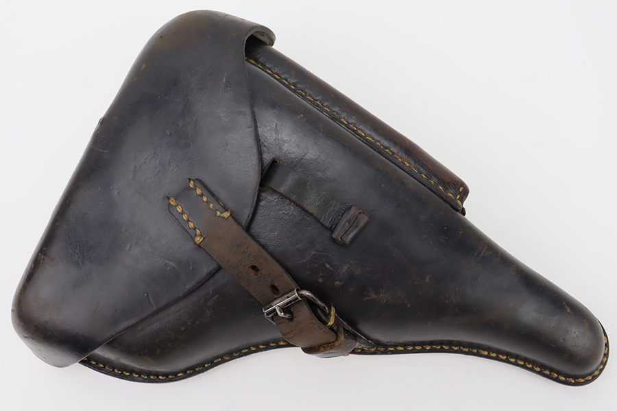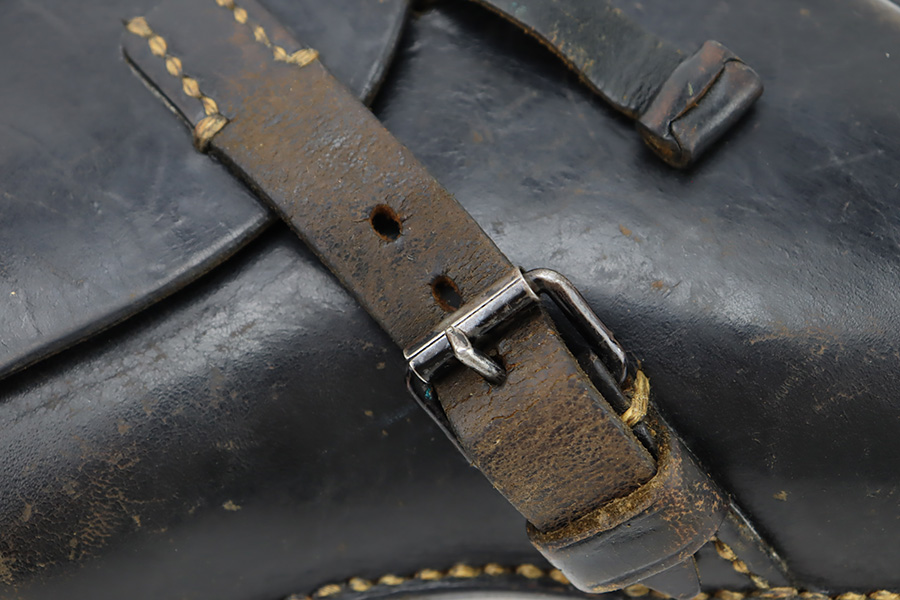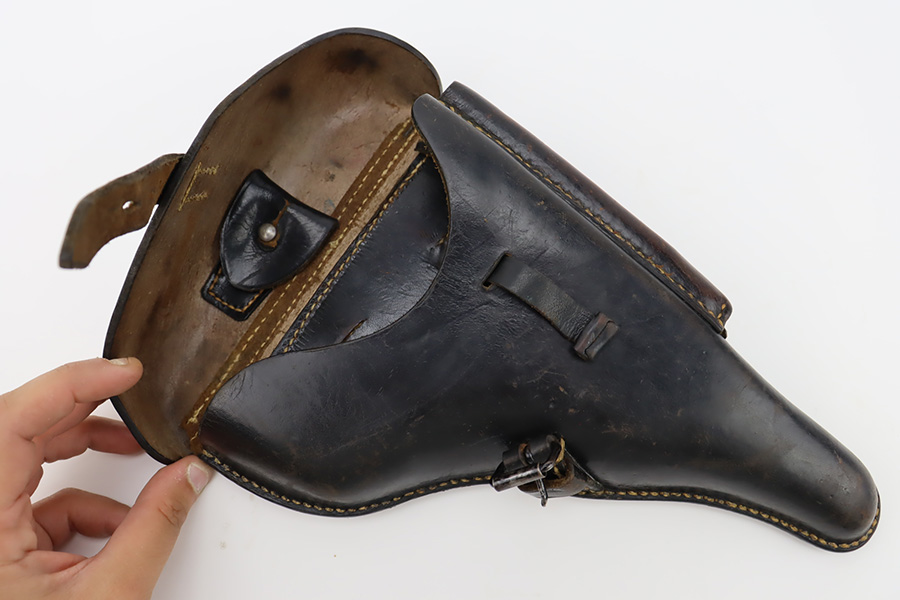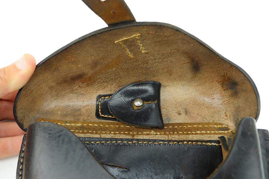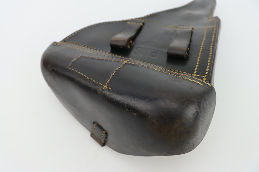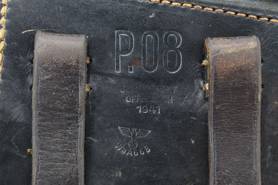 11/10/23 – This is a 1941 dated Luger holster from WW2. The holster is in great overall condition with all original leather and stitching intact. The holster is stamped on the back leather with a maker stamp, which is faint and hard to read, but from what we can see the marking is by Jean Weipert. The holster is also P.08 designation stamped, date stamped, and military proof stamped. The leather has mild pliability and clean interior. Some minor exterior scuffs but no major issues.