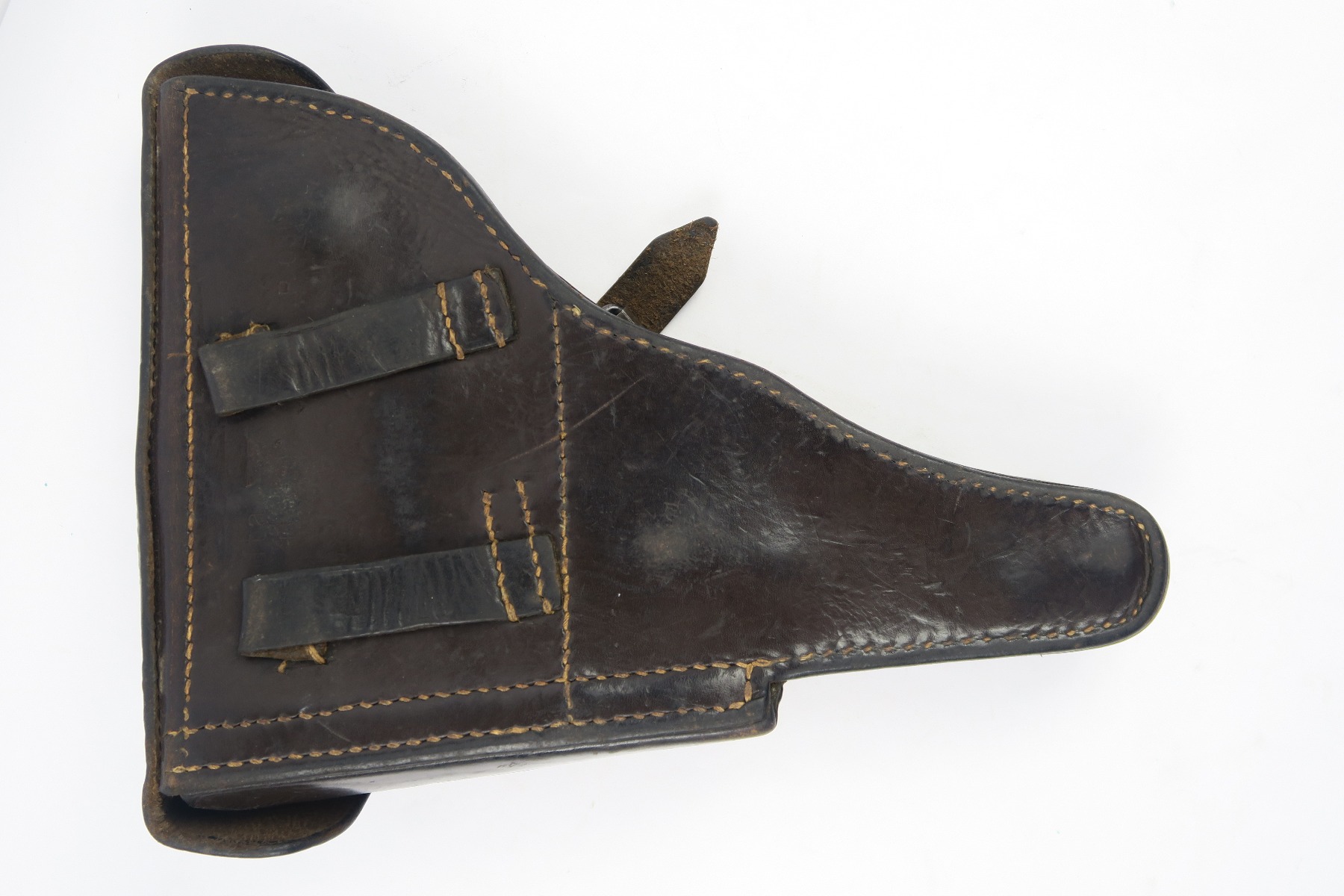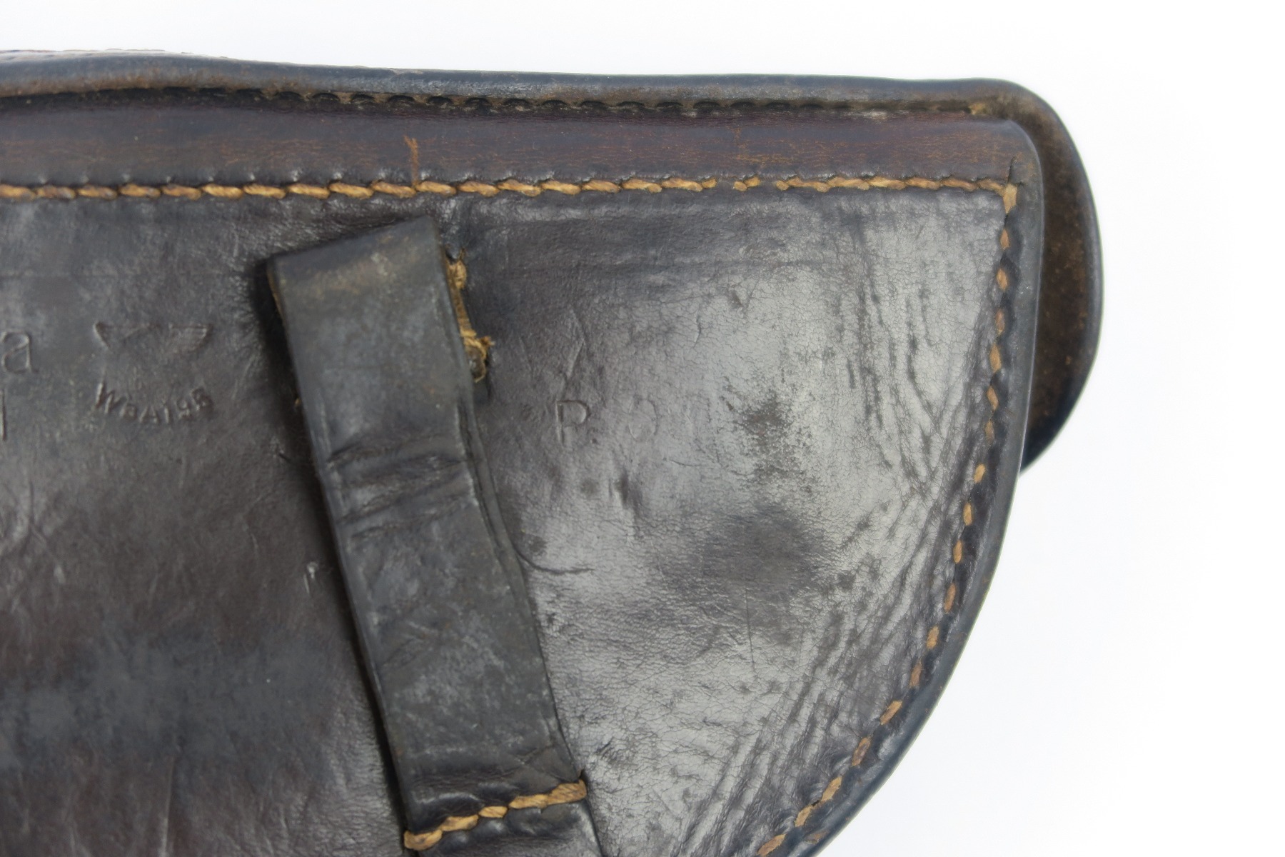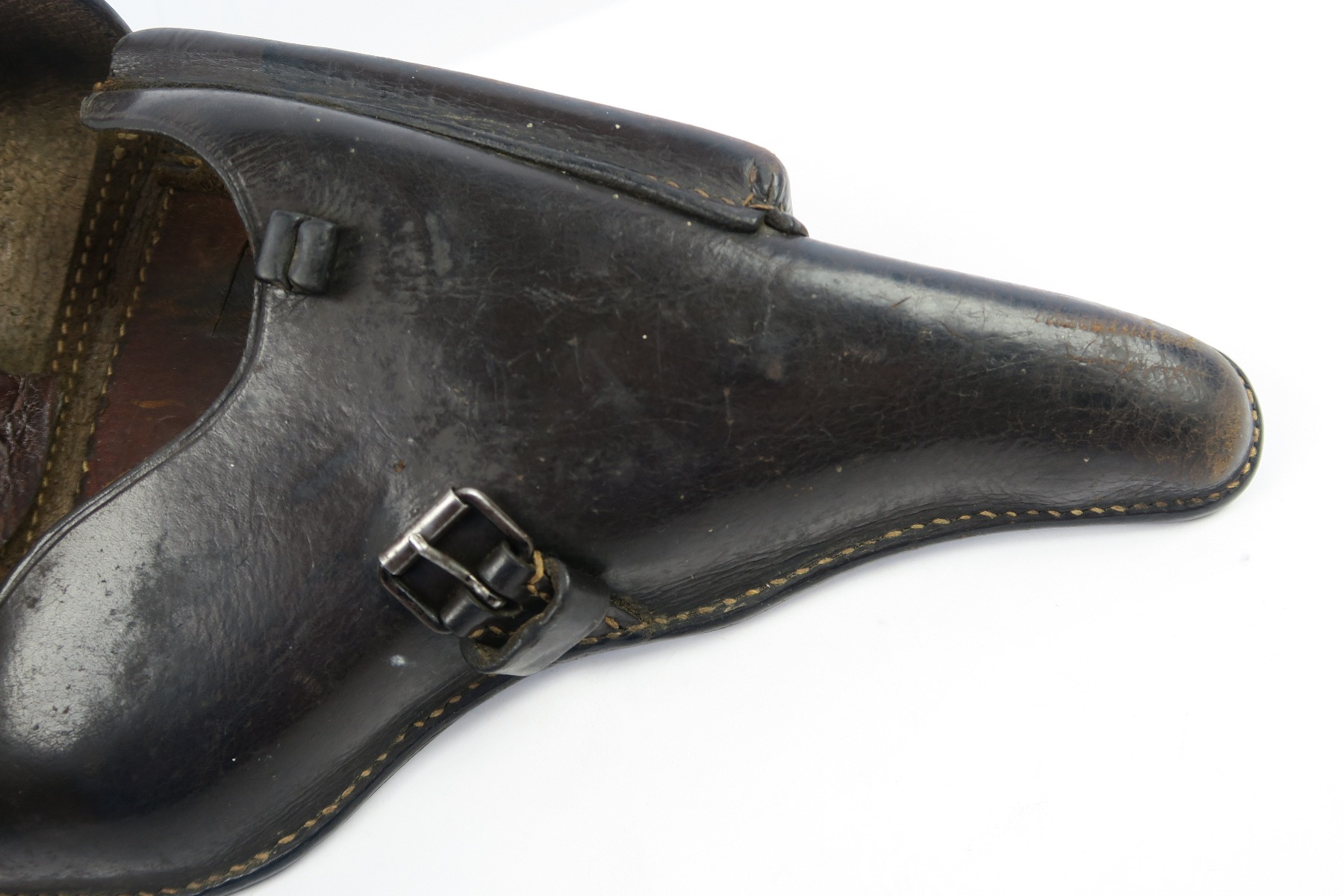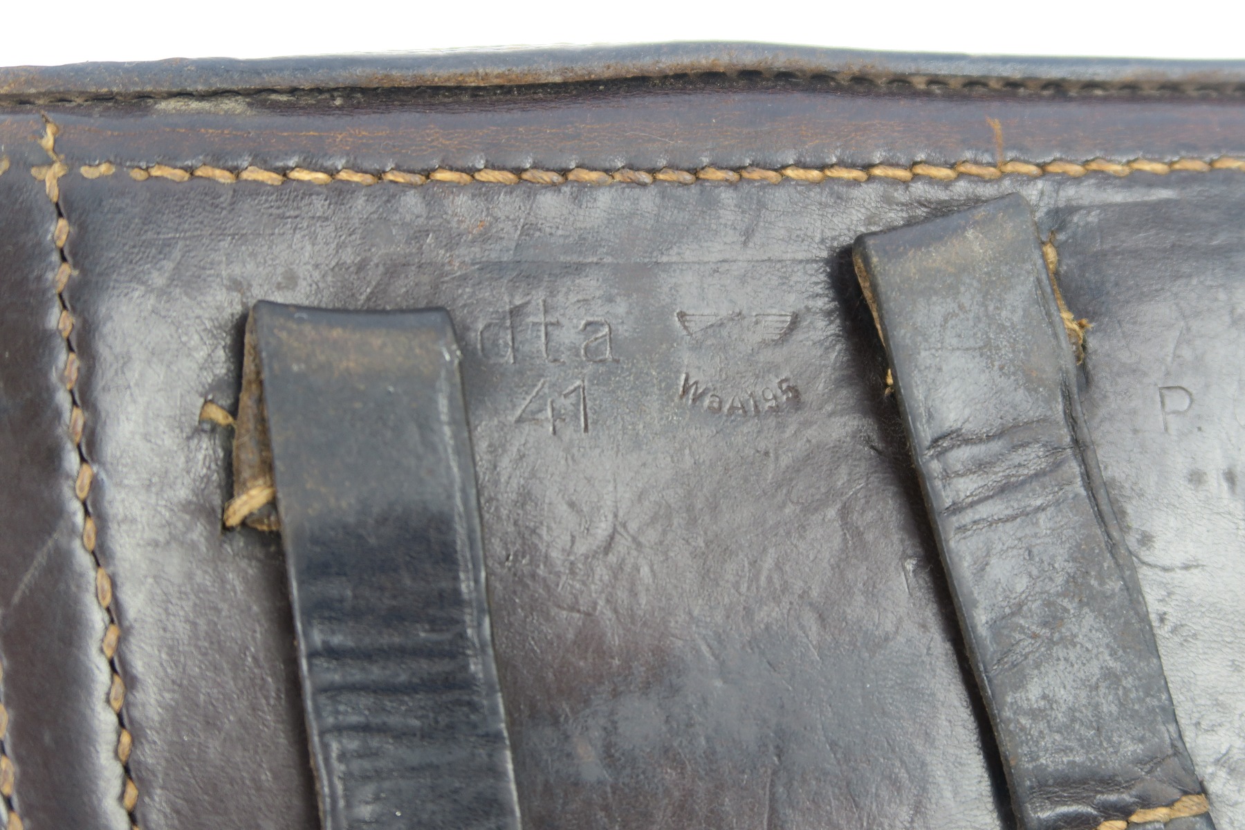 2/19/18 – This is an original 1941 dated Luger holster from WW2. The exterior leather is a very dark chocolate brown (almost black). The interior leather is a lighter shade of brown. The leather is soft and pliable with some scuffing on the front toe, but overall the leather is in tact. Shows character and signs of use. The stitching is all original and in tact as well. The back of this holster is dta maker stamped with a 41 date and waffen eagle WaA195. Guaranteed original.