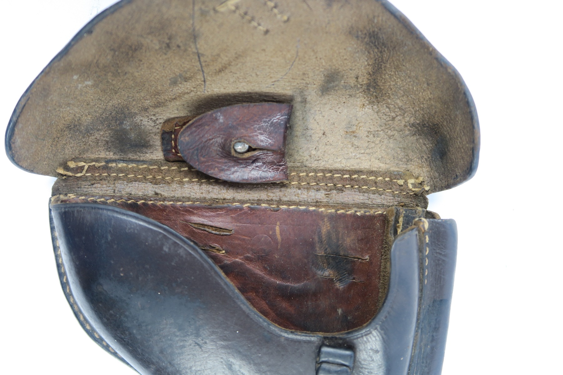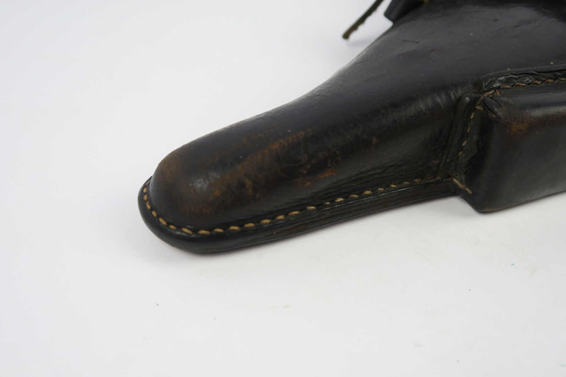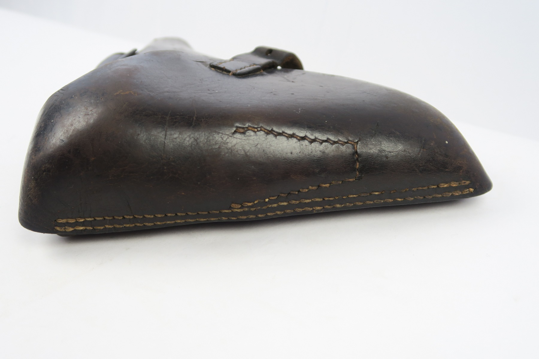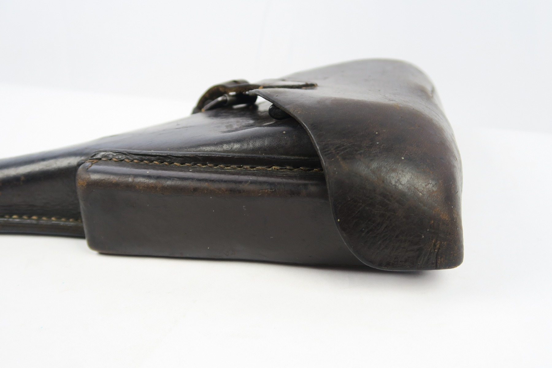 2/19/18 – This is an original 1941 dated Luger holster from WW2. The exterior leather is a very dark chocolate brown (almost black). The interior leather is a lighter shade of brown. The leather is soft and pliable with some scuffing on the front toe, but overall the leather is in tact. Shows character and signs of use. The stitching is all original and in tact as well. The back of this holster is dta maker stamped with a 41 date and waffen eagle WaA195. Guaranteed original.