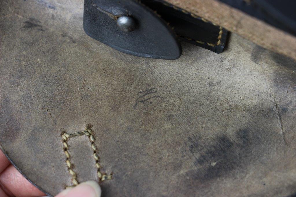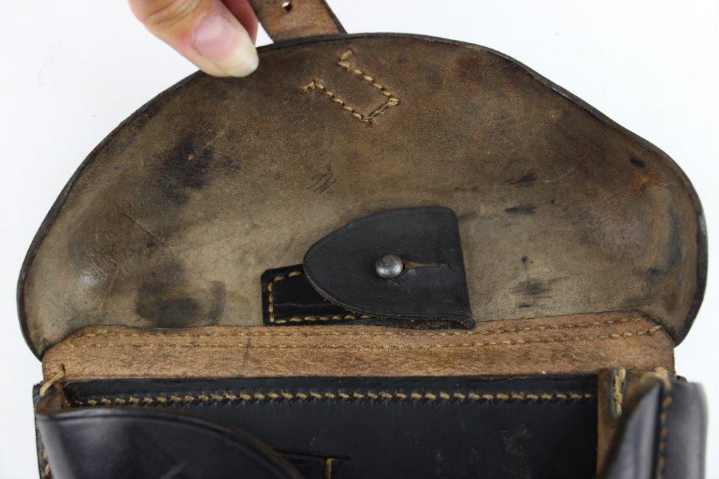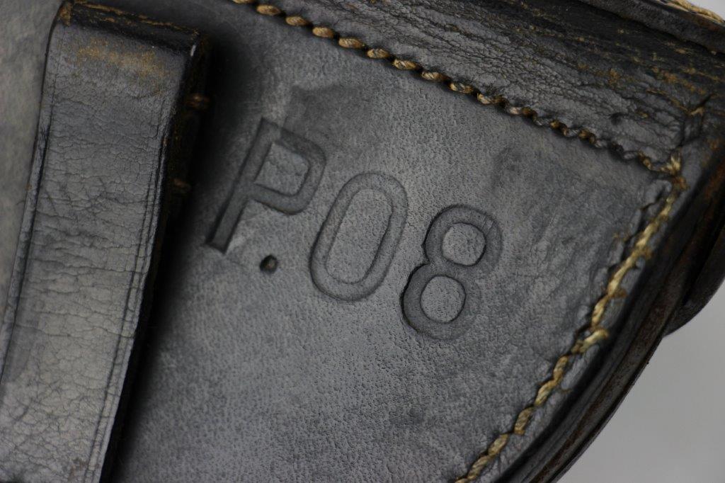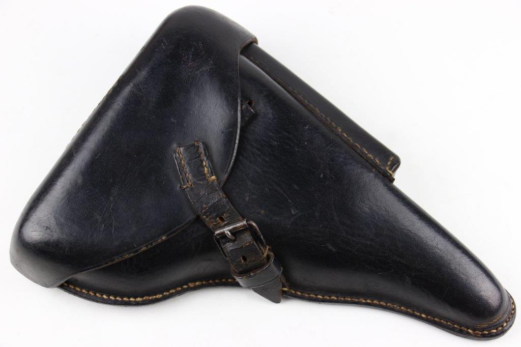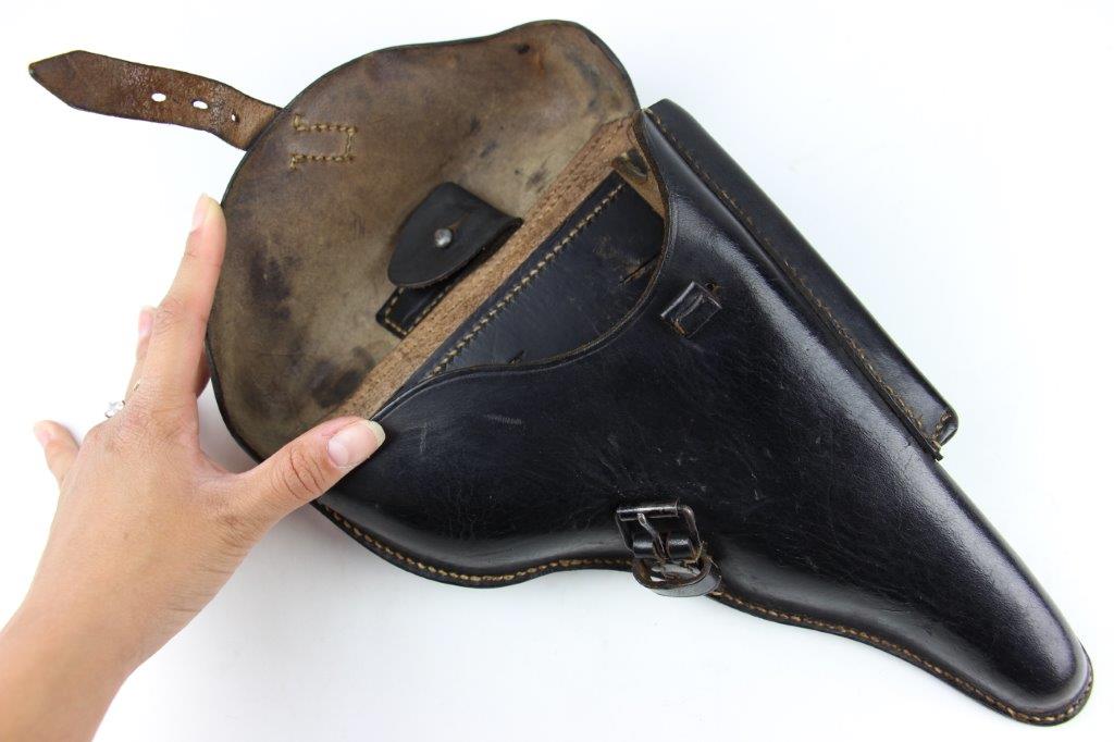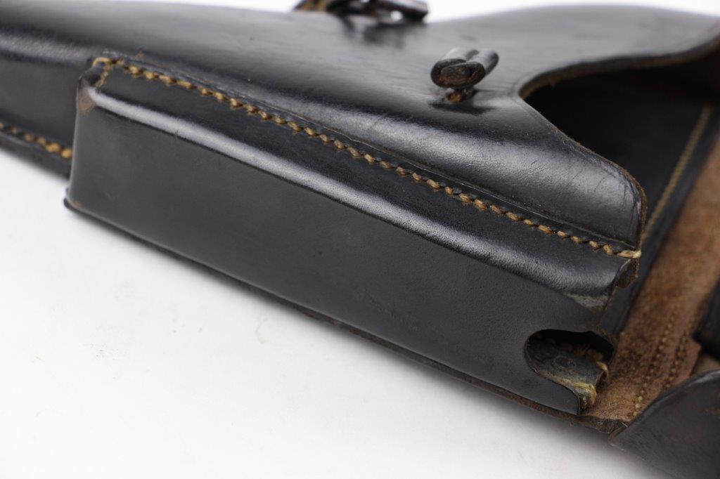 8/12/24 – This is an original 1941 dated Luger holster from WW2. The holster is in great condition, near excellent overall except for some surface cracking on the closure strap. Despite this, the strap is still structurally sound and intact, as the cracks do not go deep into the leather. The rest of the black leather is clean with normal pliability and mild surface wrinkling but no major flaws. Clean interior leather as well. The back leather is strongly struck with a crisp maker code, date stamp, P.08 designation stamp, and a waffen military proof stamp. Excellent, tight and original straw colored stitching throughout. These are desirable examples as they were made toward the end of Luger production during WW2, and dare often found paired with Black Widow Lugers.