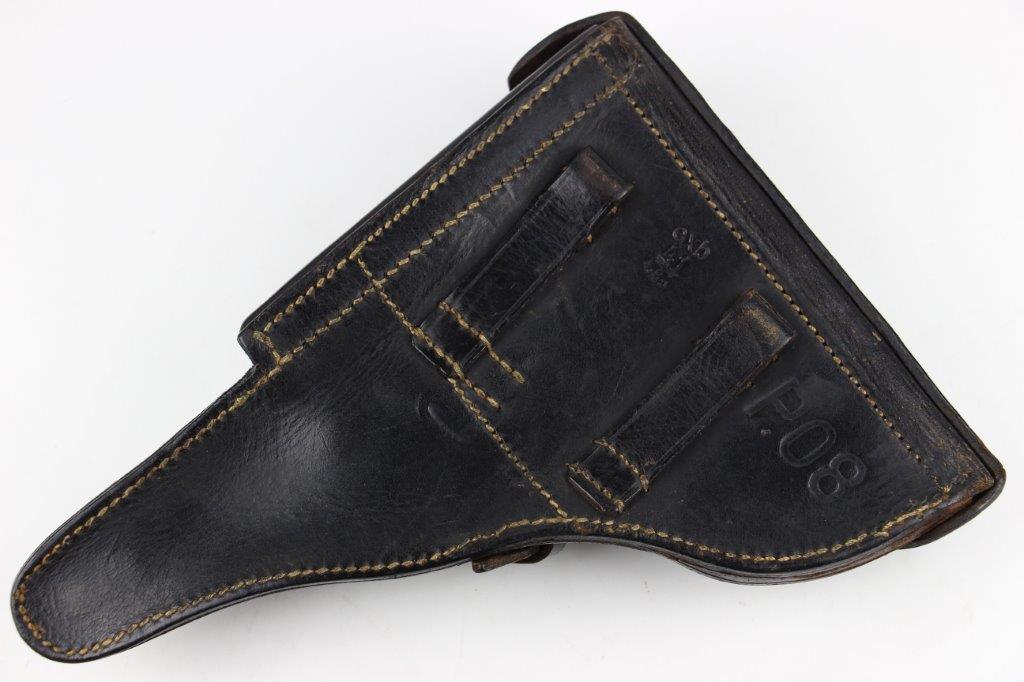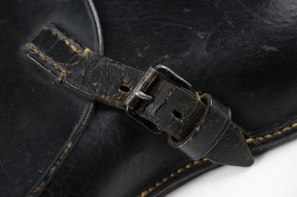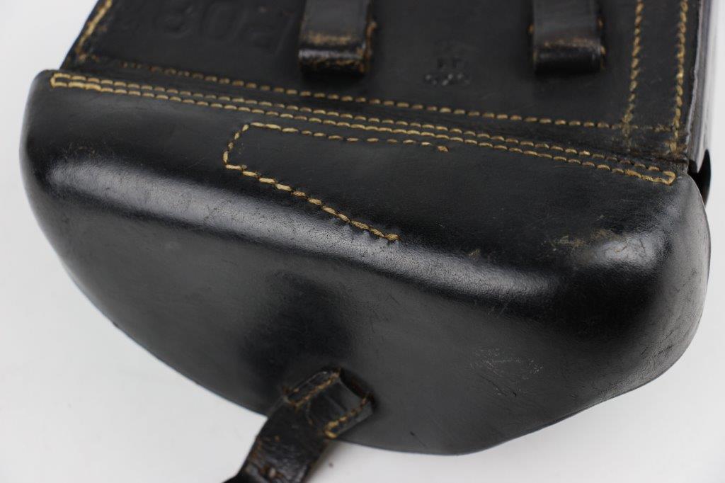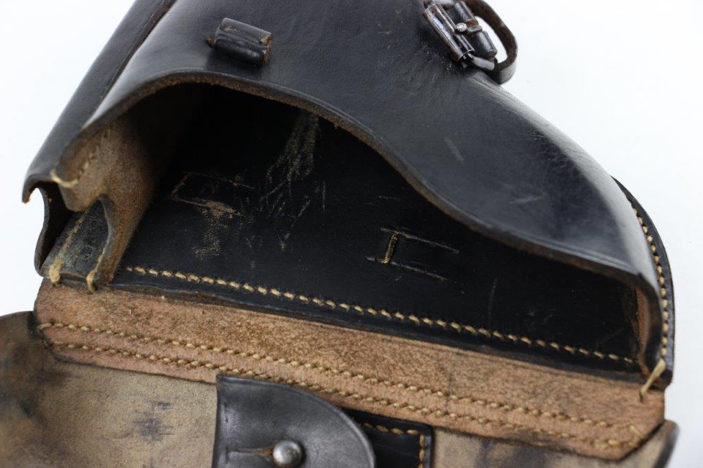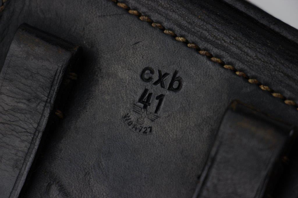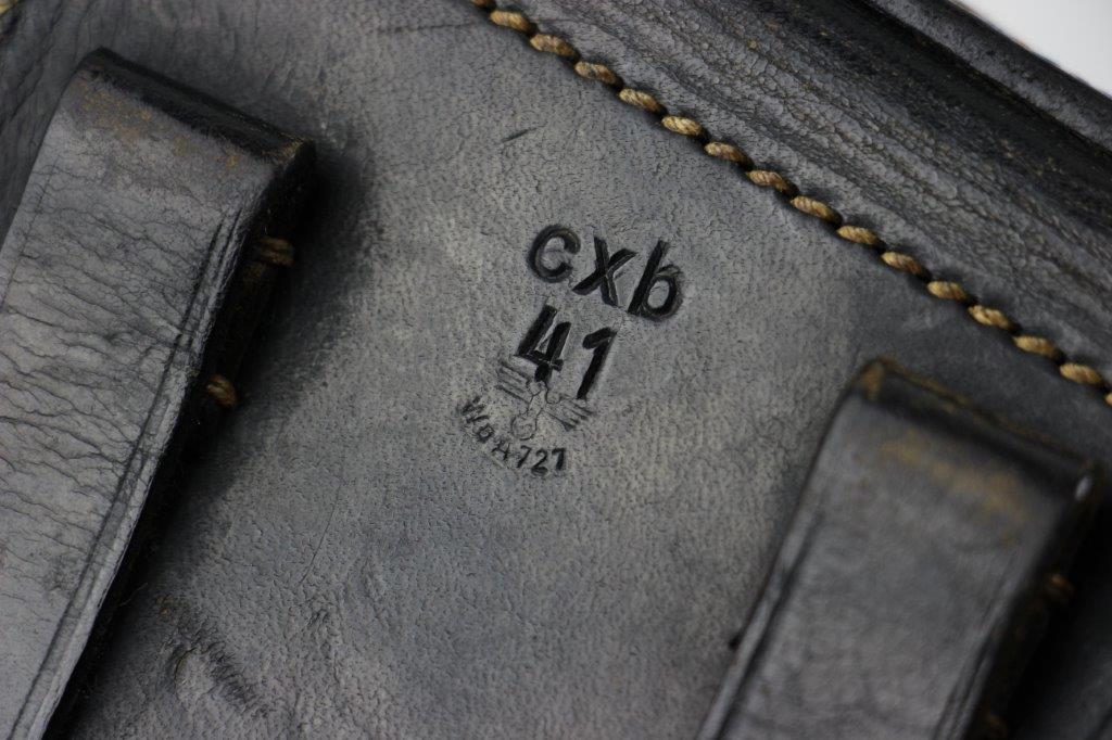 8/12/24 – This is an original 1941 dated Luger holster from WW2. The holster is in great condition, near excellent overall except for some surface cracking on the closure strap. Despite this, the strap is still structurally sound and intact, as the cracks do not go deep into the leather. The rest of the black leather is clean with normal pliability and mild surface wrinkling but no major flaws. Clean interior leather as well. The back leather is strongly struck with a crisp maker code, date stamp, P.08 designation stamp, and a waffen military proof stamp. Excellent, tight and original straw colored stitching throughout. These are desirable examples as they were made toward the end of Luger production during WW2, and dare often found paired with Black Widow Lugers.